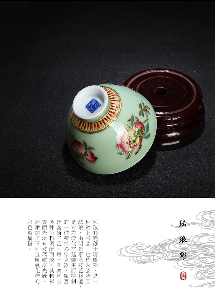 宝瓷林豆青珐琅彩多子多福鸡心盏