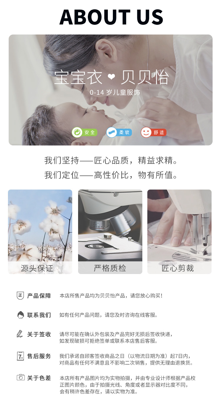 - 贝贝怡专注0-6岁婴幼儿服饰,坚持安全、柔软、舒适的产品理念,为千万中国家庭提供超高品质、安全可靠的婴幼儿服饰产品,妈妈放心,宝宝开心!