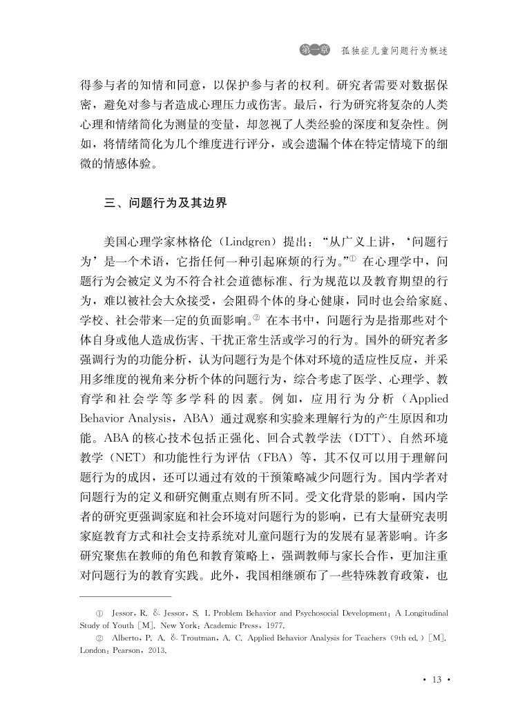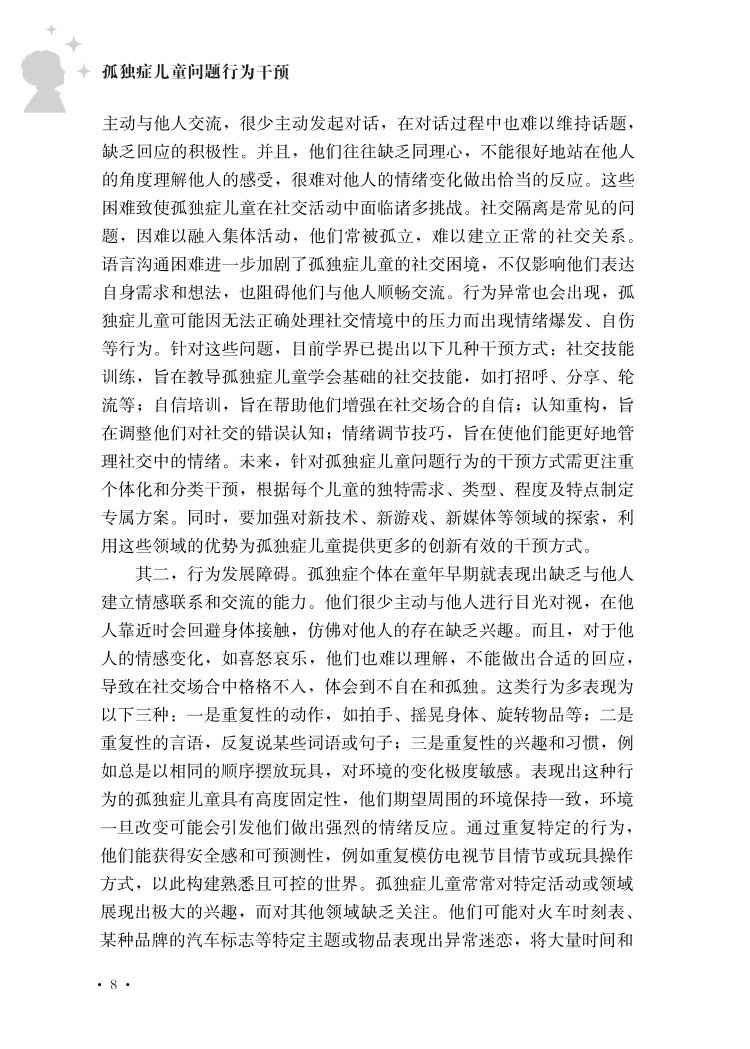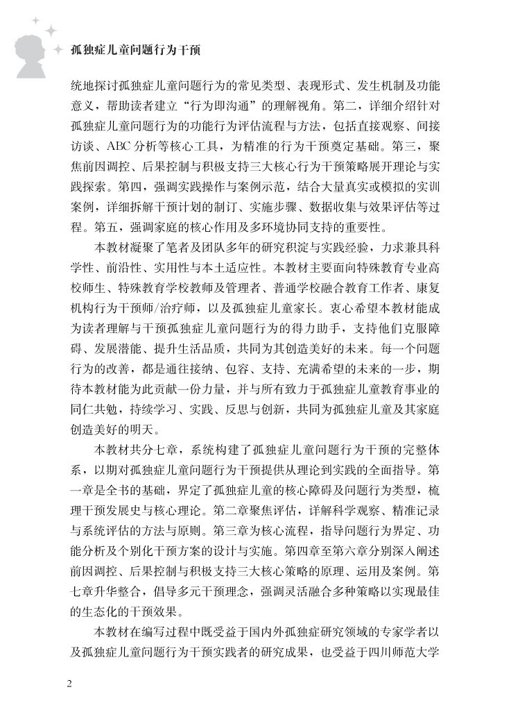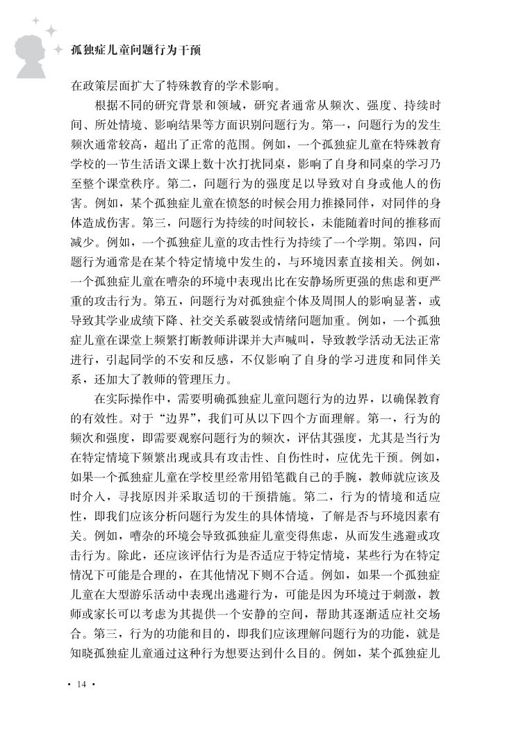《孤独症儿童问题行为干预》是一本针对孤独症儿童的问题行为进行干预研究的专业书籍。本书主要适用于孤独症儿童教育、学前教育、心理学等领域的专业人士,以及孤独症儿童的家长和监护人。本书全面系统地介绍了孤独症儿童问题行为的干预理论和实践,内容涵盖了孤独症儿童的问题行为干预的理论基础、实践经验和案例分析。书中包括了孤独症儿童的问题行为类型、成因分析、干预策略和方法等内容,旨在帮助读者更好地理解孤独症儿童的问题行为,并提供科学有效的干预方法,为相关领域的专业人士和家长提供重要的参考和指导。