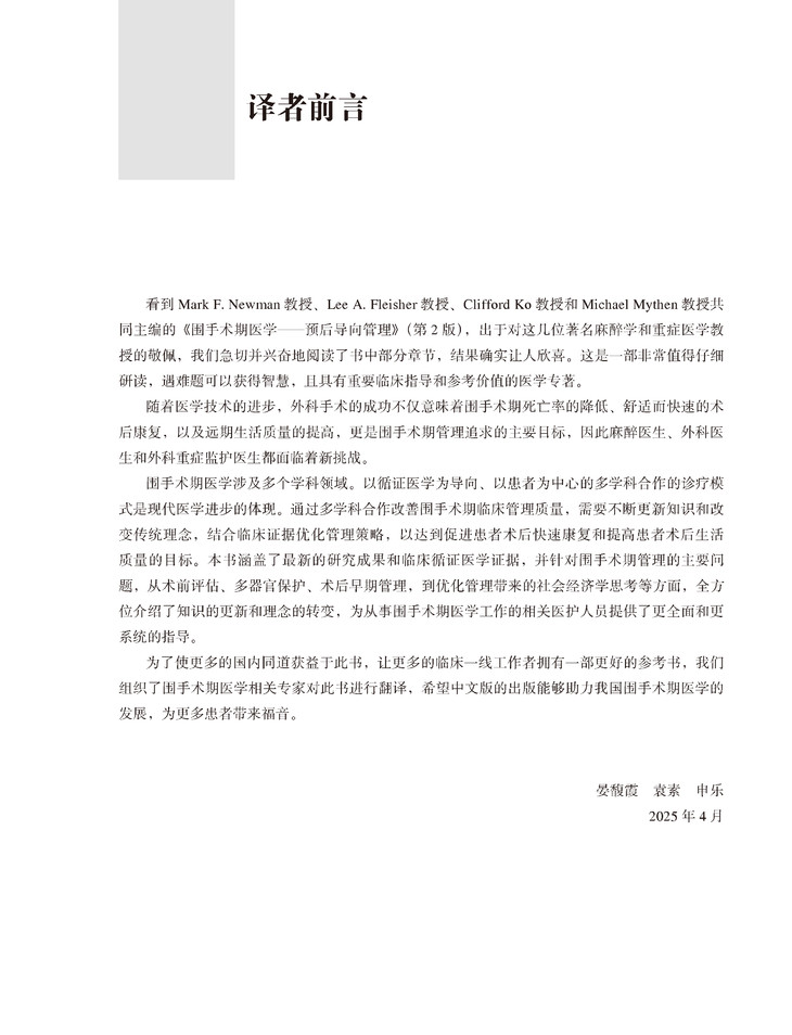 《围手术期医学》系统讲解了各类手术围手术期的最佳管理方法,自出版以来受到麻醉医生、外科医生的好评,目前已更新至第2版。本书基于最新的证据和最佳实践,由世界公认的麻醉学和外科重症监护领域权威专家编写,是一部易于遵循的权威指南,指导医生实现围手术期管理的最佳结果。新版《围手术期医学》进行了全面更新,可帮助读者批判性地思考围绕手术患者护理的复杂、长期问题,提供决策、策略以提高医疗结果。专注于麻醉师,外科医生和重症监护医生需要了解的内容,以便通过基于证据和结果的方法改善结果。就所有主要器官系统的潜在风险、特定器官功能障碍的病因、术前和术中危险因素以及围手术期保护策略提供实用指导,以尽量减少潜在的并发症。