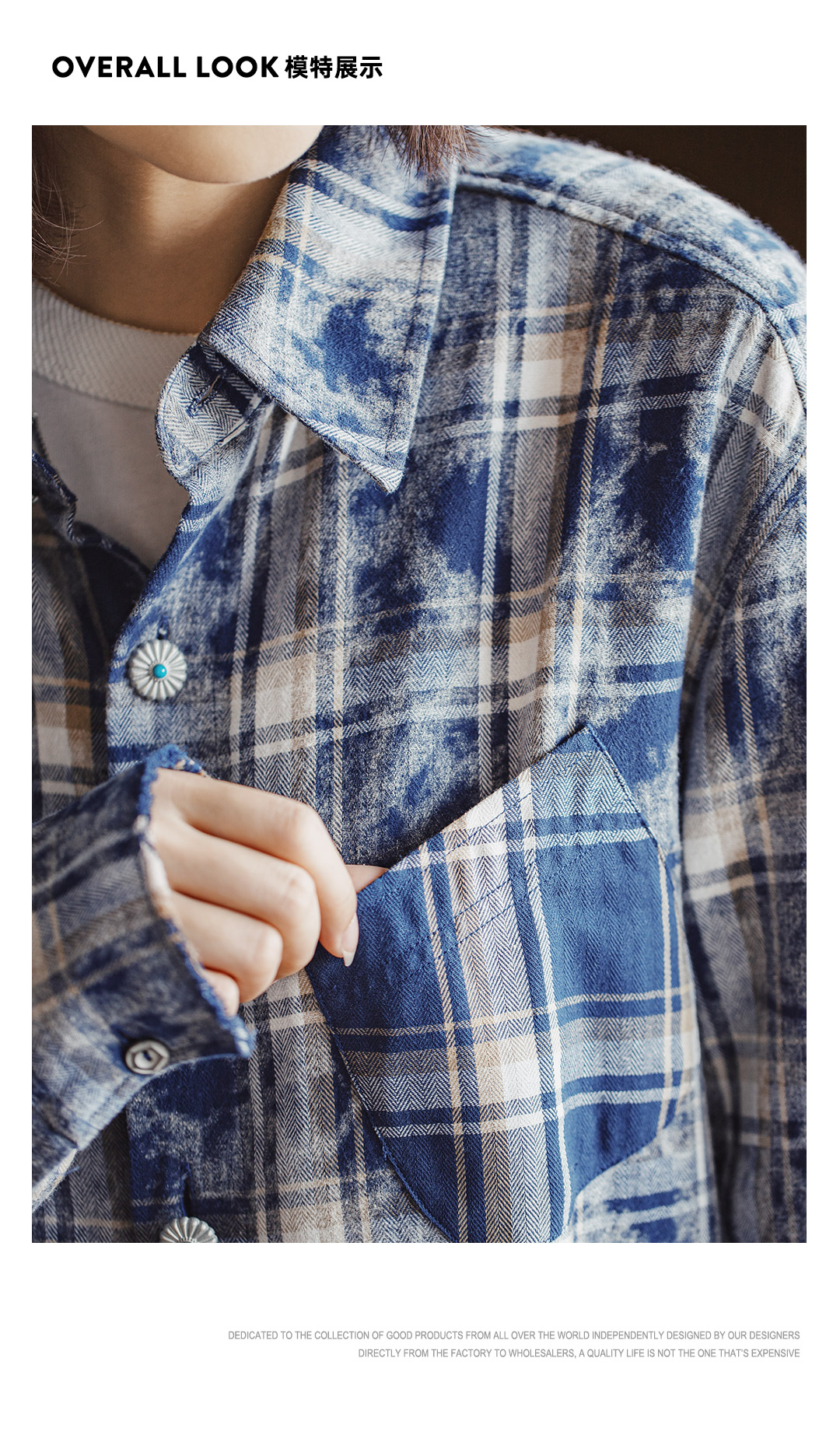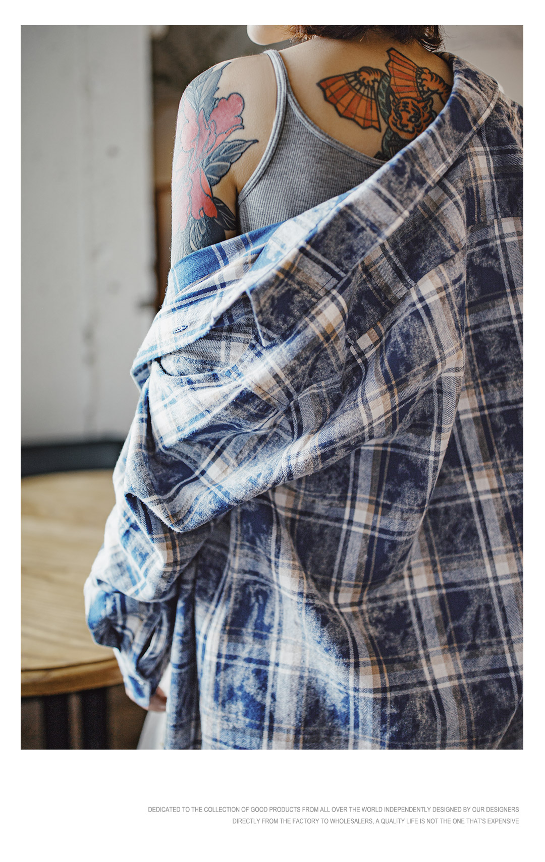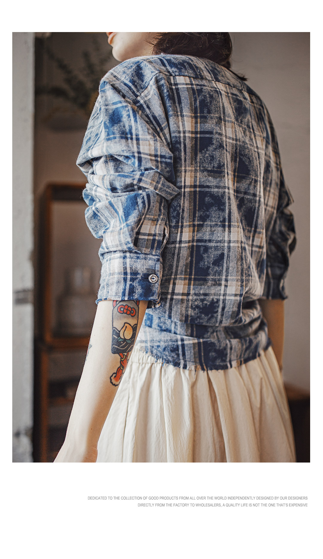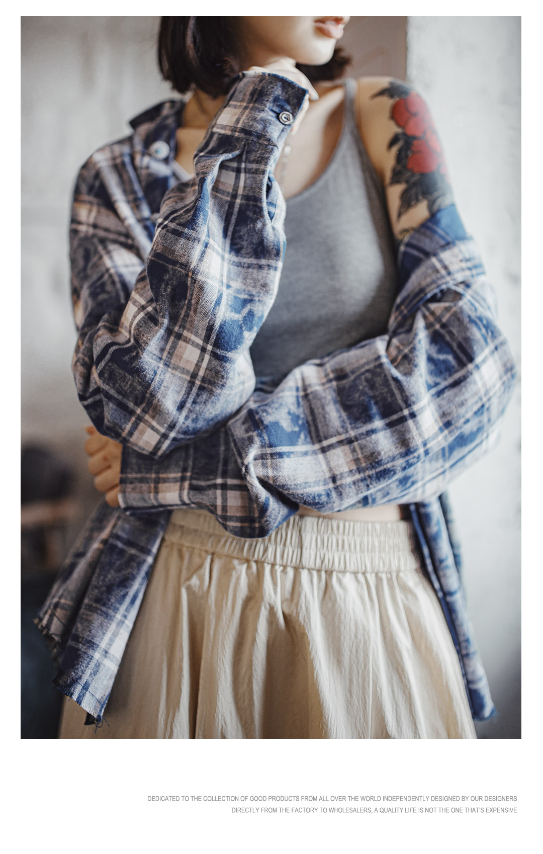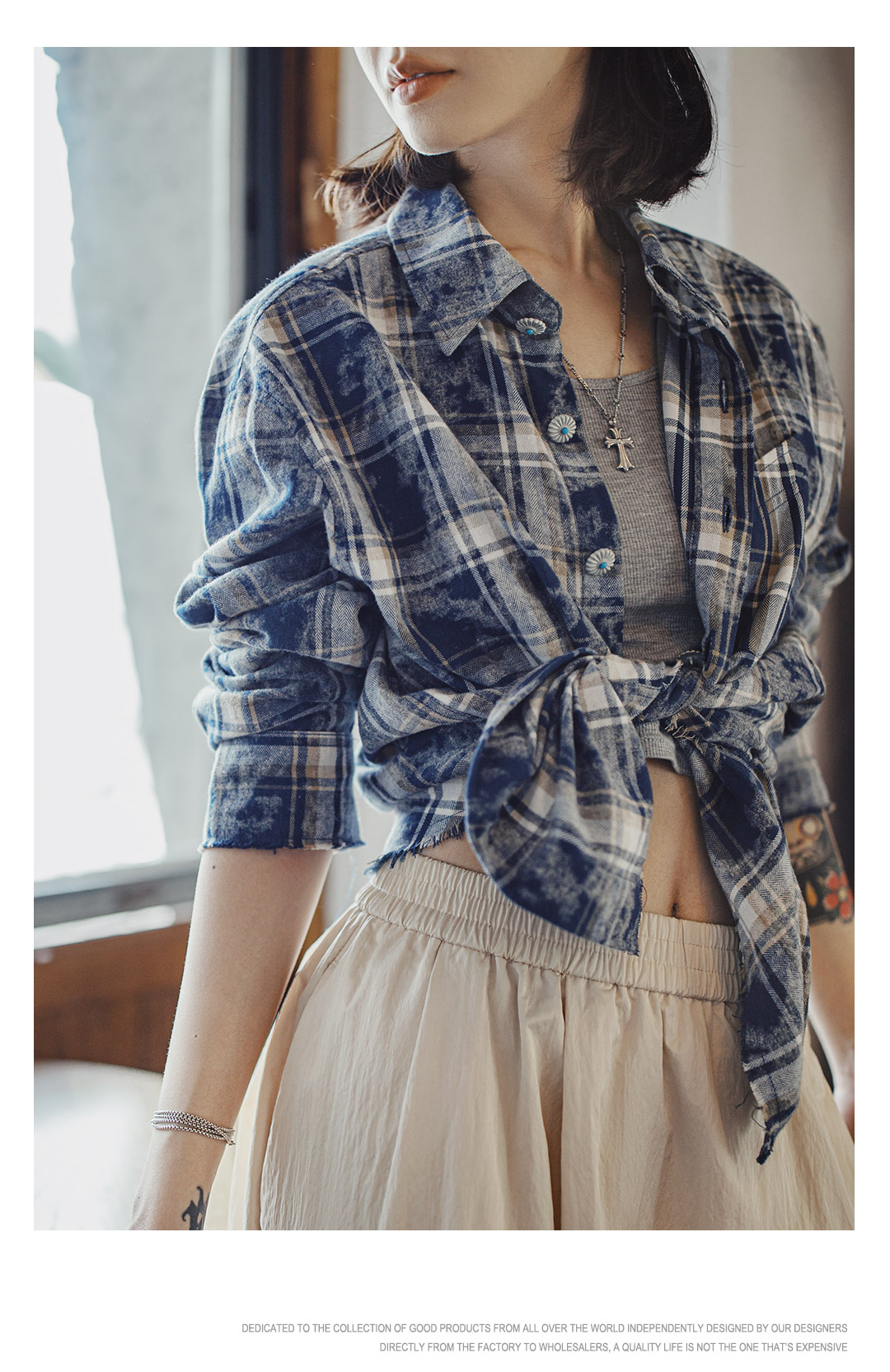 马登美式复古藏青色格子纹翻领宽松磨毛长袖休闲衬衫上衣外套女秋
