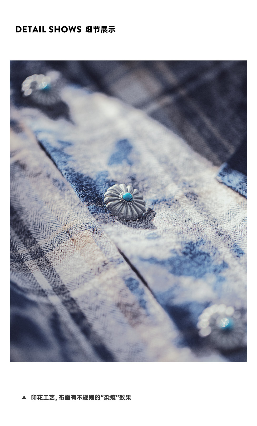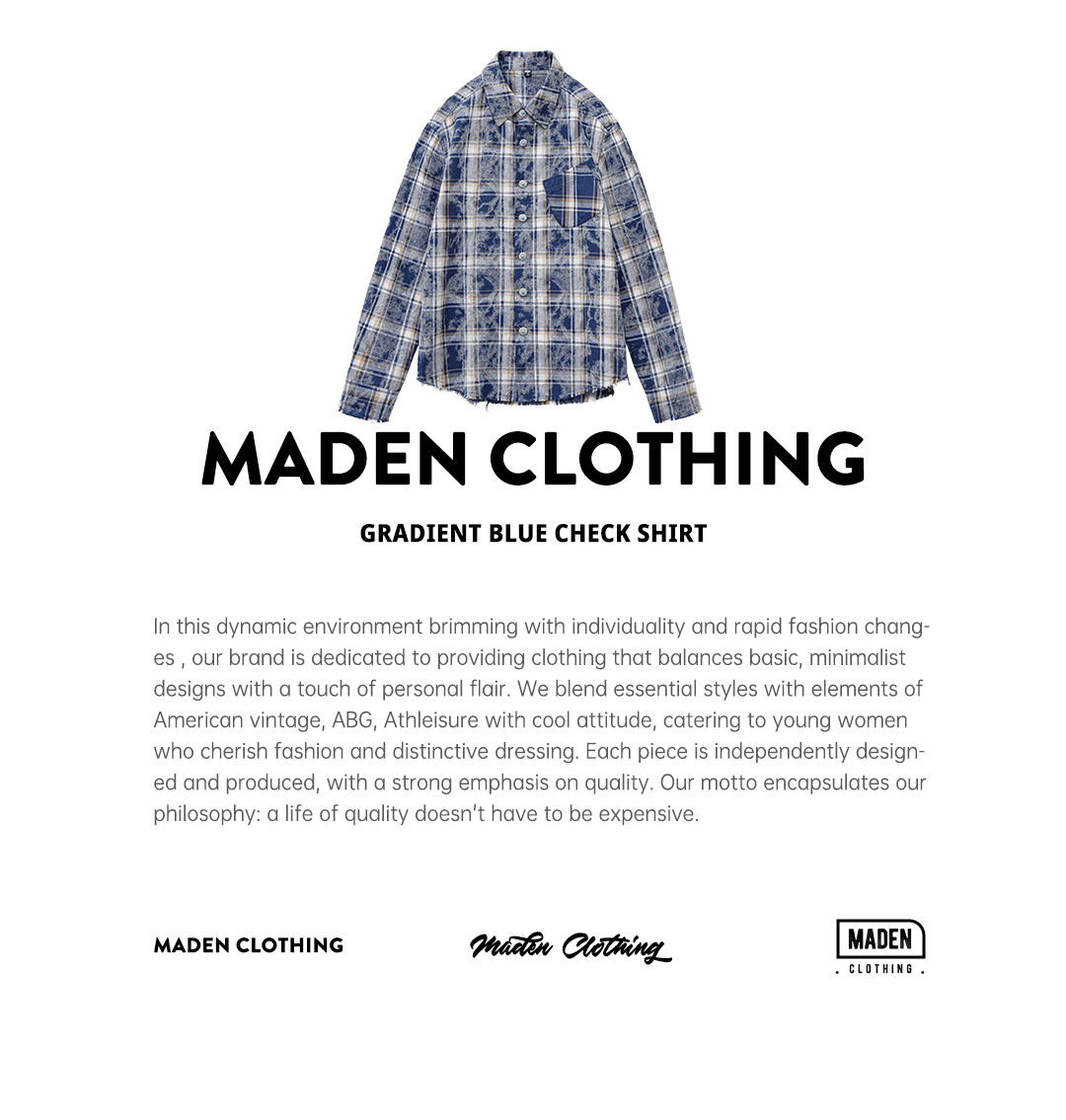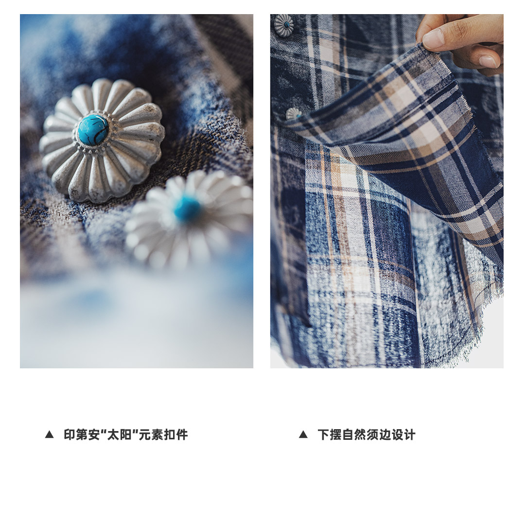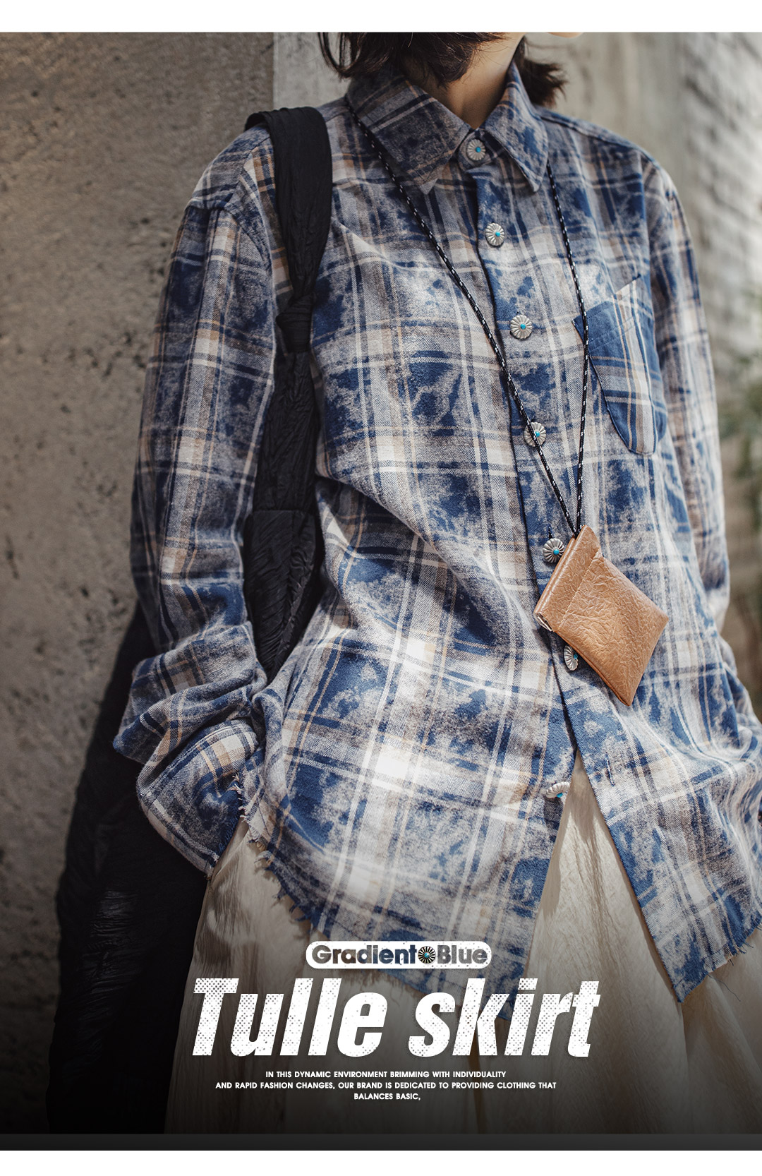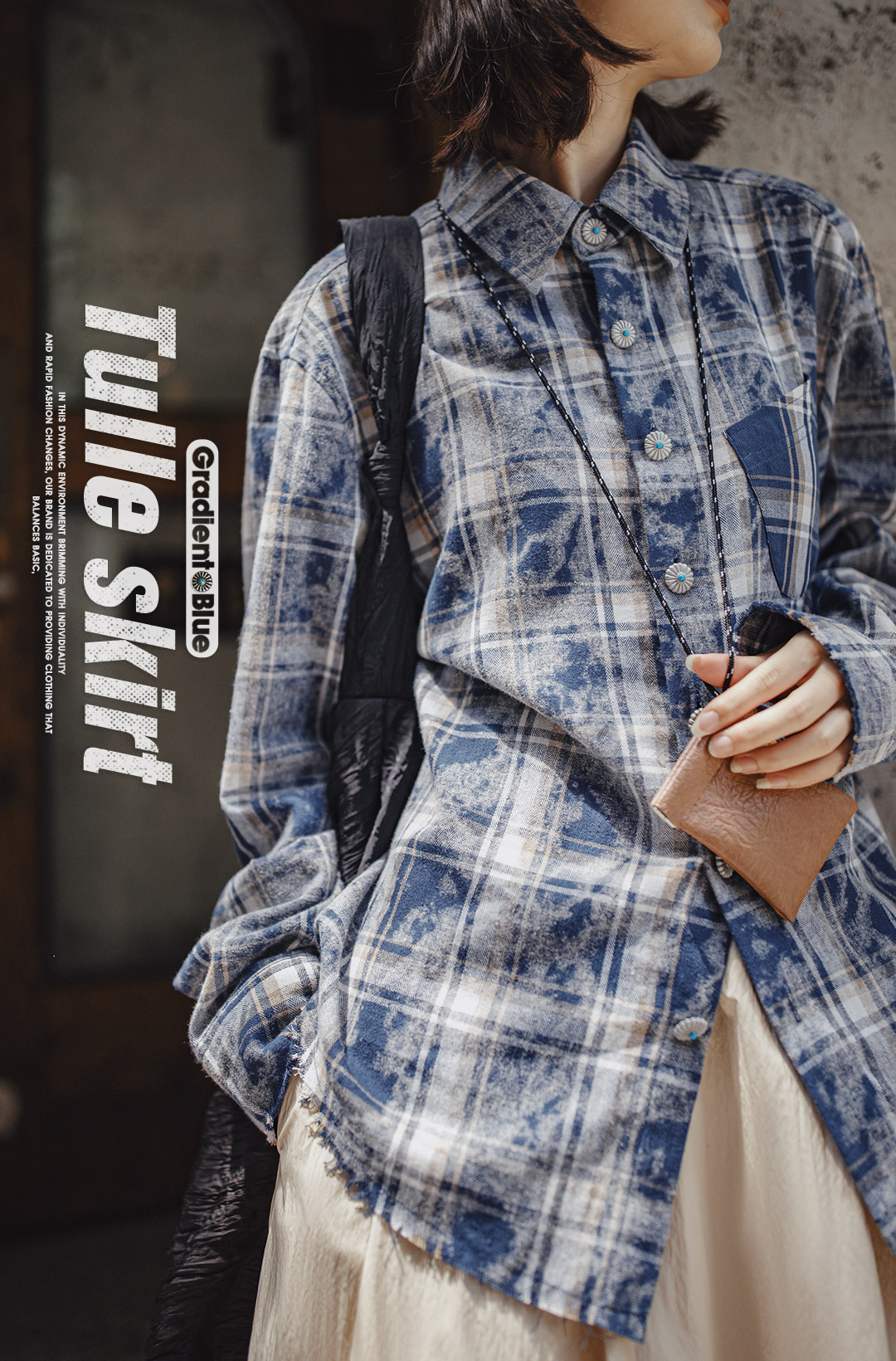 马登美式复古藏青色格子纹翻领宽松磨毛长袖休闲衬衫上衣外套女秋