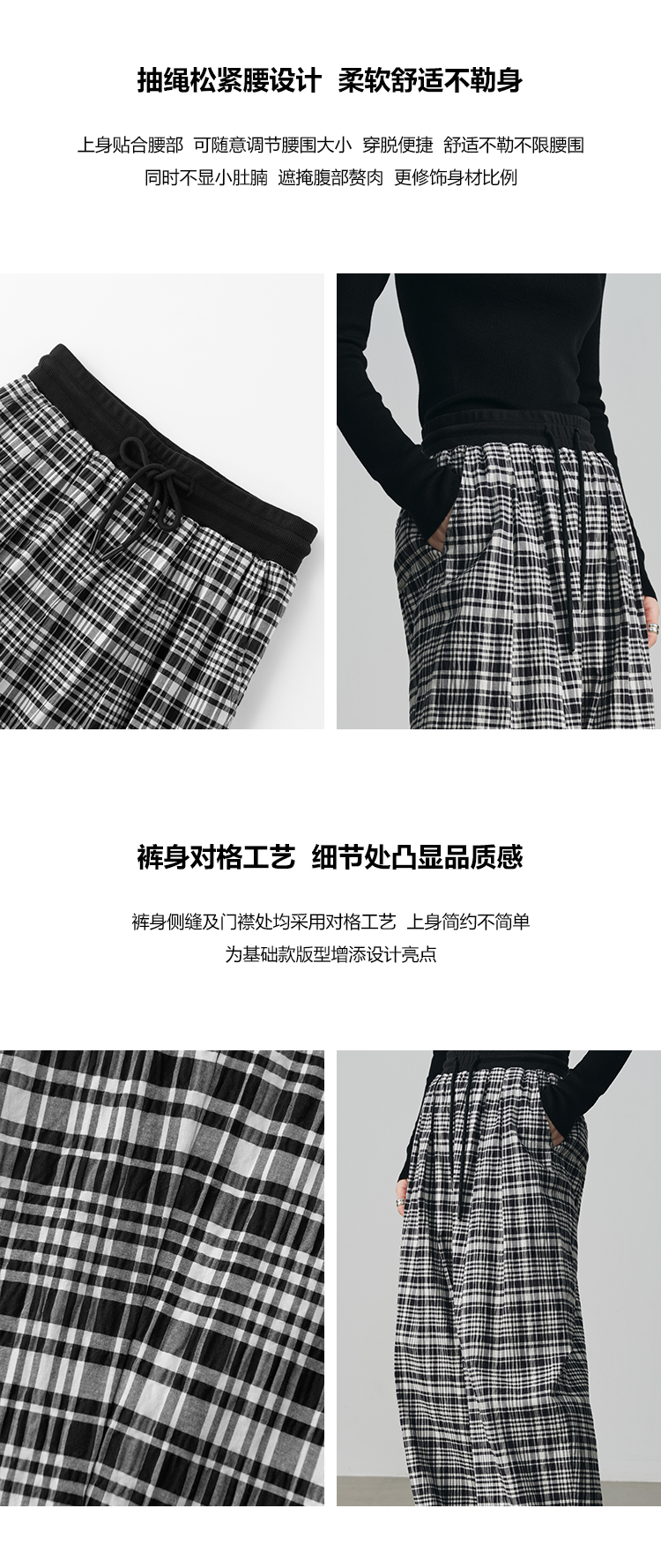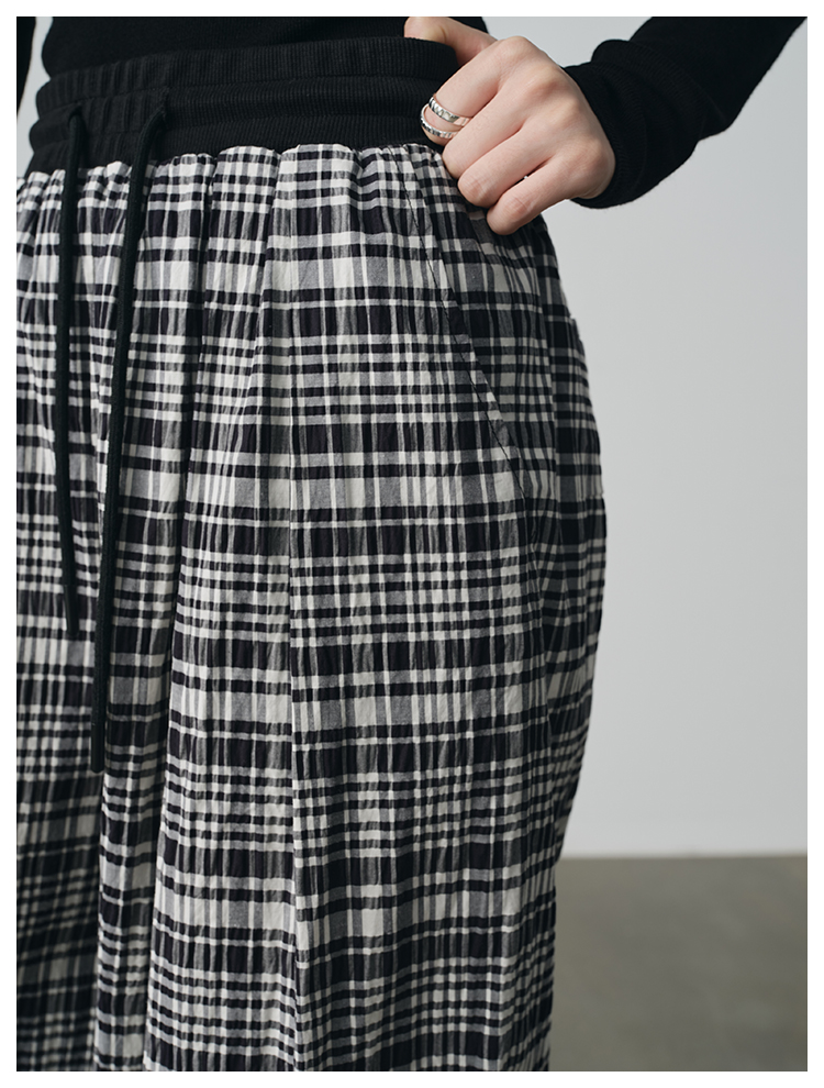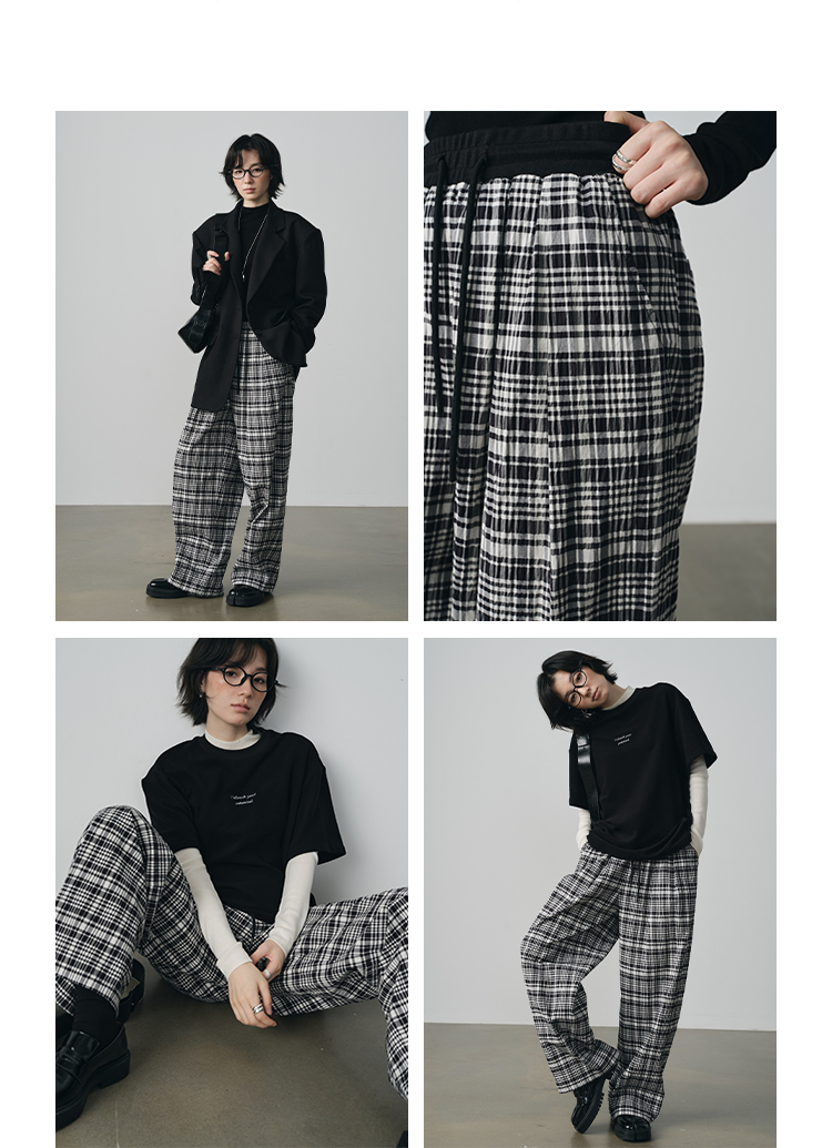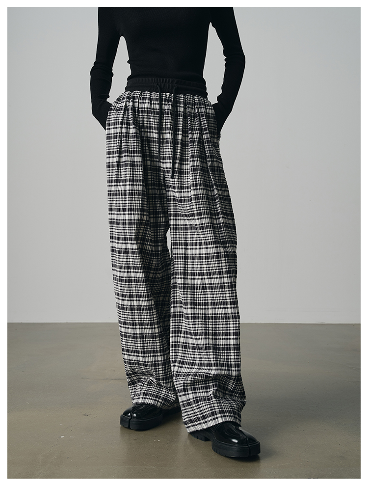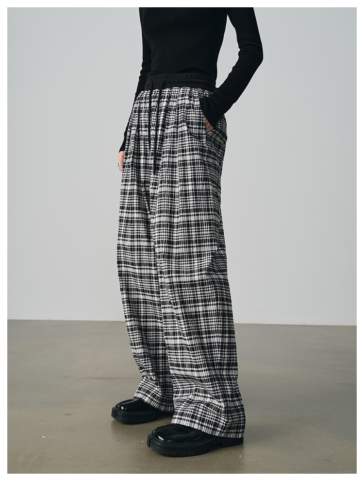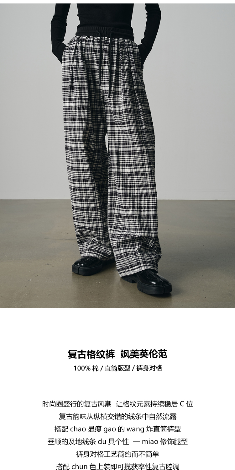 UMILAB【法兰西】100%棉盐缩肌理感 松紧腰抗皱直筒格纹裤P1192H