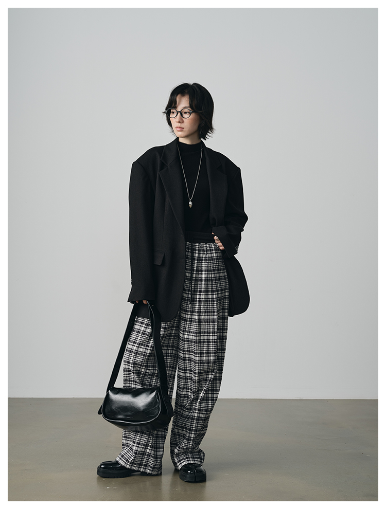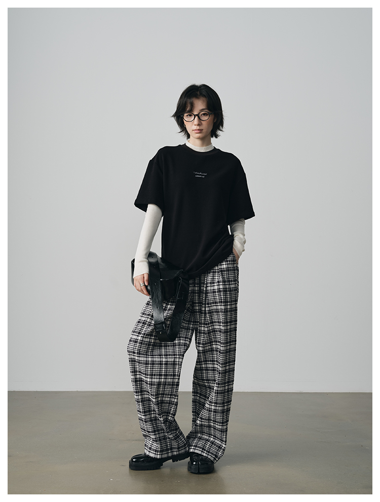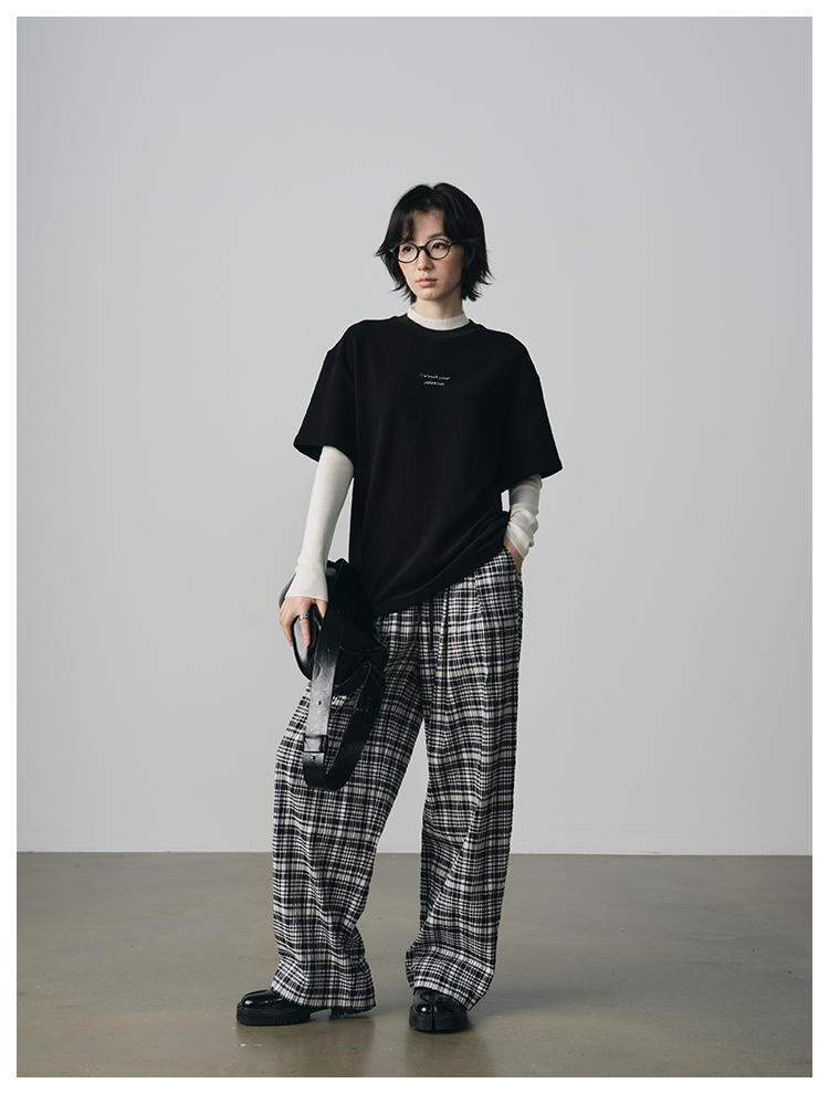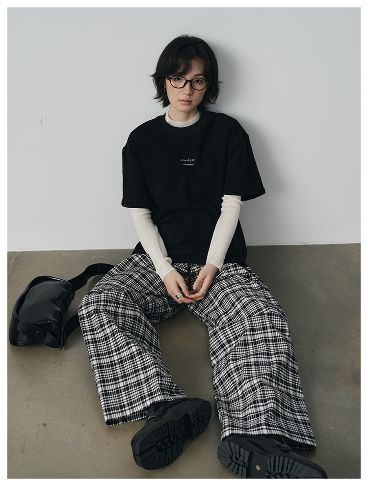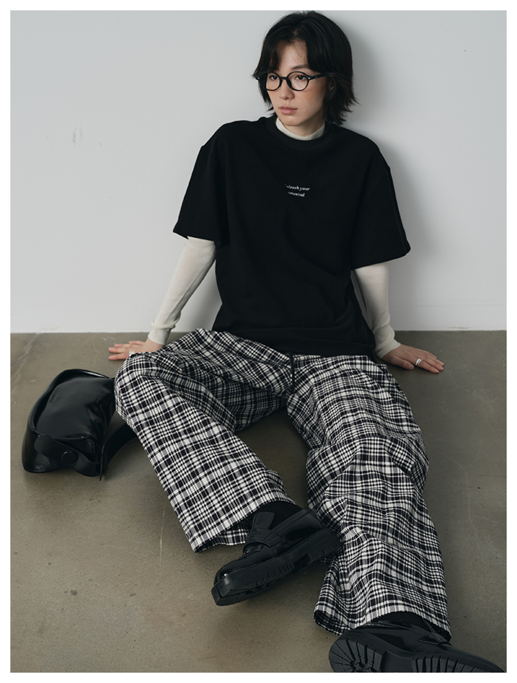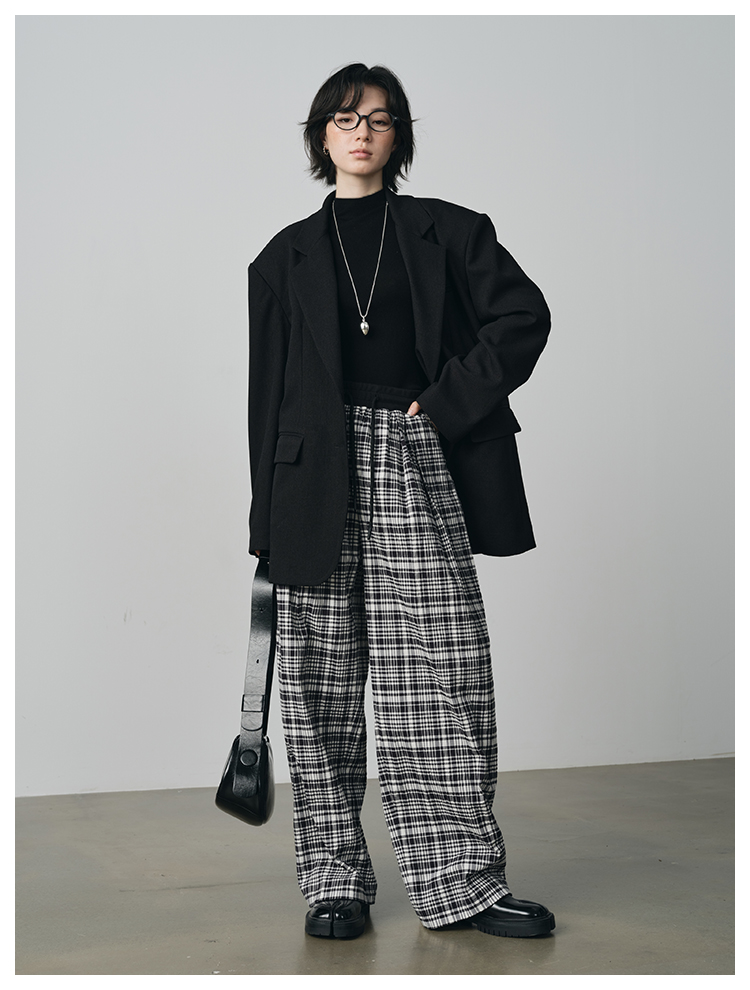 UMILAB【法兰西】100%棉盐缩肌理感 松紧腰抗皱直筒格纹裤P1192H