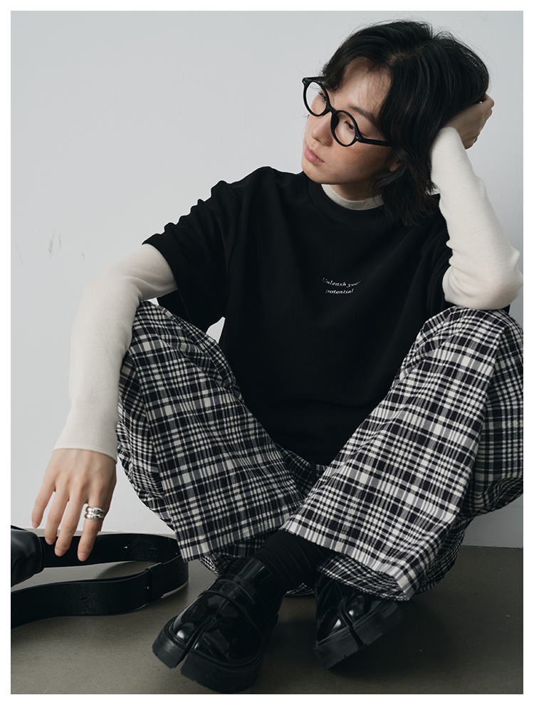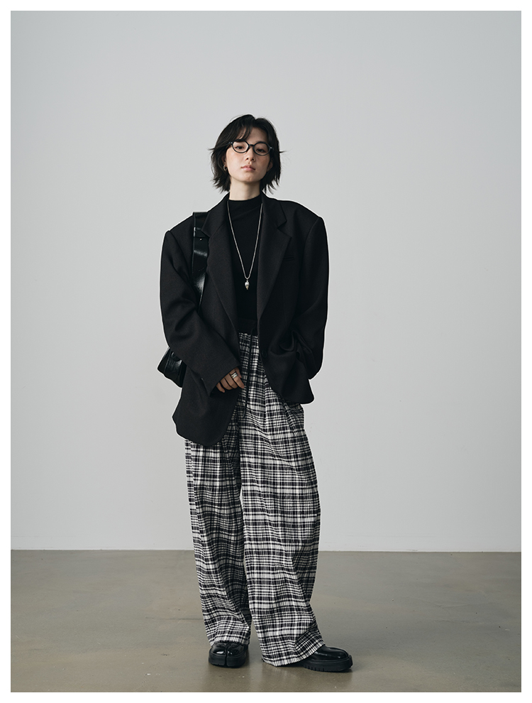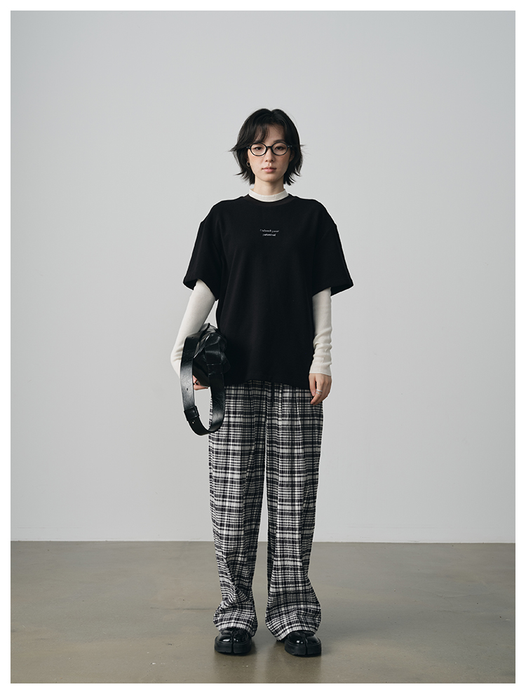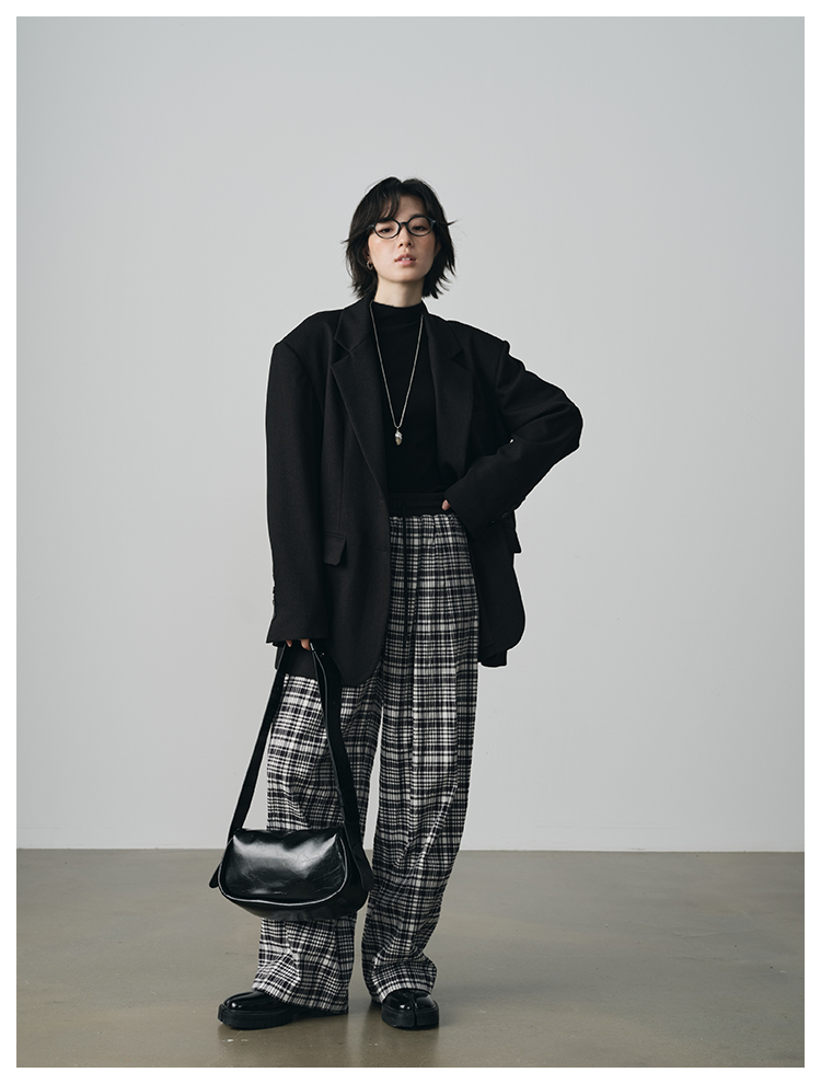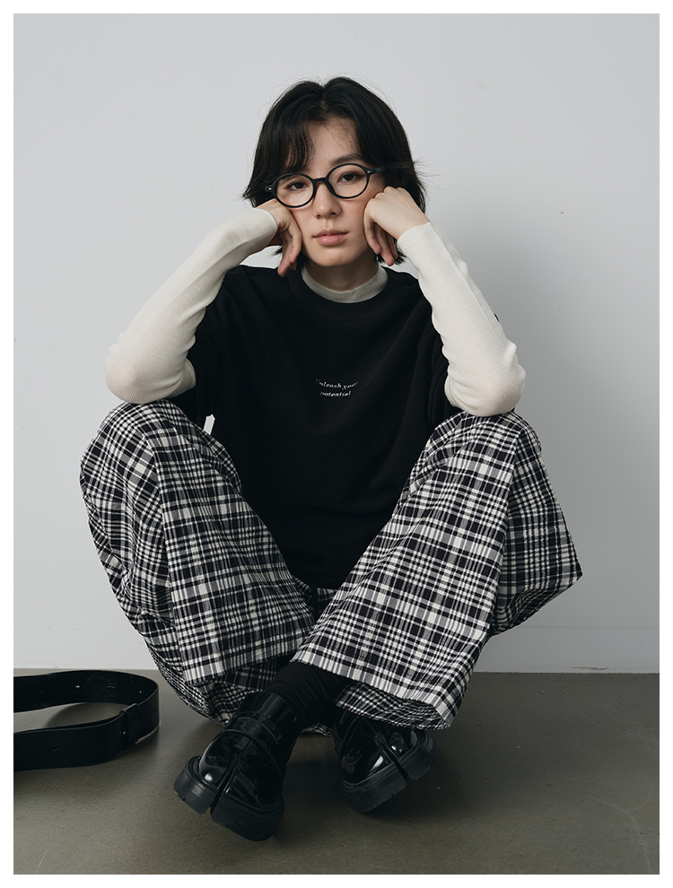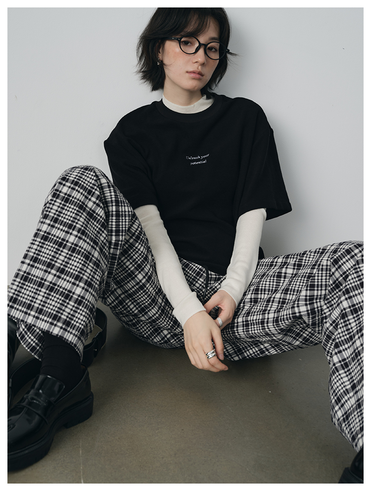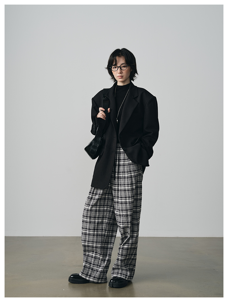 UMILAB【法兰西】100%棉盐缩肌理感 松紧腰抗皱直筒格纹裤P1192H