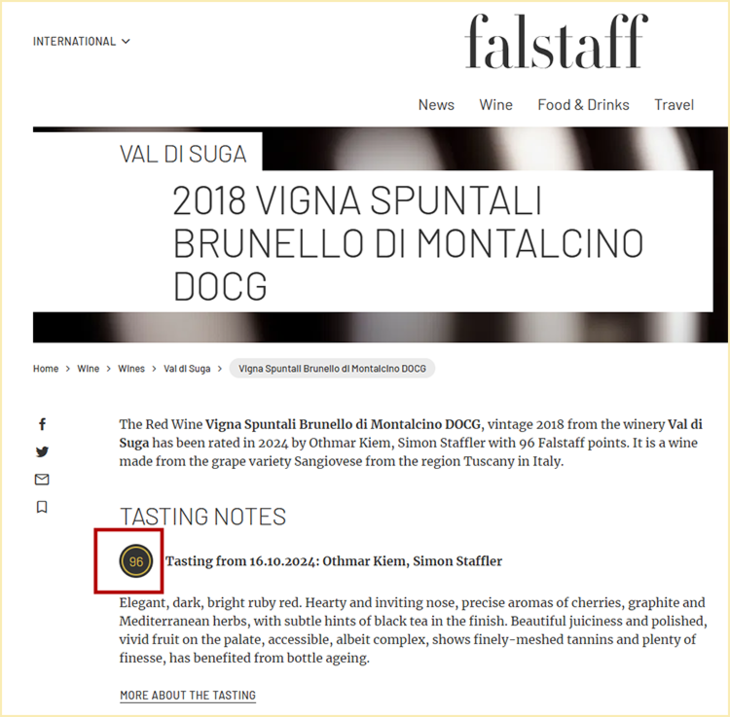 FA96高分!苏嘉山谷鹏达园布鲁奈罗红葡萄酒Val di Suga Vigna Spuntali Brunello di Montalcino 2018