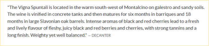 “Vigna Spuntali位于蒙塔奇诺温暖的西南部,土壤为Galestro和沙土。葡萄酒在混凝土罐中发酵,橡木桶中陈酿6个月,并在大斯拉夫尼亚橡木桶中陈酿18个月。强烈的黑色、红樱桃香气,带来新鲜活泼的口感,肉质的黑色、红色浆果和樱桃,单宁强劲,余味悠长,沉重但平衡极佳。”