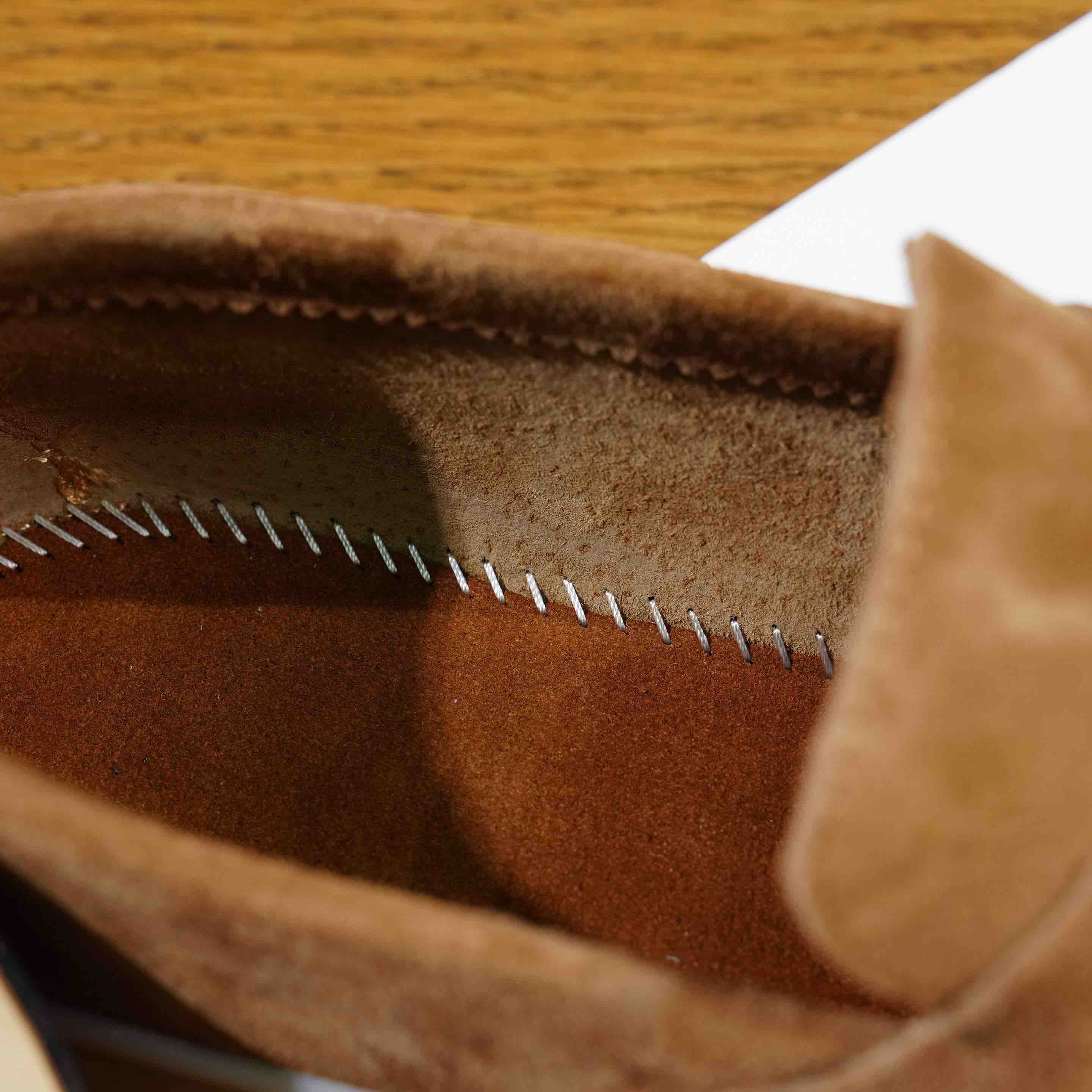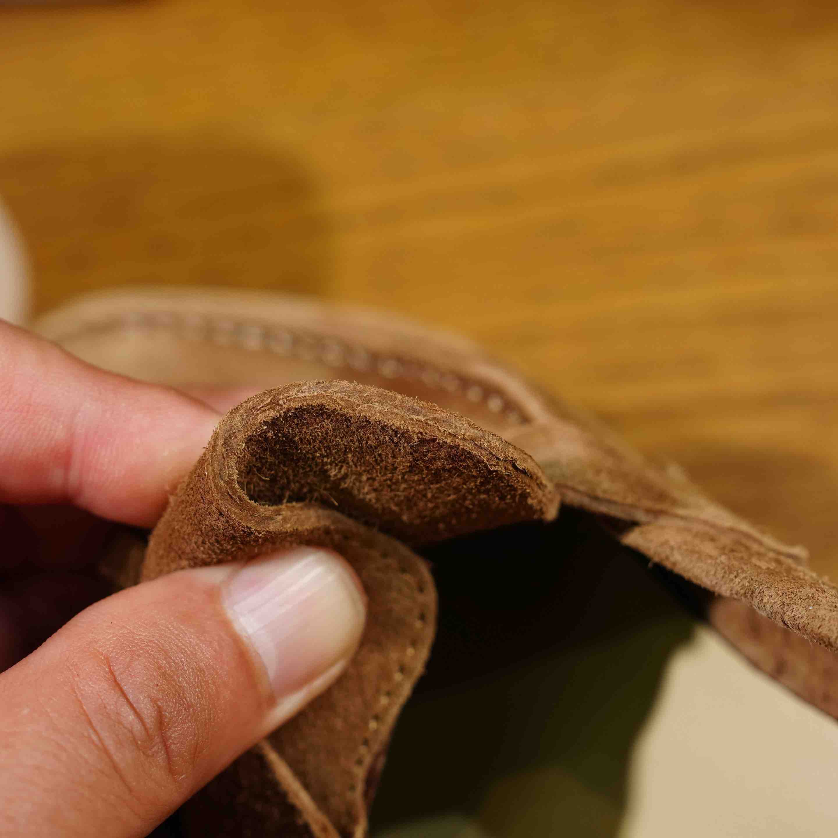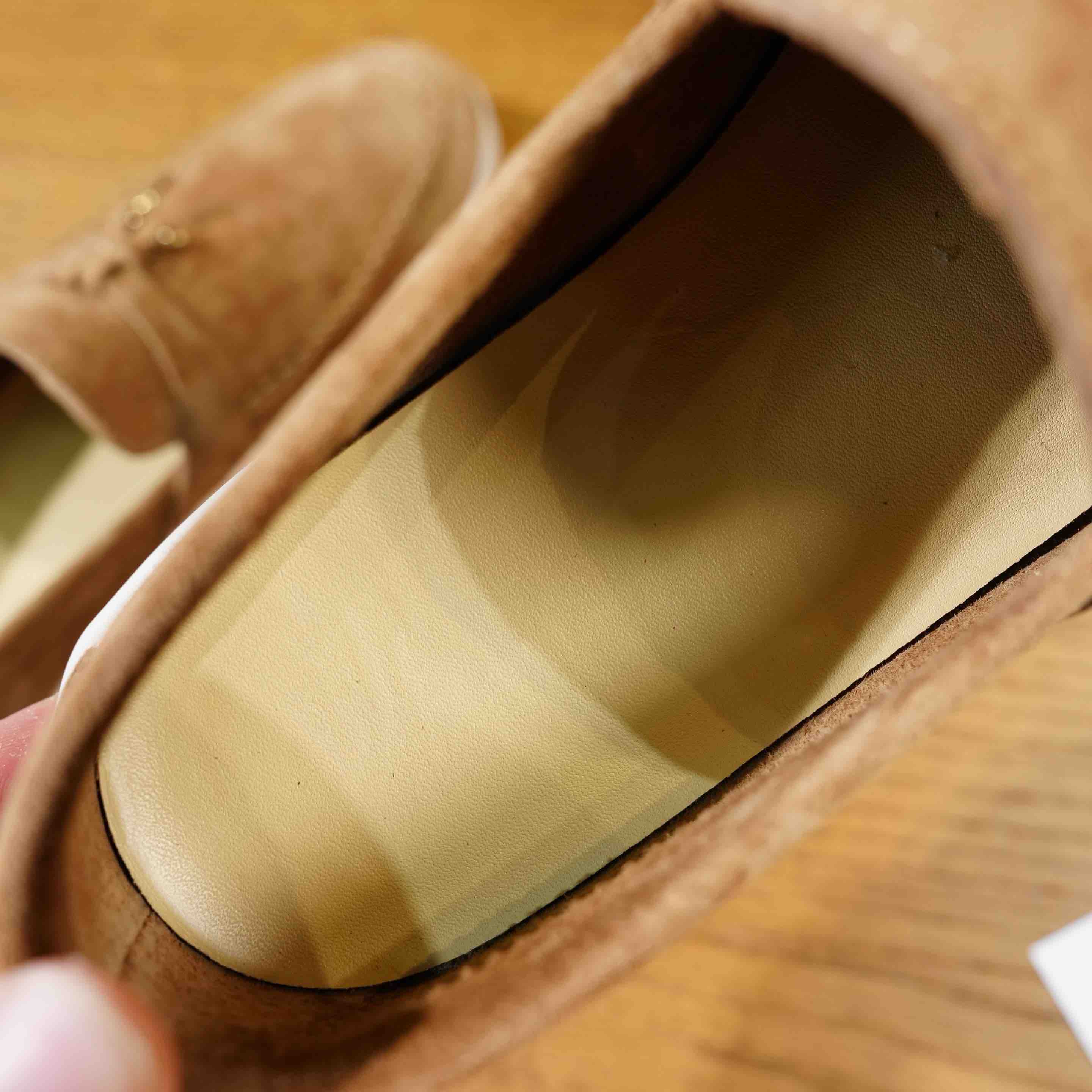 鞋面是原厂皮面料,跟市场上那些通货是不好比的哈,完全天壤之别,鞋面是定制羊反绒,绒感细腻,贴合感柔软舒适,透气性也好,它还自带一种微妙光泽,在不同角度下会呈现不同的深浅效果,高级又实穿,脚感舒服到无与伦比,就像踩在黄油上,柔软坚韧又富有弹力
