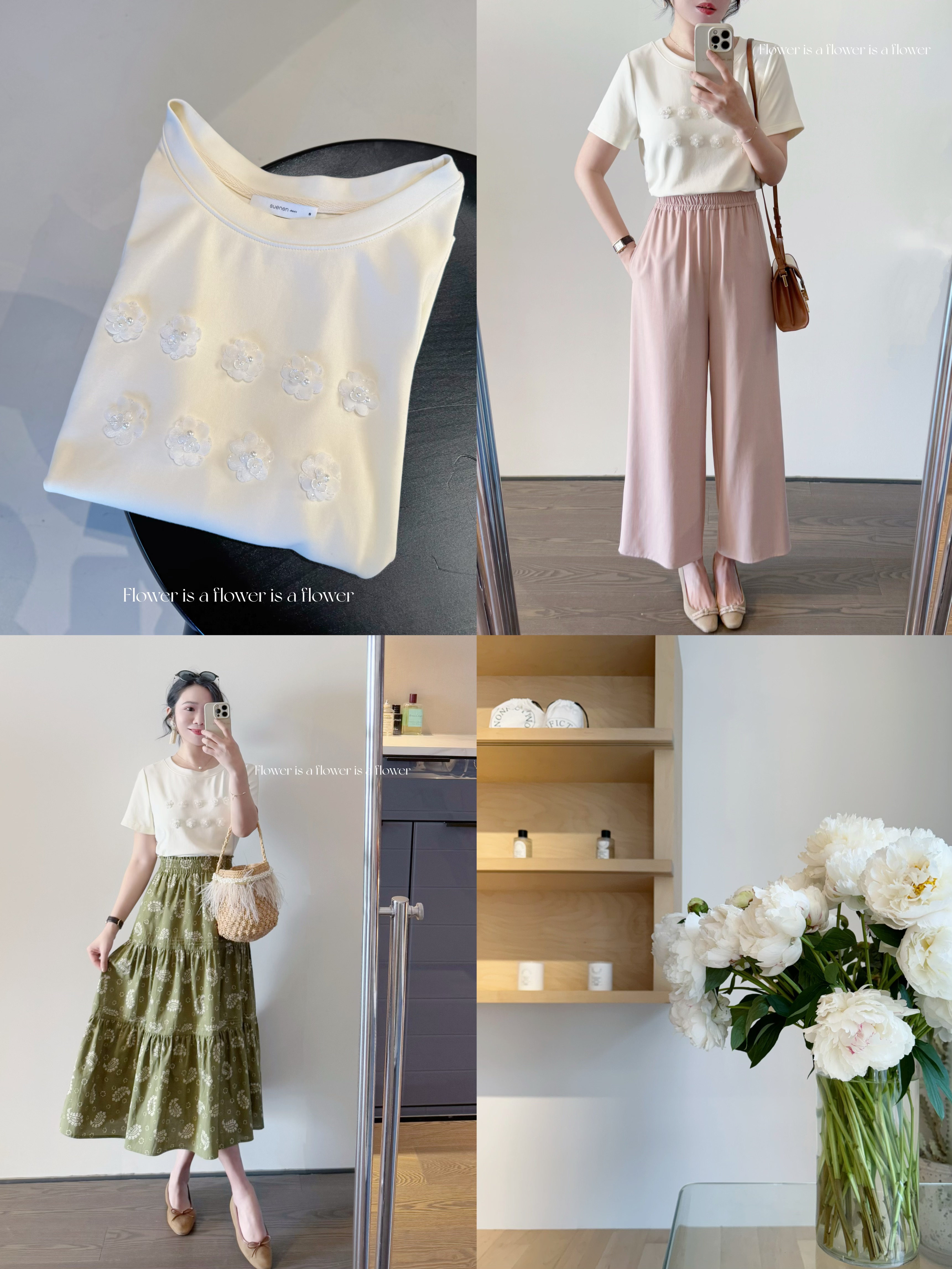 花花tee 大家一定要体验的某品牌同步天丝棉针织(穿着感100分!!) 手工钉珠花朵T恤 米白色