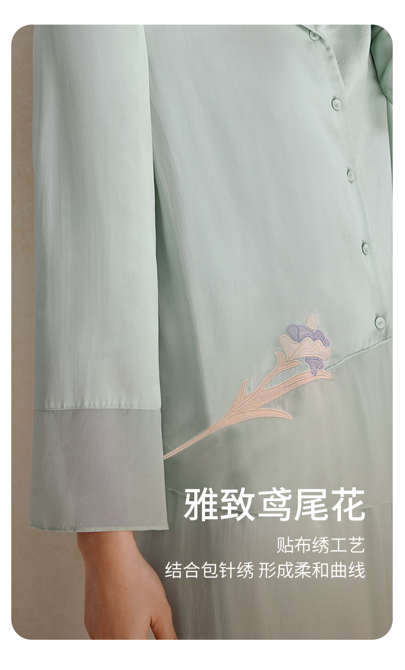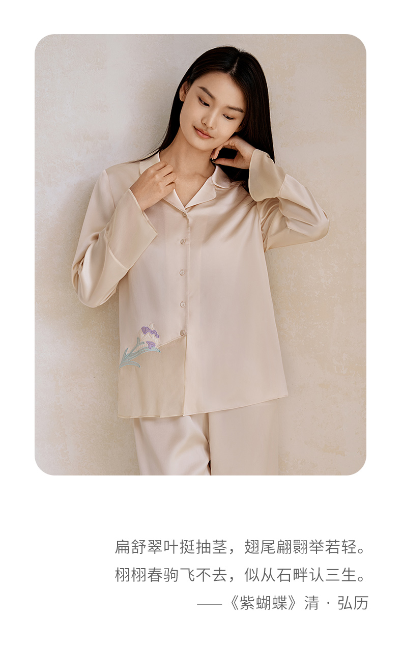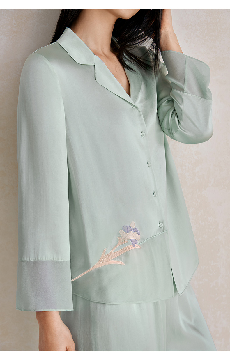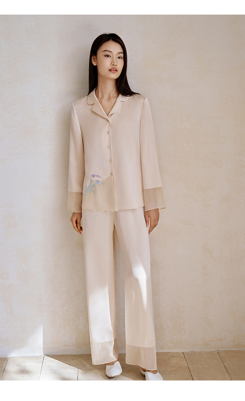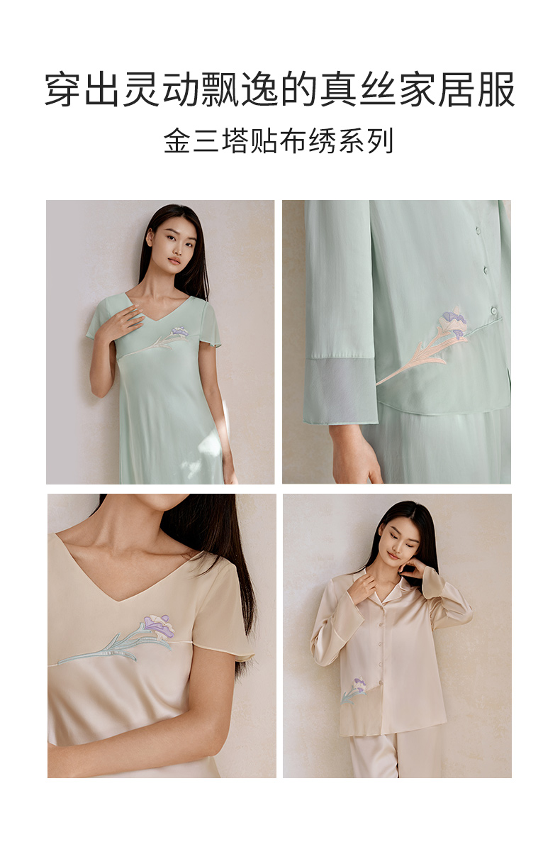 桑蚕丝鸢尾贴布绣】重磅真丝睡衣女100%桑蚕丝衣裤套家居服金三塔 YSFFA208