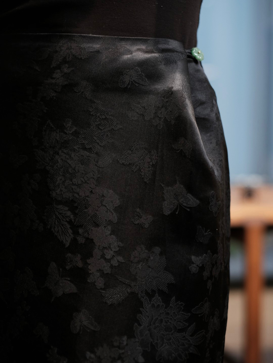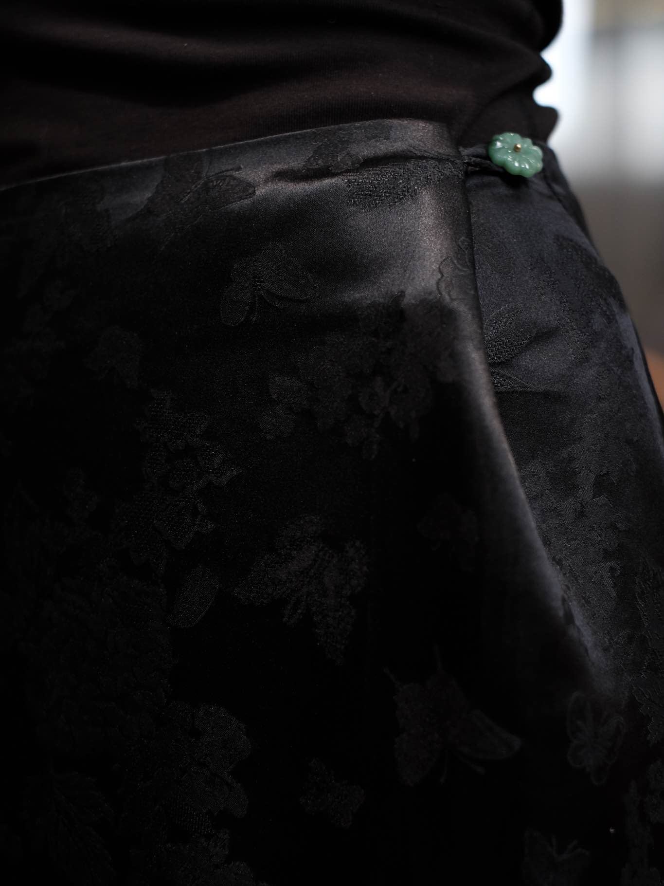 盛唐婧 |桑蚕丝重缎折枝玫瑰花直筒裤-黑色