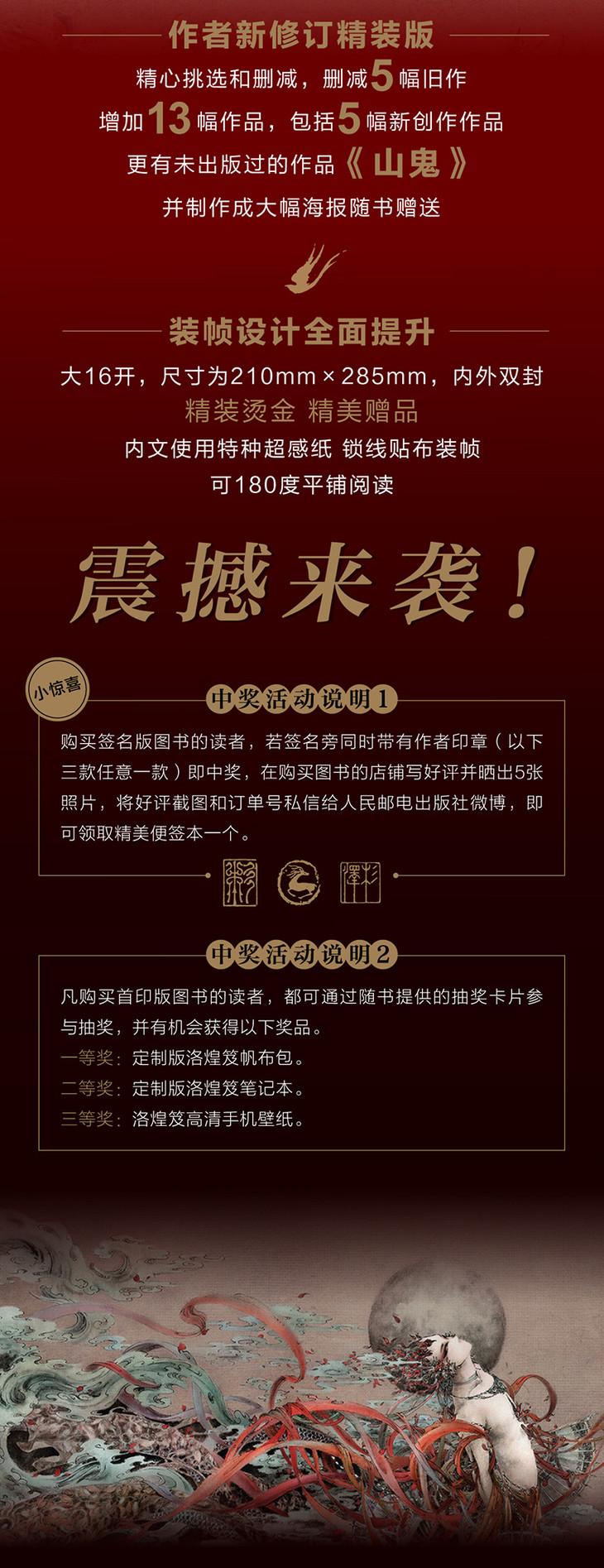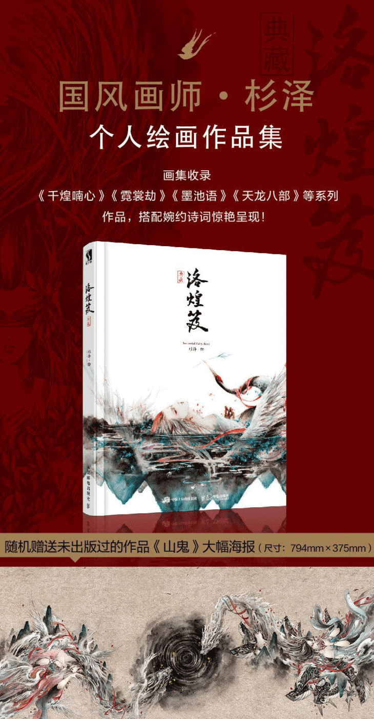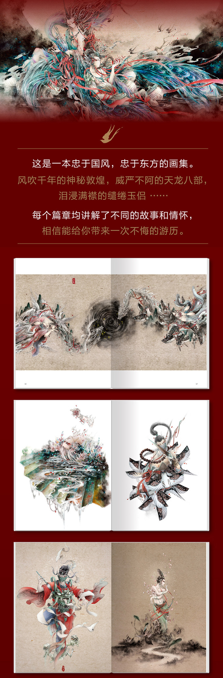 “垂裳听风,彼山淌翠。游墨恍若悉池语,引云慵慵布千煌”。 国风画师杉泽将多年作品首度集结成册,名曰“洛煌笈”。这是一本忠于国风,忠于东方的画集。杉泽用国内少见的绘画方法,诠释了风吹千年的神秘敦煌,威严不阿的天龙八部,泪浸满襟的缱绻玉侣……画集共分为3 个大章节和7 个小章节,每个篇章均讲解了不同的故事和情怀,相信能给将其捧于手心的你带来一次不悔的游历。