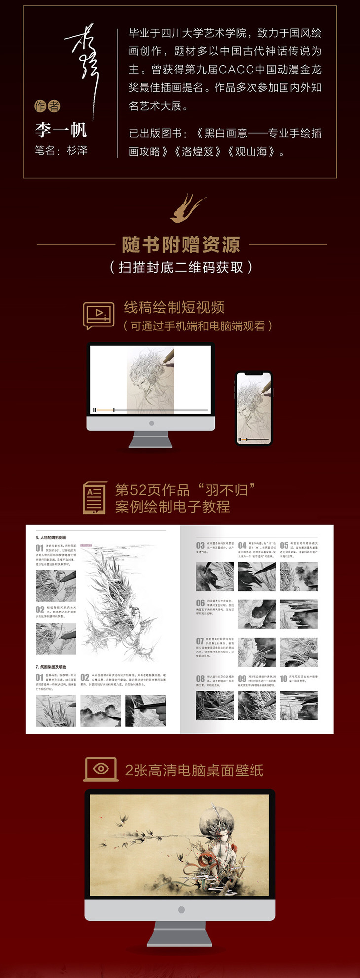 李一帆,笔名:杉泽。 毕业于四川大学艺术学院,致力于国风绘画创作,题材多以中国古代神话传说为主。曾获得第九届CACC中国动漫金龙奖*佳插画提名。作品多次参加国内外知名艺术大展。 已出版图书:《黑白画意——专业手绘插画攻略》《洛煌笈》《观山海》。
