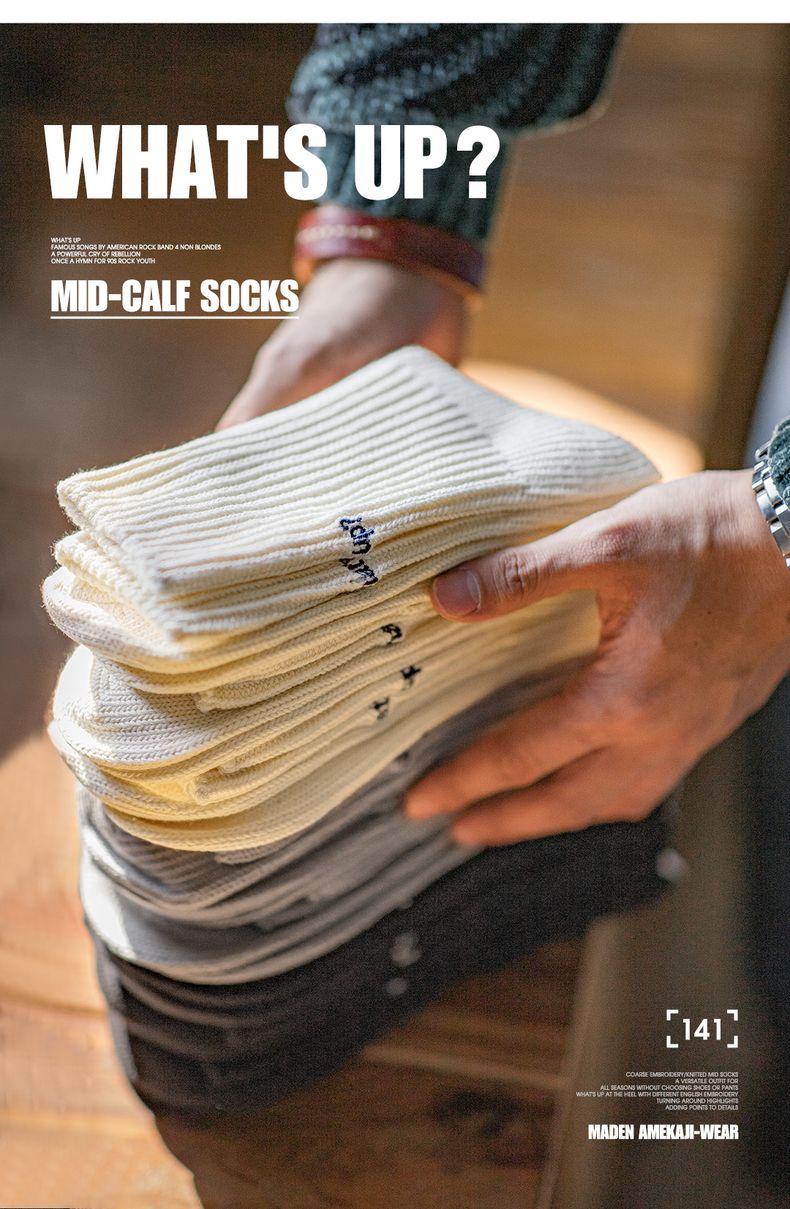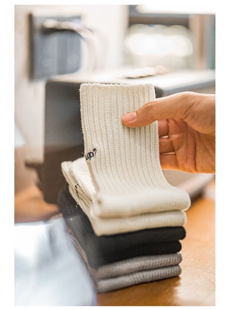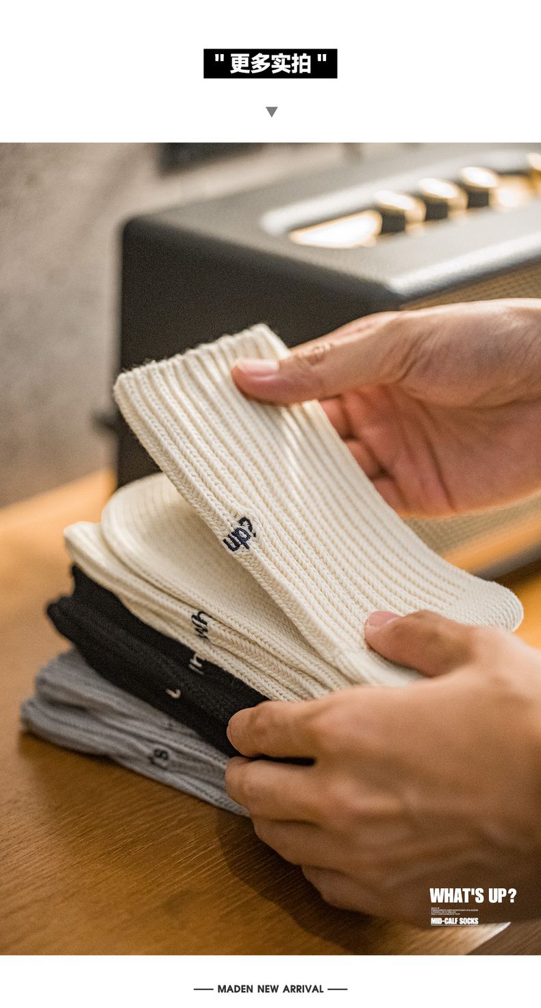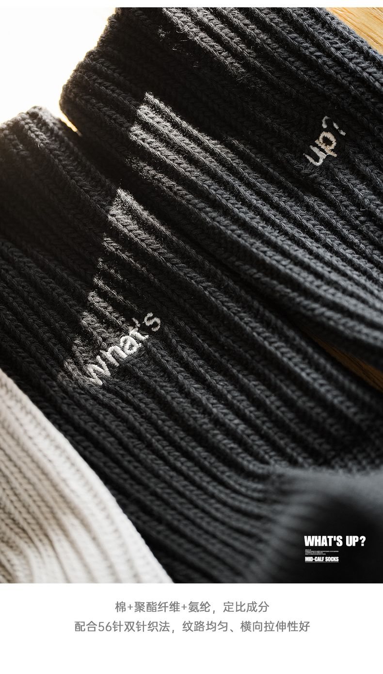 工装优选复古粗线刺绣针织中筒袜黑色运动透气精梳棉长袜子男女秋