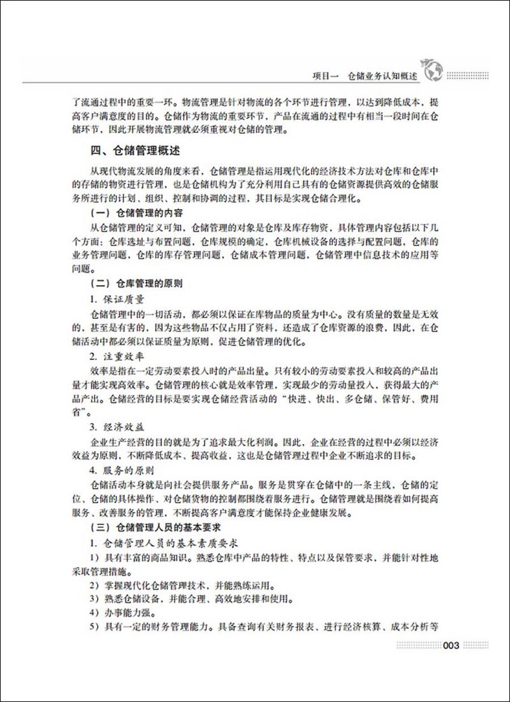 《仓储管理实务项目式教程》一书共分八个项目,从创作思想、体例设计、结构及内容等方面都体现了高等职业教育以能力为本、以够用为度、以服务项目式教学为目的的教材体系,从满足教学及实务操作的实际需要出发,内容囊括了仓储业务认知概述、仓储现代技术基础、入库作业组织与管理、在库作业组织与管理、出库作业组织与管理、仓储商务业务、仓储经营管理、配送作业组织与管理。