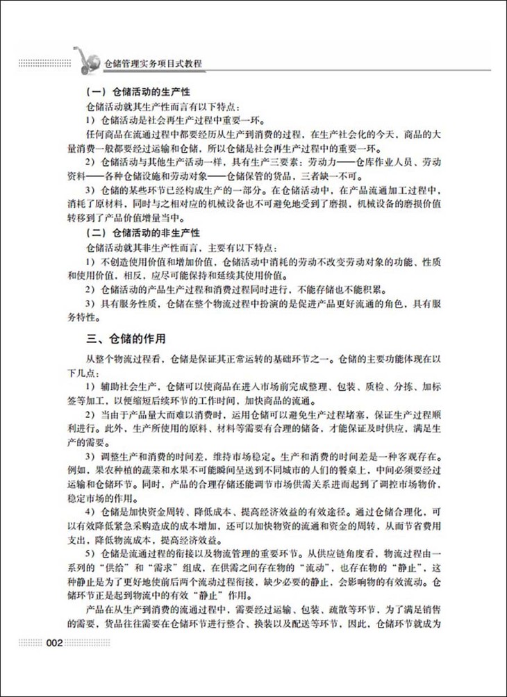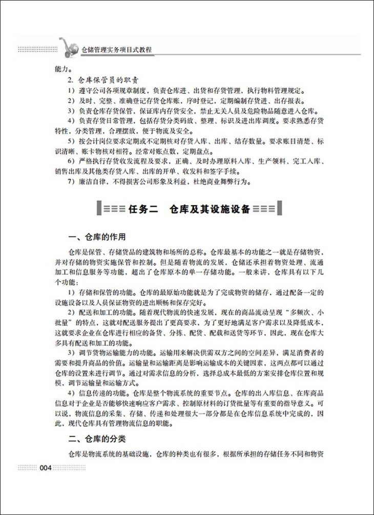 《仓储管理实务项目式教程》一书内容丰富、突出应用,将最新物流前沿科学的重要内容融入其中,保证了前瞻性和实用性。本书以够用、常用和实用为原则,以能力为本,从满足教学及实务操作的实际需要出发,每个项目都列出了知识目标、能力目标、理论知识和问题思考,以便教师教学和学生学习。本书注重培养学生应用专业知识分析和解决问题的综合能力,让学生明确学习目标和要点。本书可作为普通高等院校物流管理专业、物流工程专业师生的教材,也可作为企业培训物流与配送管理人员的培训教材。
