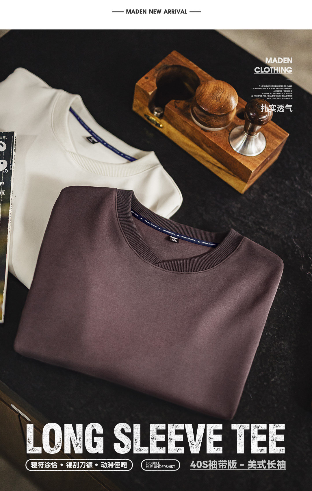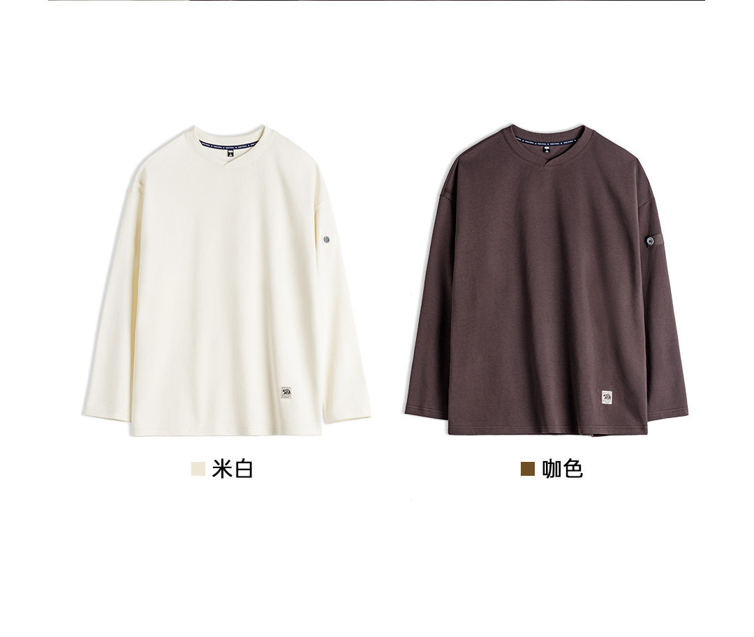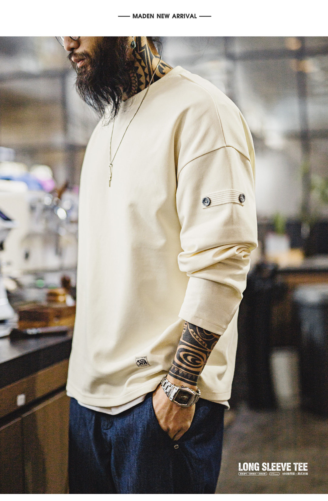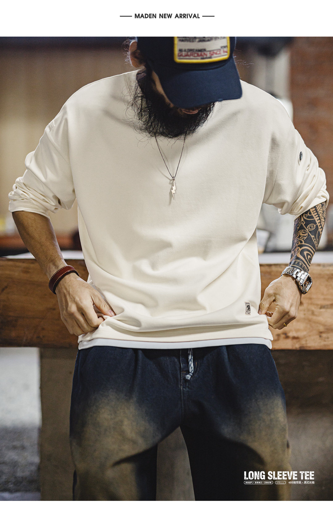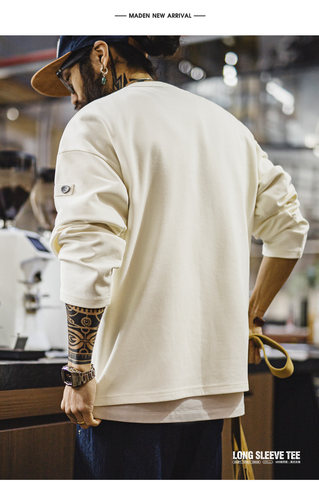 马登工装美式复古长袖T恤棉V领套头白色宽松垂感外穿卫衣男款春