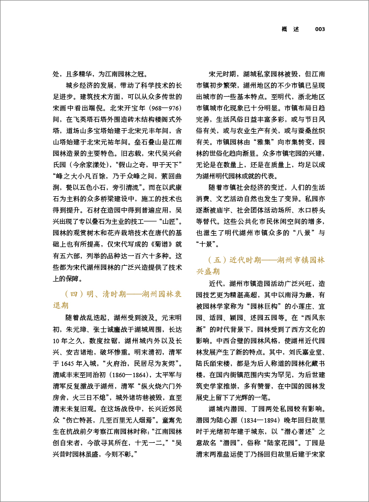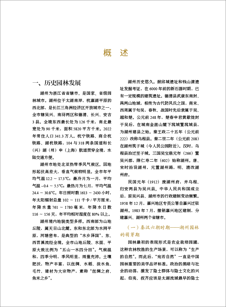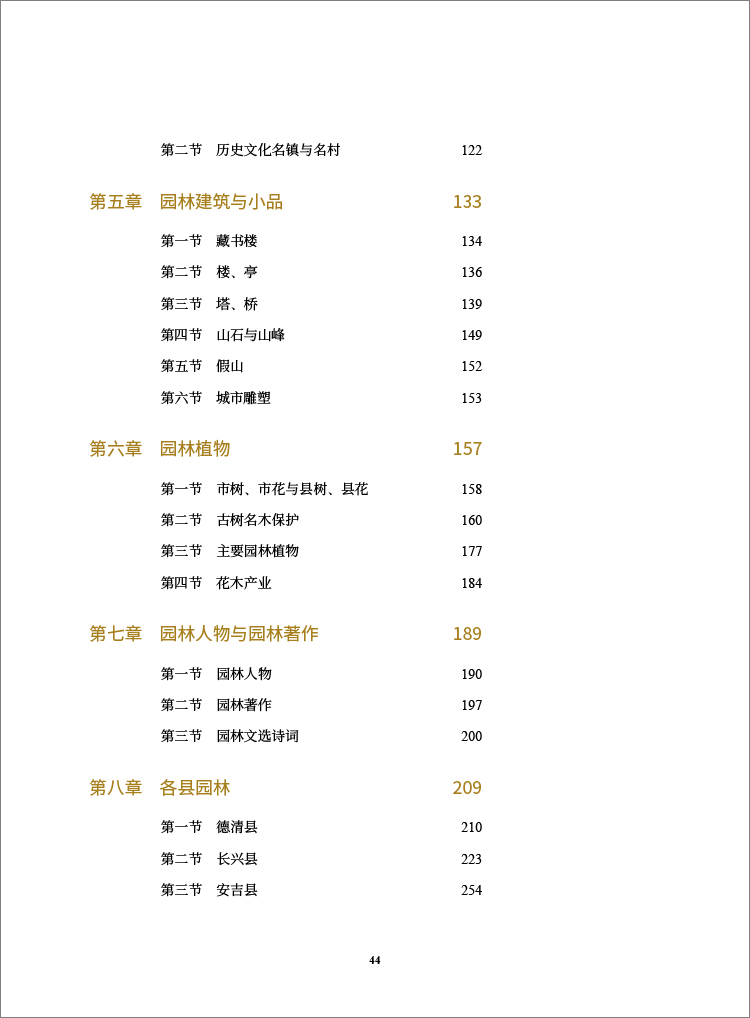 章园林人物与园林著作,收录园林相关人物、著作与文选诗词;第八章各县园林,分县介绍德清、长兴、安吉
