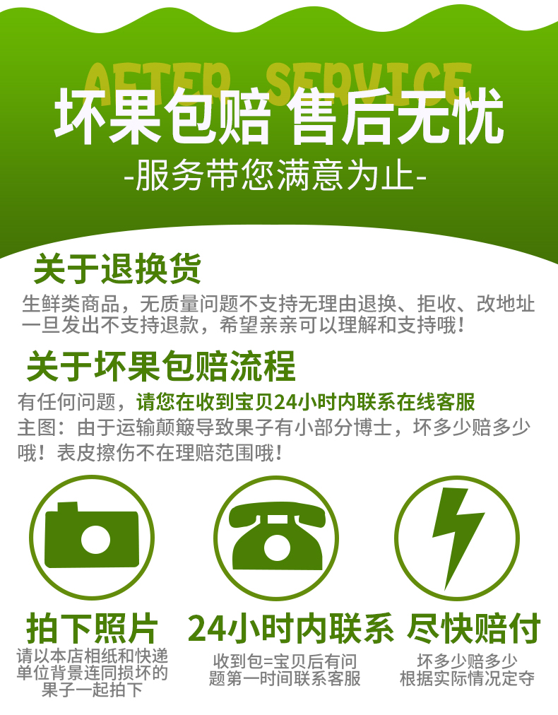 ④到货后,先签收,请在24小时内把“快递单和坏果”放一起拍照(能看到运单号、姓名,坏果情况),我们将根据果子实际损坏情况,按照“付款价格÷个数×坏果数量=赔付的金额”标准进行赔付