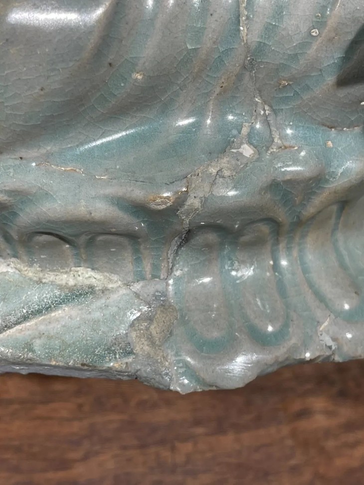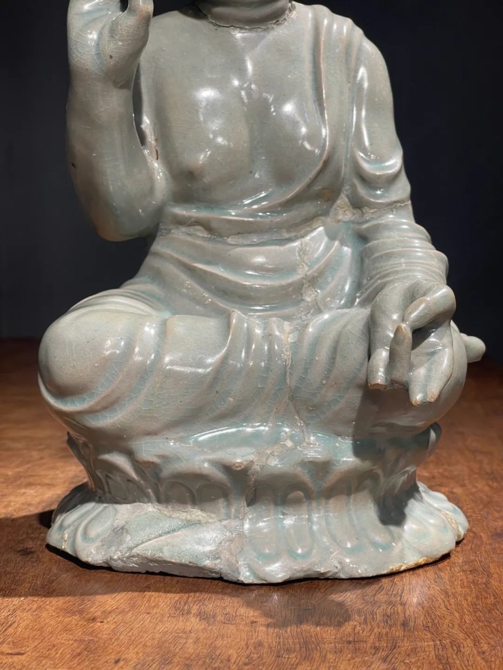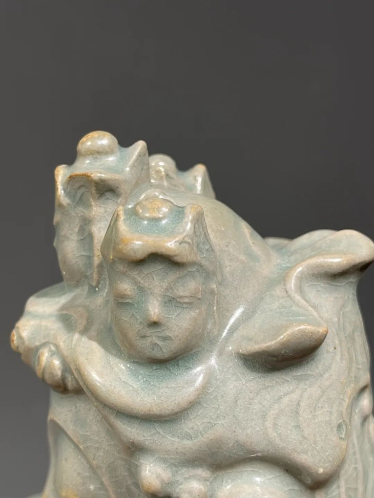 这是一件烧制于朝鲜半岛高丽时代的青瓷观音坐像,此高丽青瓷观音坐像,端坐于莲花座上的多面观音塑型庄严肃穆,覆玻化高、色泽灰青柔美的高丽青瓷釉,发饰、袈裟细节精緻华丽,整体造像案头尺寸、端庄典雅,面容端庄肃穆,线条流畅自然,高丽青瓷釉肥厚温润,玻化强开细片,近距离观赏令人赞叹。此高丽青瓷观音坐像,造型严谨,青瓷釉玻化强,透明柔美,工艺细腻,非卓越工匠不可为,尺寸不小,艺术雕塑性高。依其工艺水平和艺术表现形式判断,应是高丽青瓷窑为朝鲜半岛寺庙或贵族佛堂製作的高端佛像。此高丽青瓷观音坐像经历数百年,如图所示,坐像多处窑裂修补,颈部曾断裂后接补、右手三指与左手一指断裂,下方一处磕伤,以其它青瓷残片简易修补,塑像凸出处釉面细微磨损,除此之外保存基本完好。尺寸:高:32厘米,长:16.5厘米,宽:14.8厘米,重量:2192克。