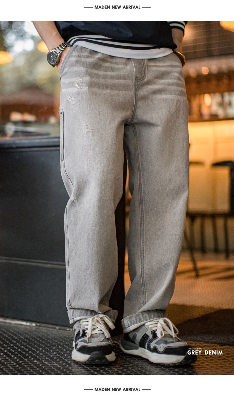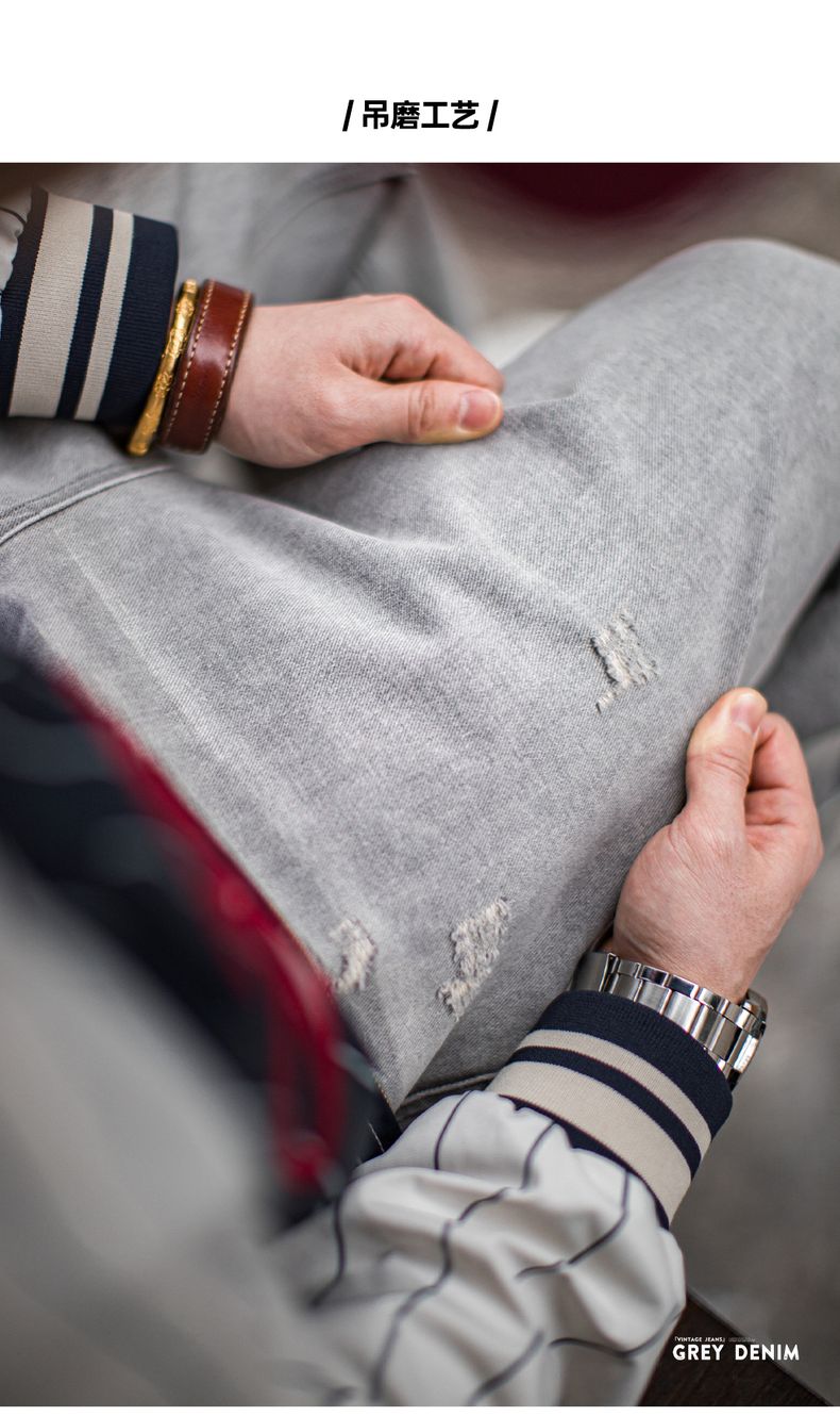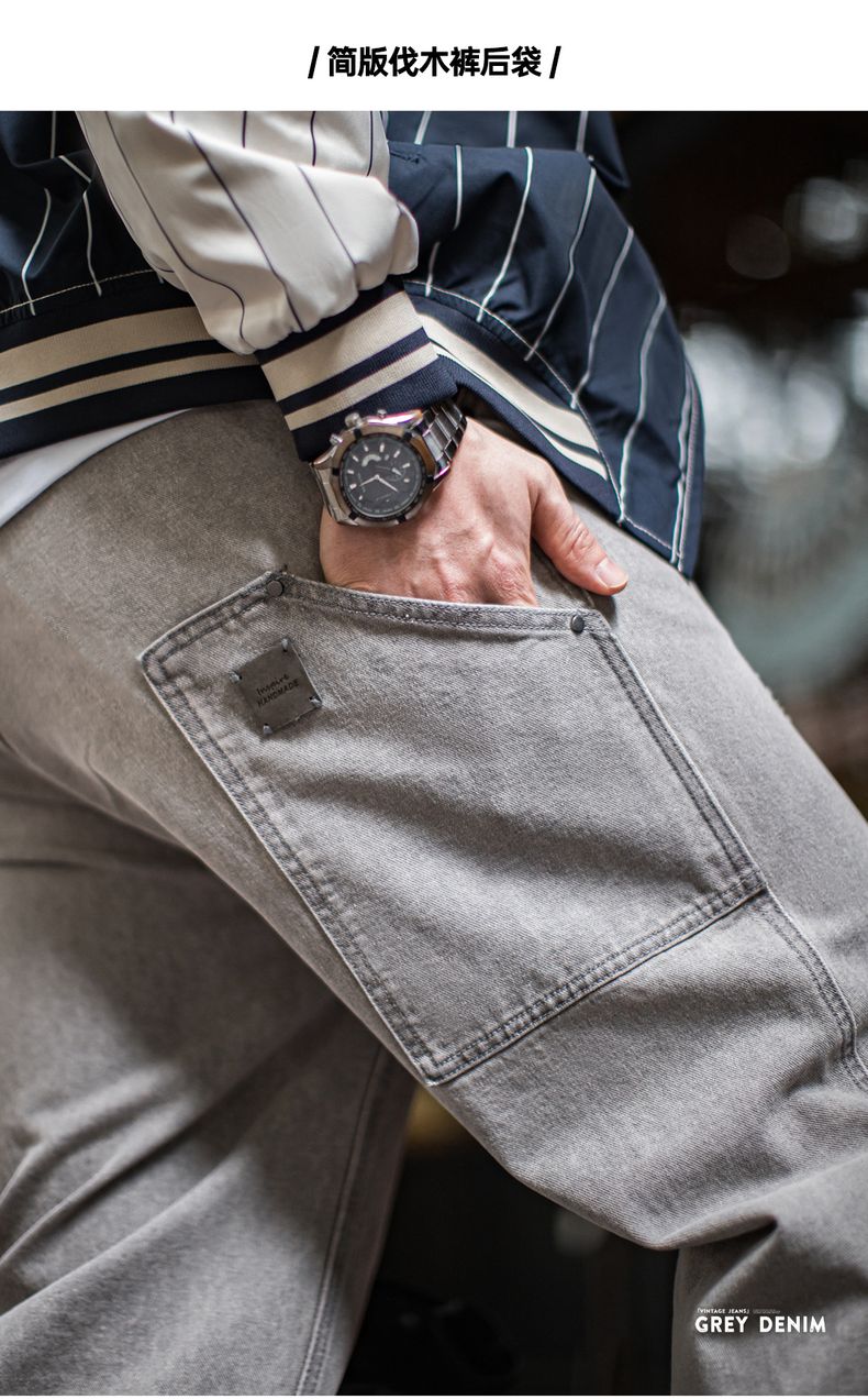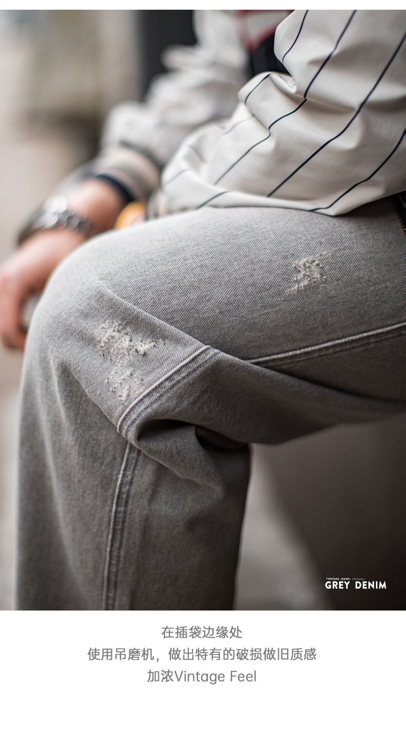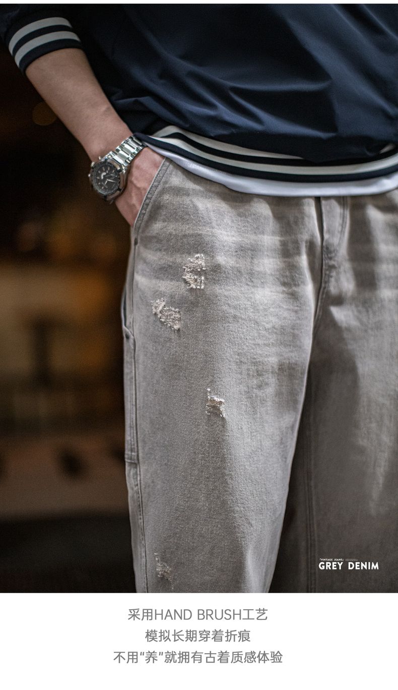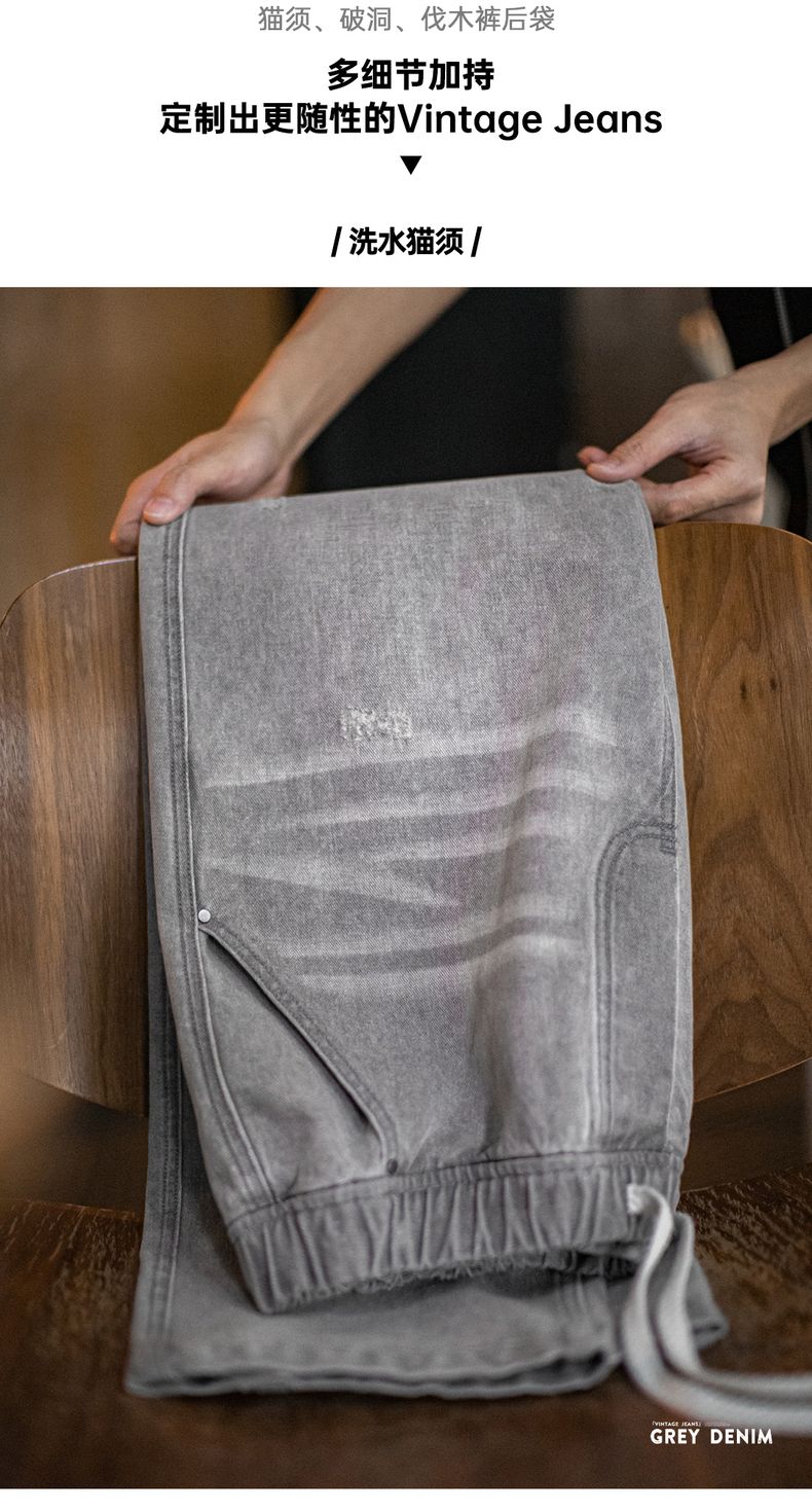 工装优选美式复古水洗做旧格雷系灰牛仔裤破洞猫须伐木直筒裤男春