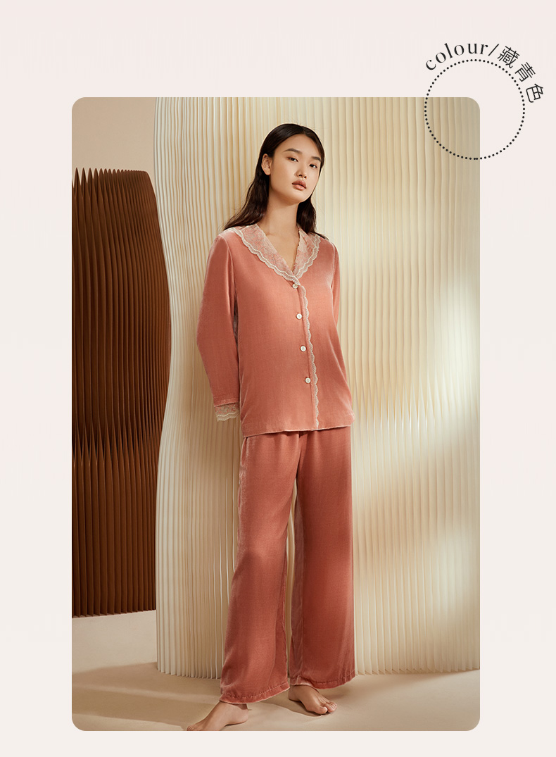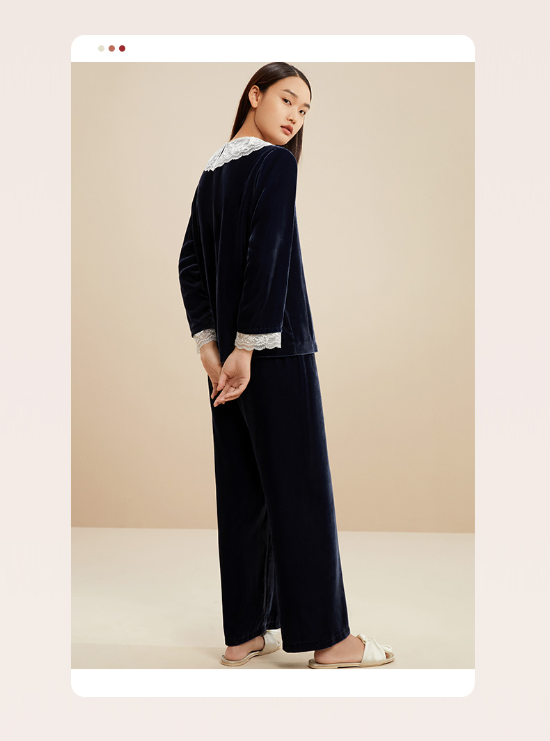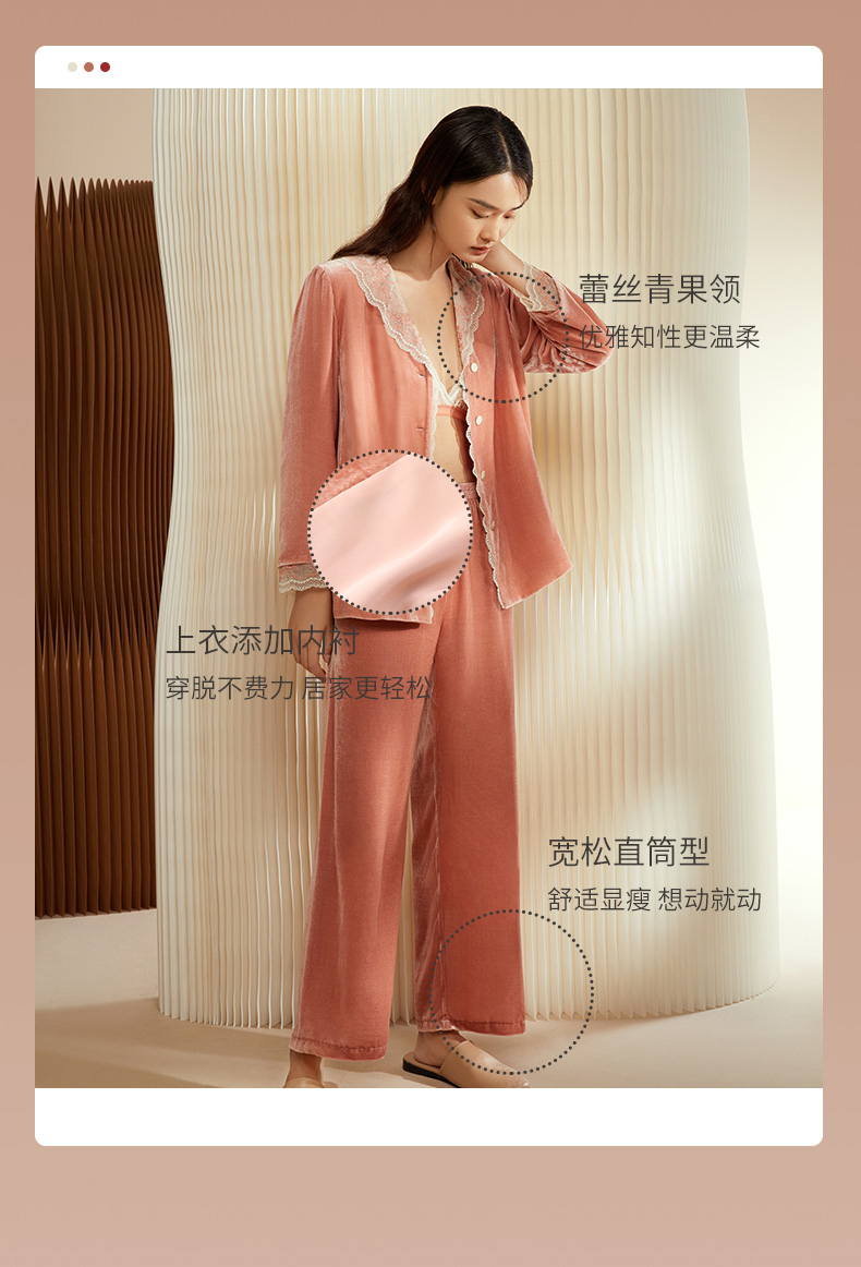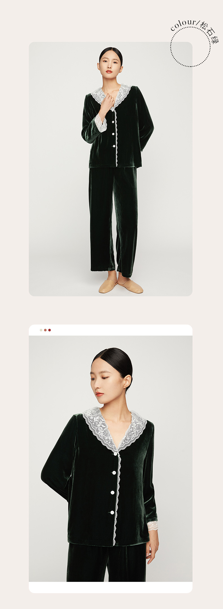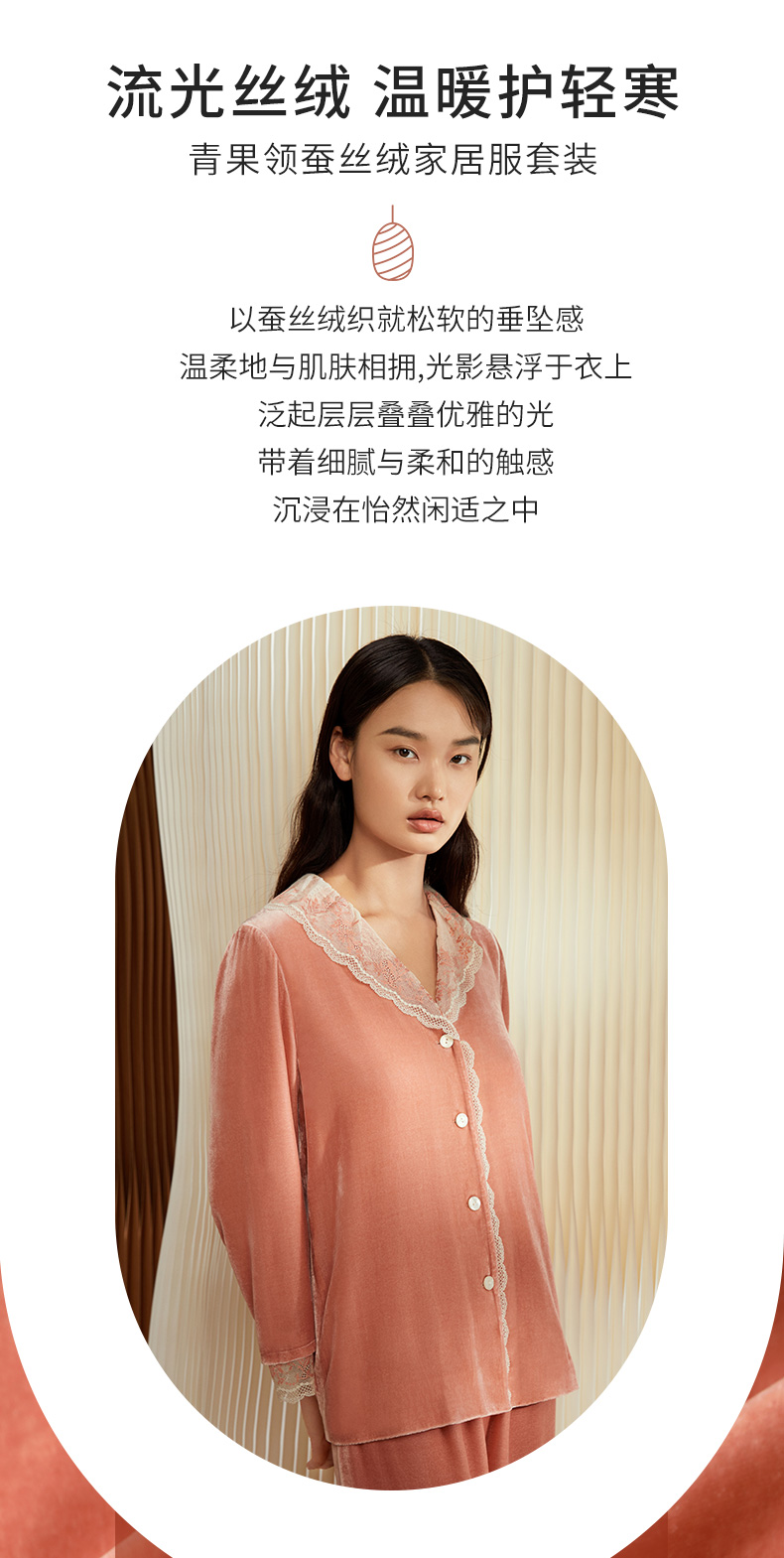 金三塔桑蚕丝丝绒珍珠光泽垂坠丝滑女士复古自在舒适家居服衣裤套 YSFCD202