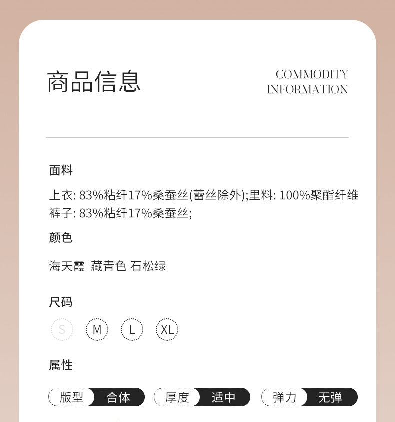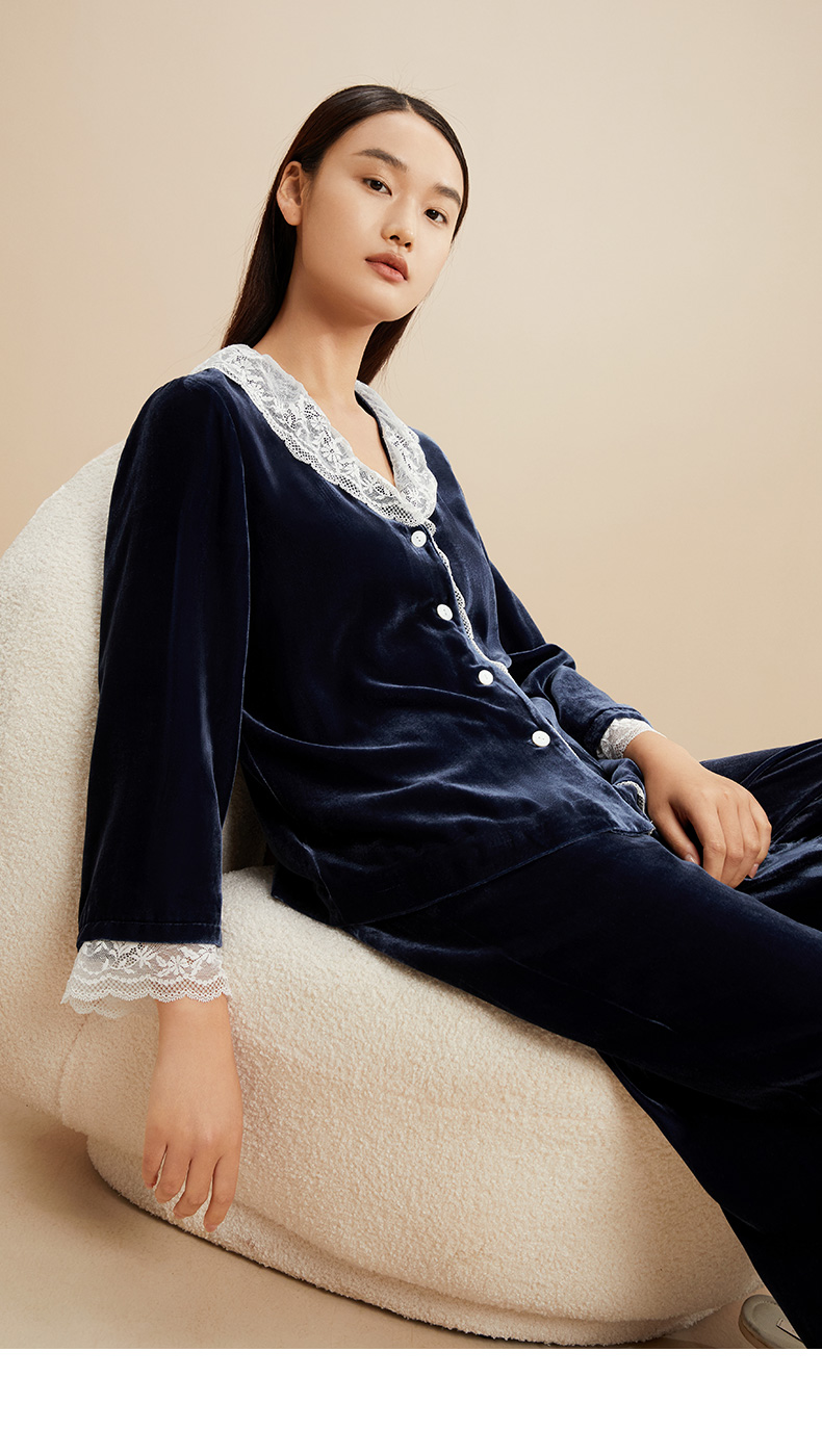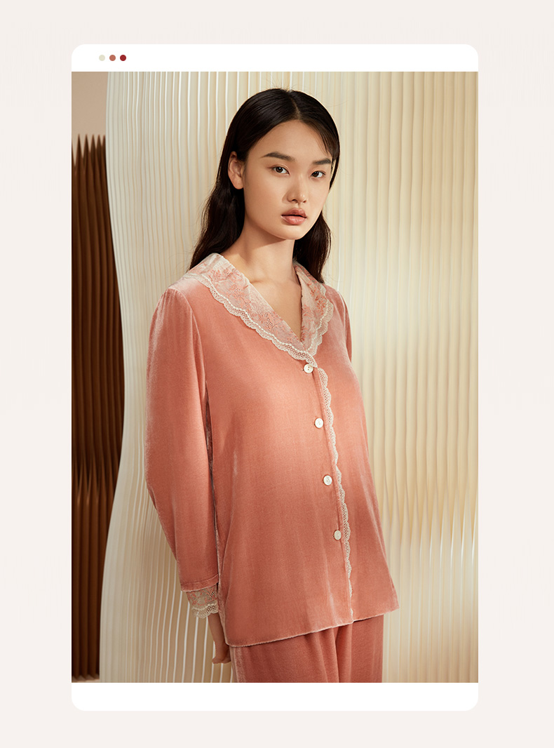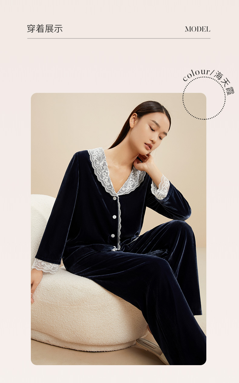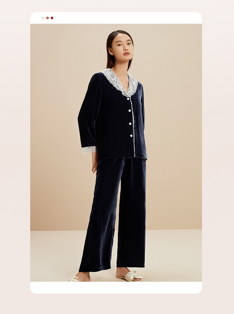 金三塔桑蚕丝丝绒珍珠光泽垂坠丝滑女士复古自在舒适家居服衣裤套 YSFCD202