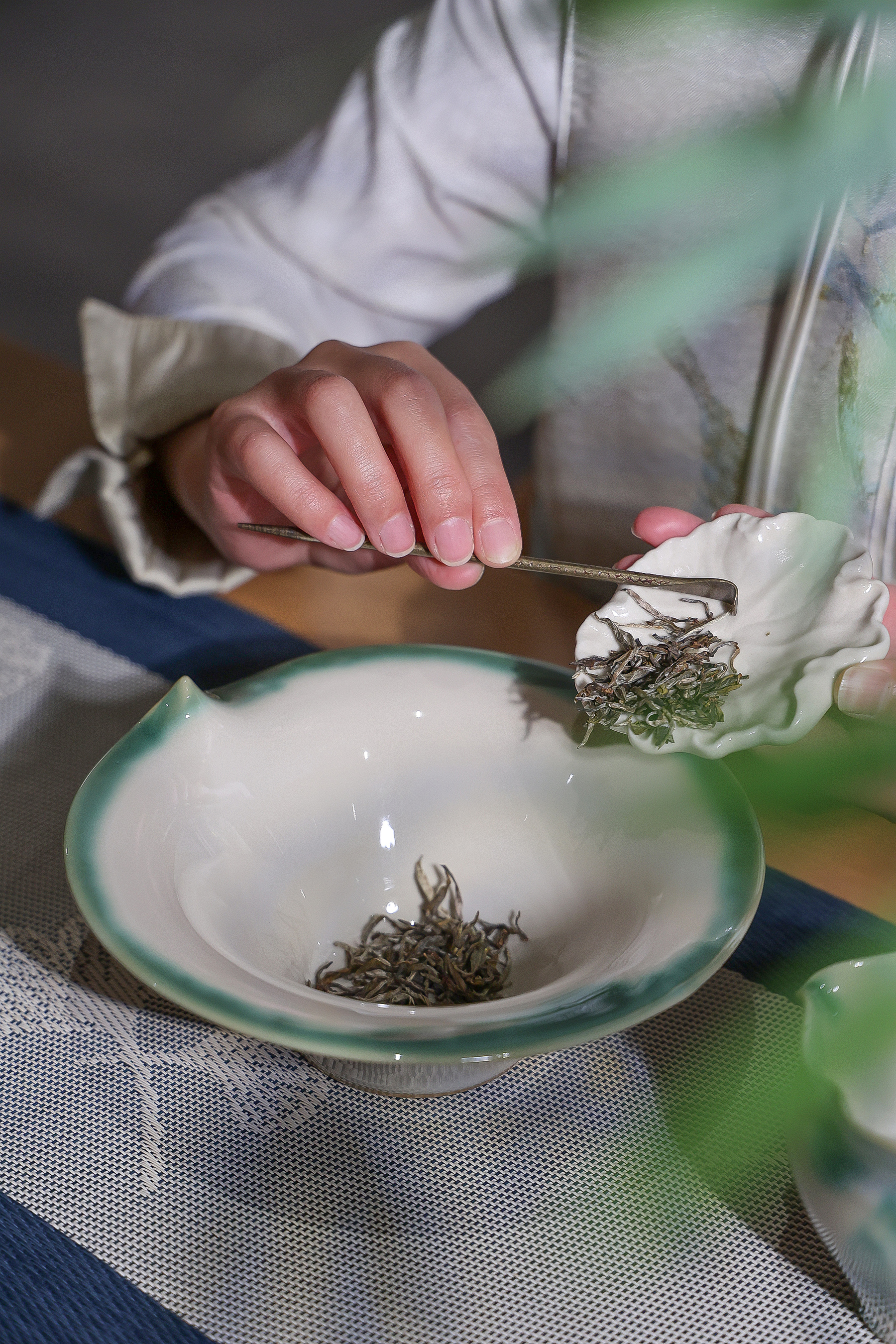 【贡茶.蕊茶】仅于阳气生发的惊蛰至春分的15天期间采摘,取茶树枝尖上最细嫩一芽一叶的芽蕊,需在晴天日出前完成