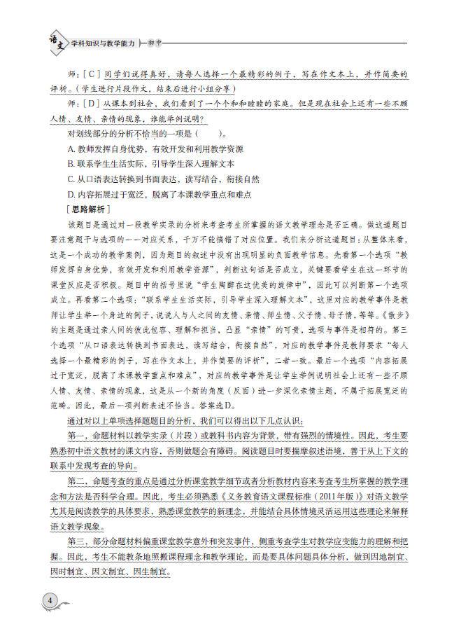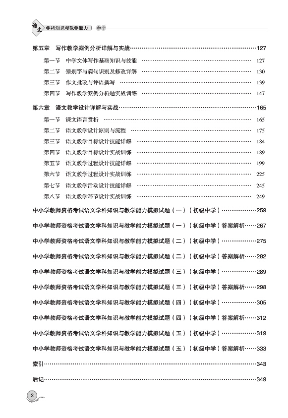 本书是《国家教师职业资格考试用书》中的一册,作者为山东师范大学参加国家教师职业资格考试阅卷的专家学者。他们多年参加考试阅卷,撰写考试分析,对考试试题特点及学生答题难点有全面掌握和独到研究,因此在内容编排和试题的选择上更具权威性和针对性。本书分为语文学科知识与教学能力备考地图、语文教育基础理论知识概述、单项选择题详解与实战、阅读教学案例分析详解与实战、写作教学案例分析详解与实战、语文教学设计详解与实战六大模块,重点突出,靶向备考,命题预测,直达要点, 全真模拟,试题独家赠送,各章节知识编排紧贴考纲,知识体系清晰,重点突出、内容丰富,紧跟发展趋势。