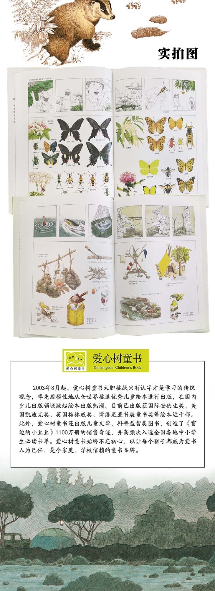 一对父子驱车来到远处的森林里,在河边空旷的露营地上搭建好帐篷。搬运食物的黄腰蜾蠃、正在羽化的蜻蜓、“用餐”中的飞蛾、獾和松鼠的脚印……图鉴水准的动静态动植物手绘,融入真实自然的场景,还有野外生活所需的物品、真实的野炊过程等,都让读者仿佛置身其中。森林是自然绘本大师松冈达英创作的灵感来源之一。书中每页上方是一格格的画面,像镜头一样讲述了爸爸和孩子在森林里发生的故事;下面大幅画面描绘了河边、草丛和树干上的“居民生活”。毫不虚言,打开绘本就可以开始***一夜的森林之旅。