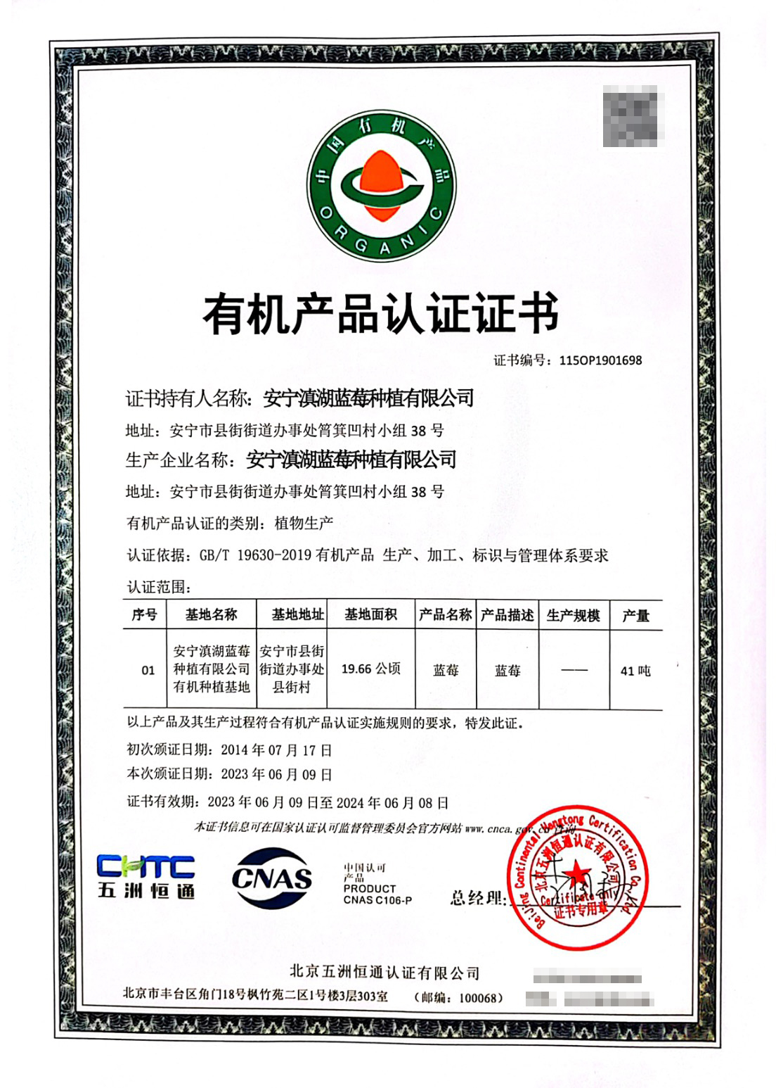 我们蓝莓种植过程不使用化学农药,除了诱捕器以外,配合使用石硫合剂、苏云杆菌等生物源、矿物源制剂去防治病虫害。不用化肥,施用生物菌肥、发酵粪肥作为肥料。不用除草剂,人工除草。防鸟是最头疼的事情,鸟儿吃完人再吃。2014年起获得有机认证证书。
