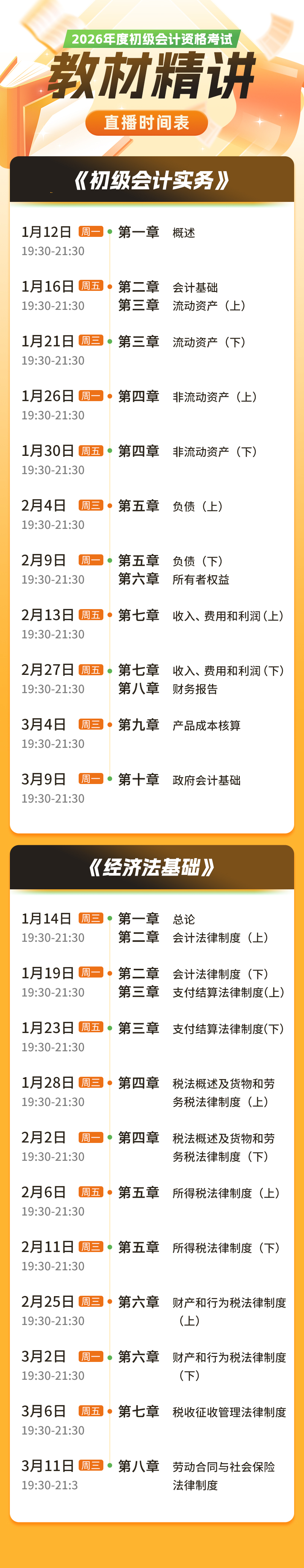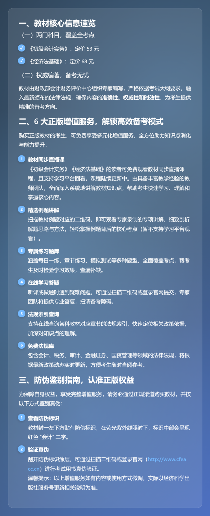 1.教材同步直播:《初级会计实务》《经济法基础》的读者可免费观看教材同步直播及回看视频。由具备丰富教学经验的教师团队全面深入系统地讲解教材知识点,帮助读者快速学习、理解和掌握教材内容。