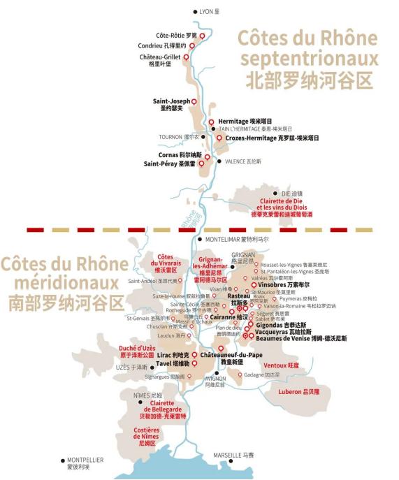 罗纳河谷产区主要分为两个部分,南罗和北罗。南北罗纳河谷虽然在理位置上都被划分为同一产区但是二者在风土和葡萄品种上都有着很大差别。北罗纳河谷是罗纳河中游的谷地,是温和的大陆性气候,夏季炎热,冬季寒冷,降水量相对较高。