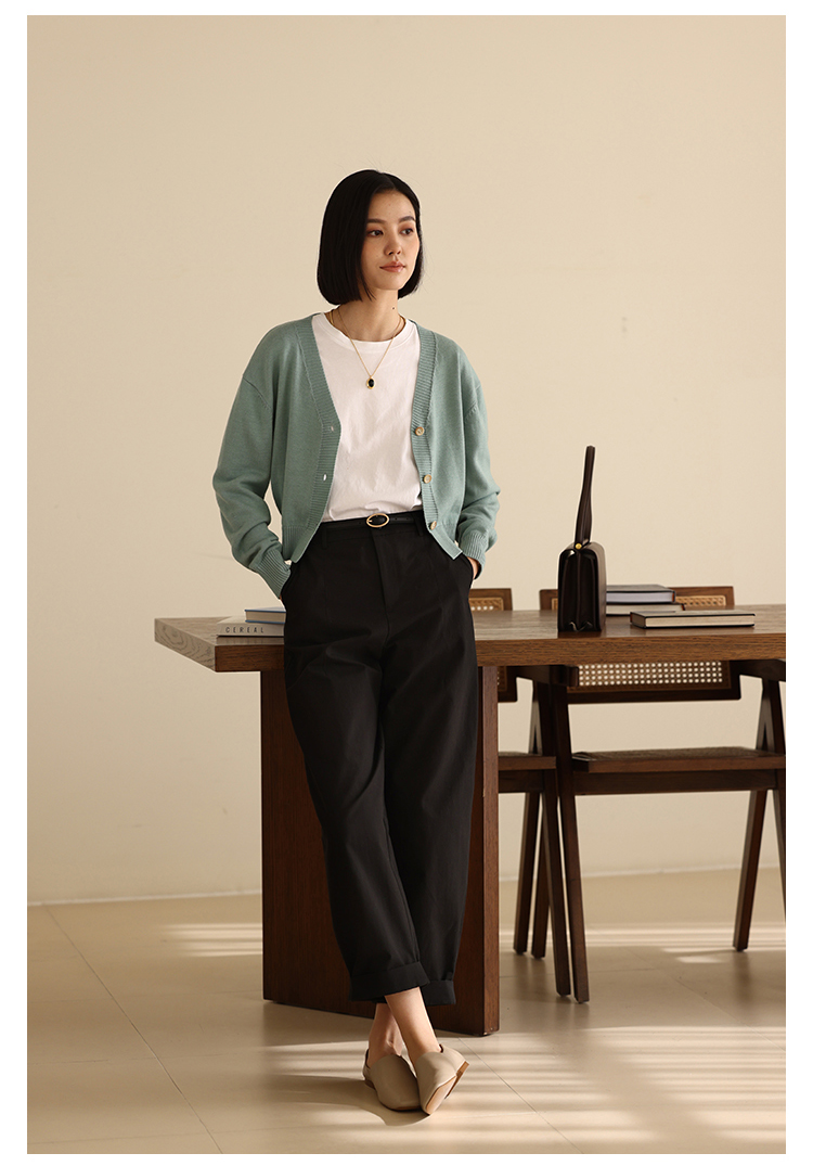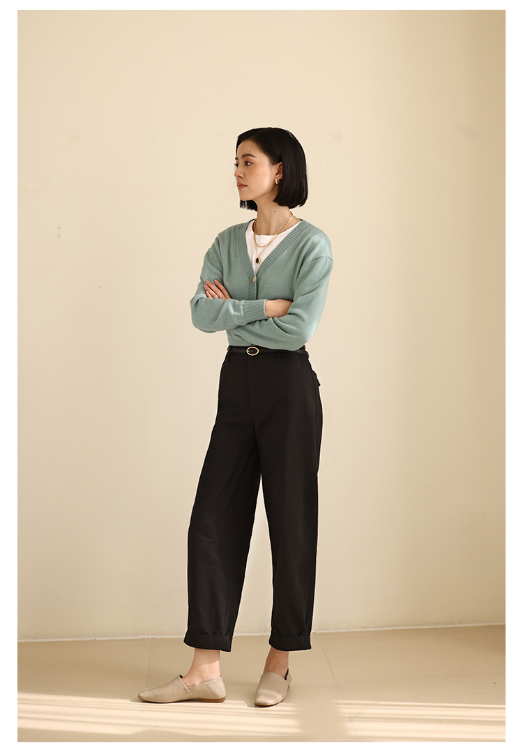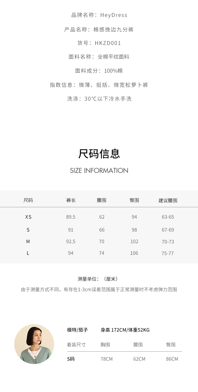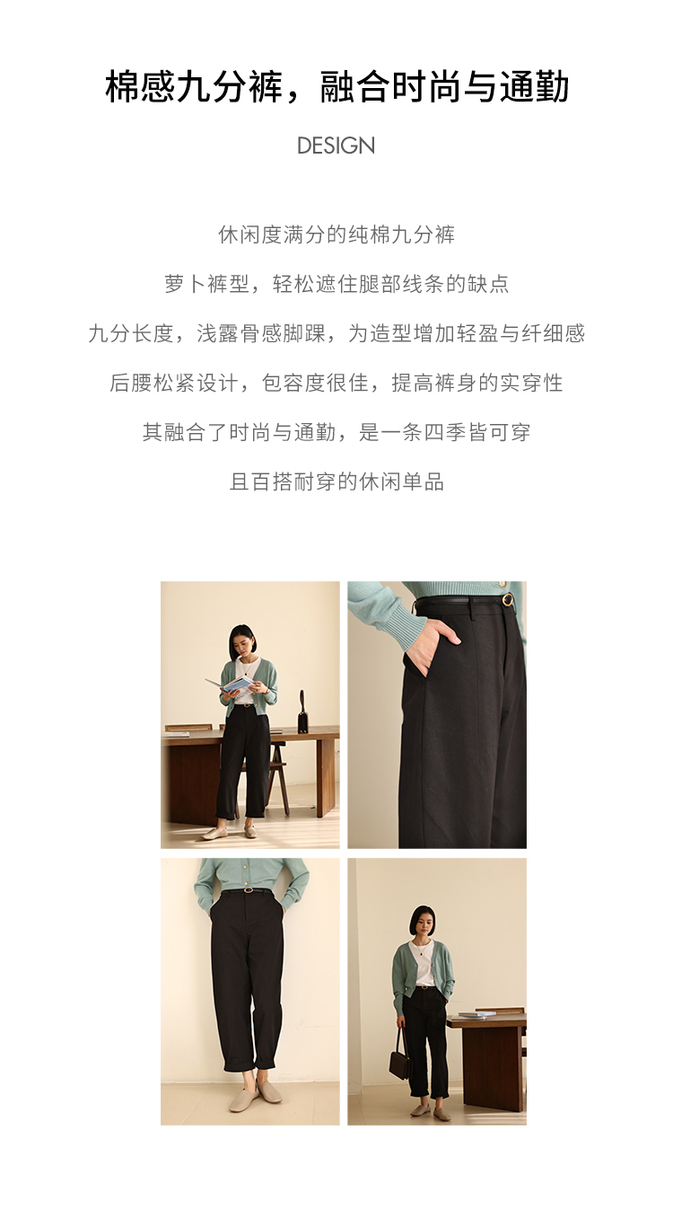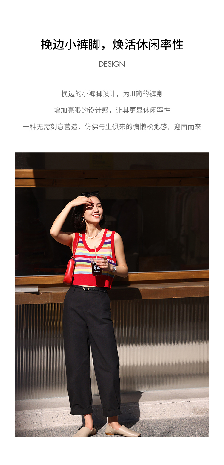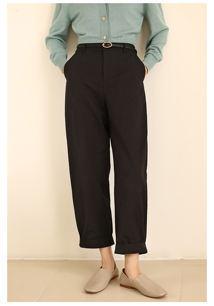 HeyDress法式九分休闲裤女春季高腰宽松显瘦挽边设计感纯棉裤子