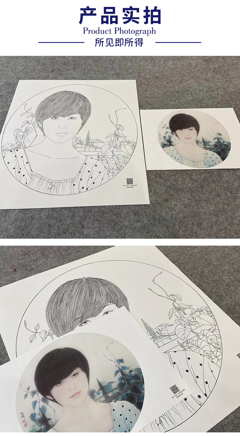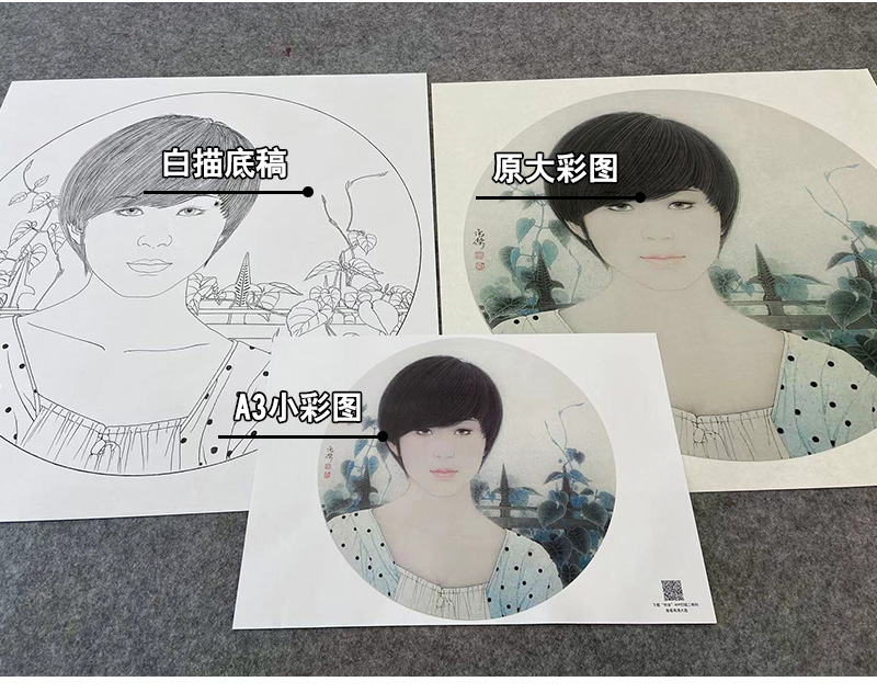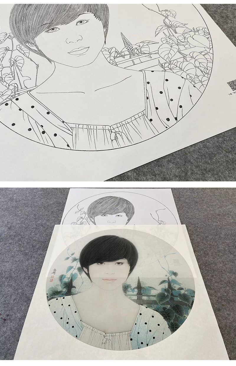 【大彩图】盘虎杰工笔画白描底稿圆形小品《阳光灿烂的季节》现代人物高清打印稿HJ30