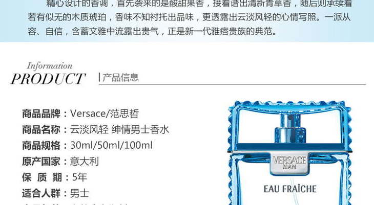 意大利 范思哲云淡风轻 绅情男士香水 EDT-Q版5ML/30ML/50ML/100ML简装 (版本随机发)