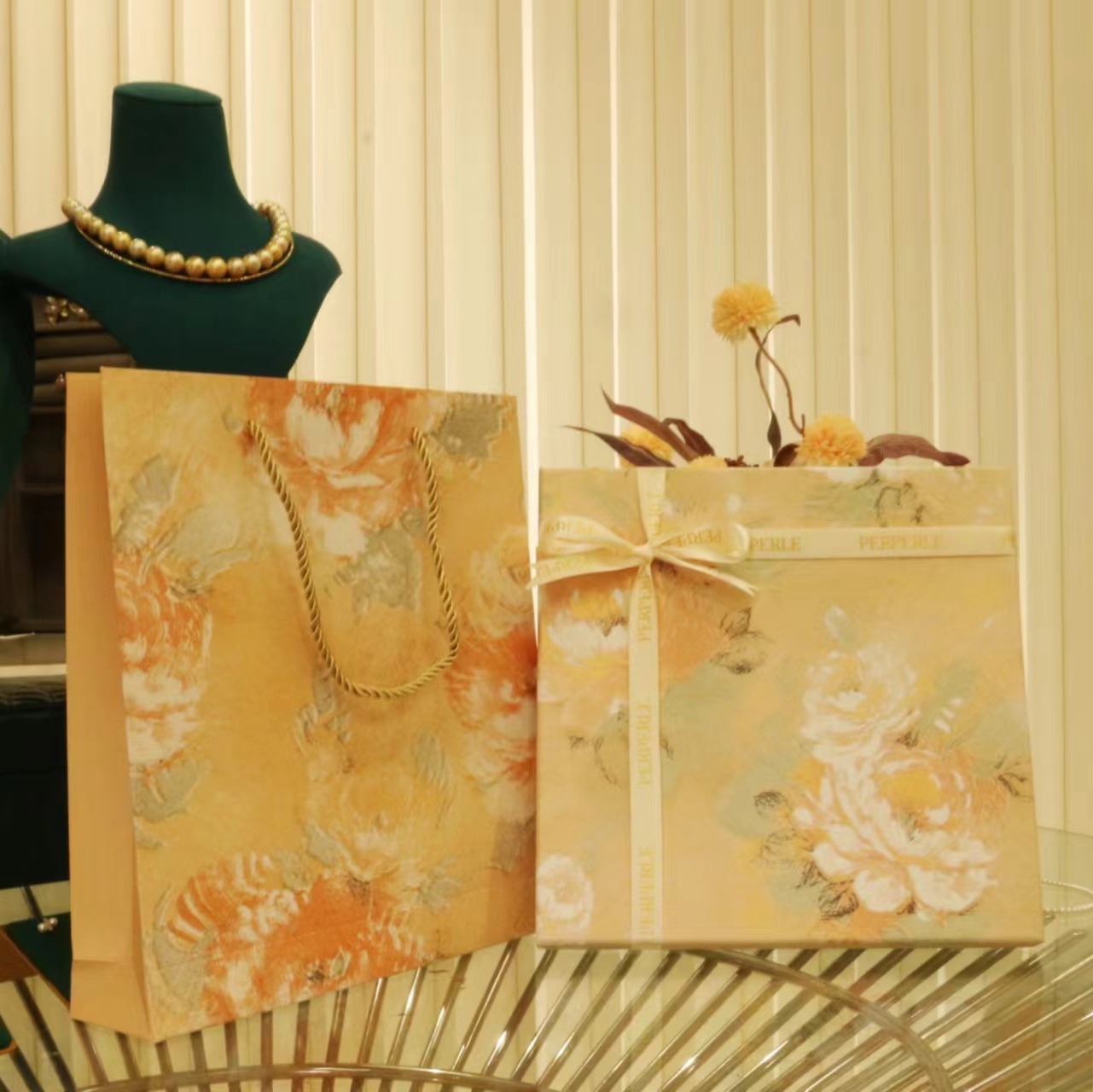 【甄珠贝·油画艺术风系列】杏花丝巾和淡水花瓣胸花和施华洛丝巾扣三件套礼盒套装