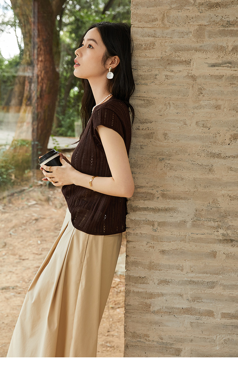 深棕色镂空针织马甲女 夏季薄款 V 领单排扣无袖外搭透气显瘦背心
