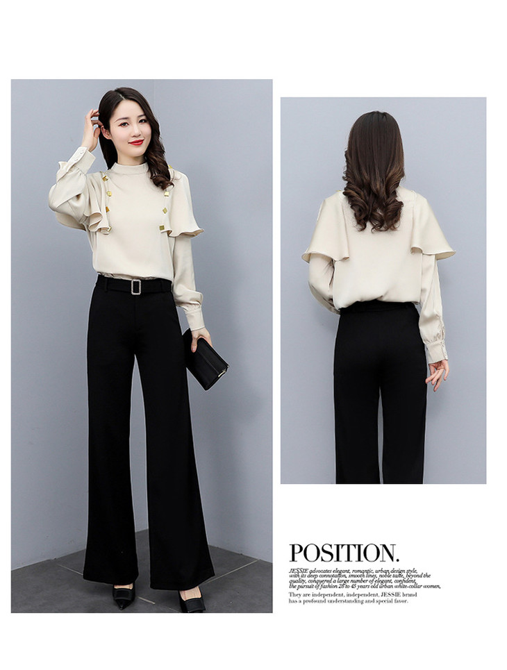 LJY-YJ2205-0121 2022新款春装衬衫木耳边设计感上衣垂感显瘦喇叭裤套装