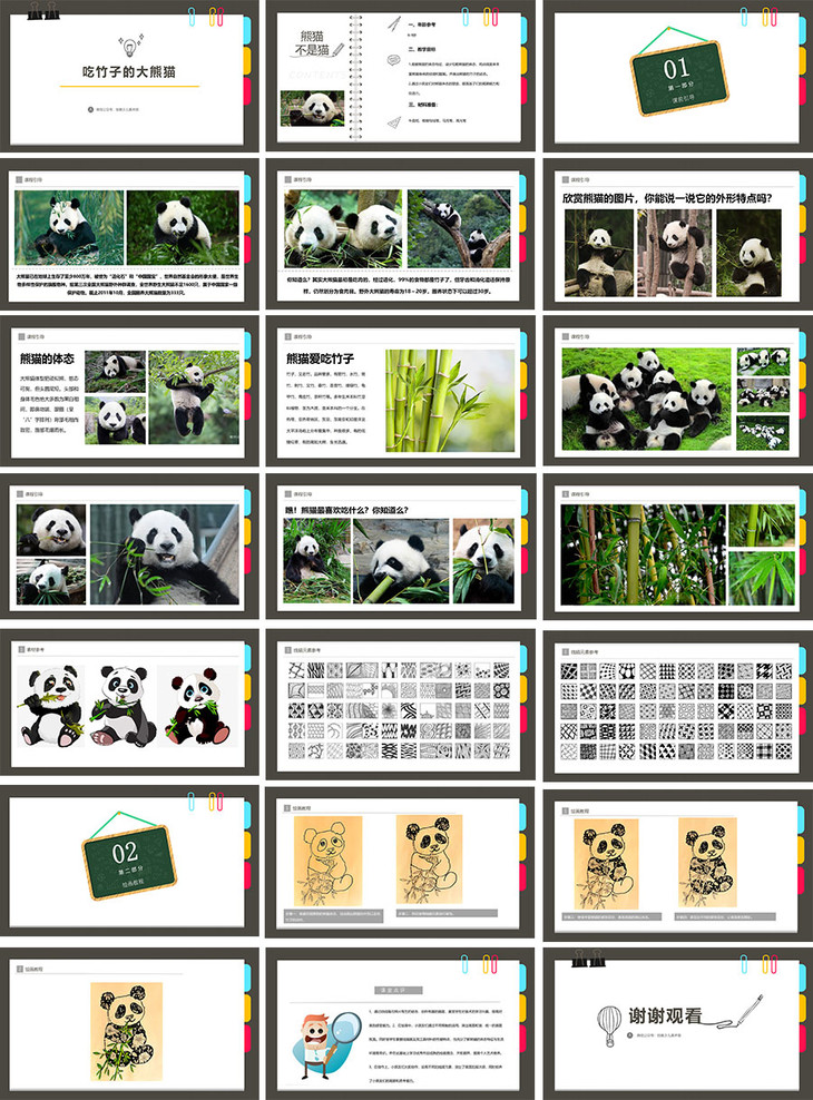 1.观察熊猫的体态特征,设计勾勒熊猫的体态,用点线面来丰富熊猫身体的纹理和图案。并画出熊猫吃竹子的动态。