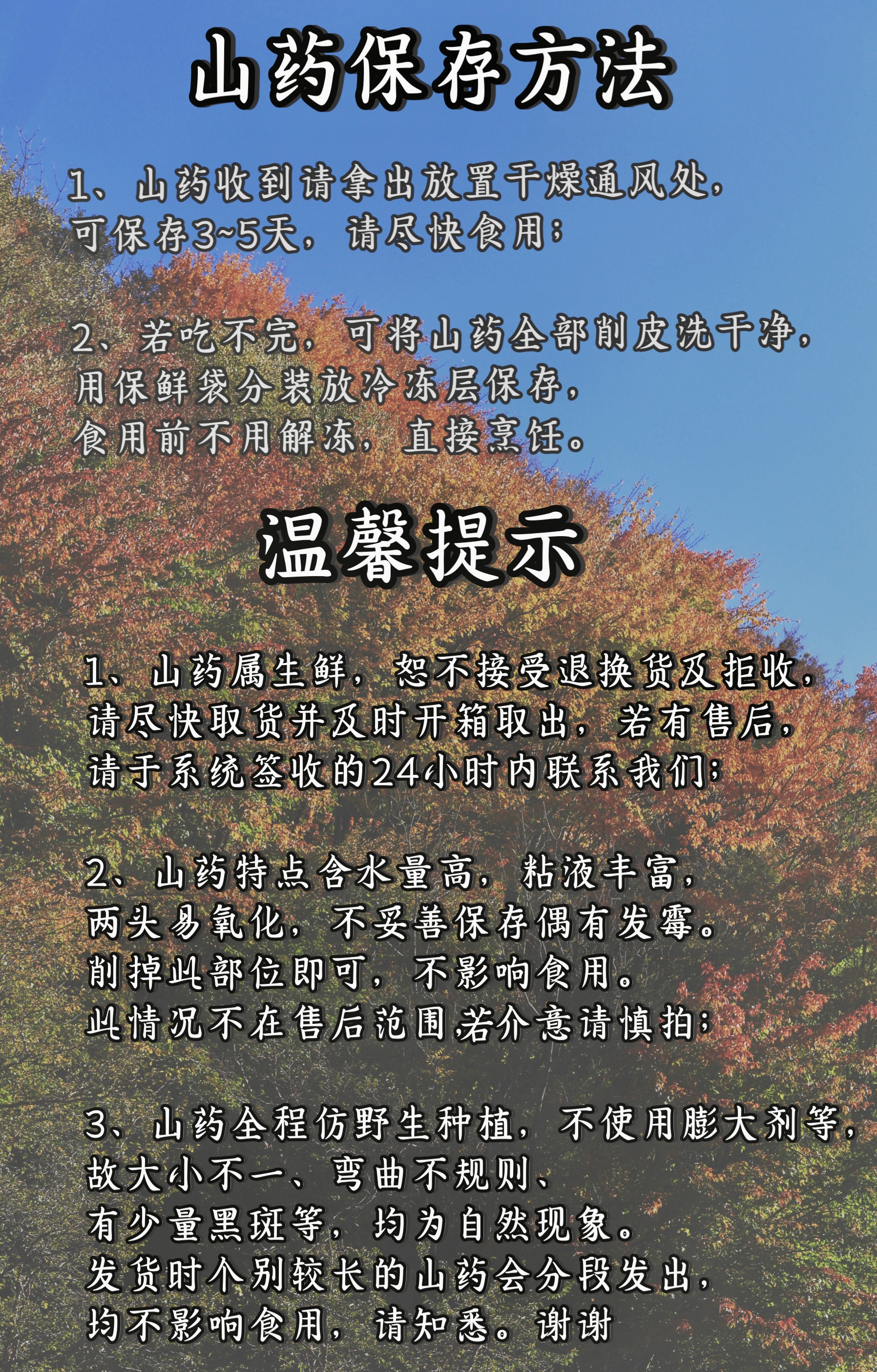 ② 山药发出前会切头切尾,在运输过程中两头会氧化或少许霉变,所以我们会在装箱时多出100g做为损耗,收到时切头切尾即刻清洗晾干水后放入急冻室,洗净后可不去皮,无需解冻直接上锅蒸食或放入己煮好的素高汤中焖几分钟即可,皮很薄,食用时轻轻撕下/直接带皮食用。如您介意请慎拍!