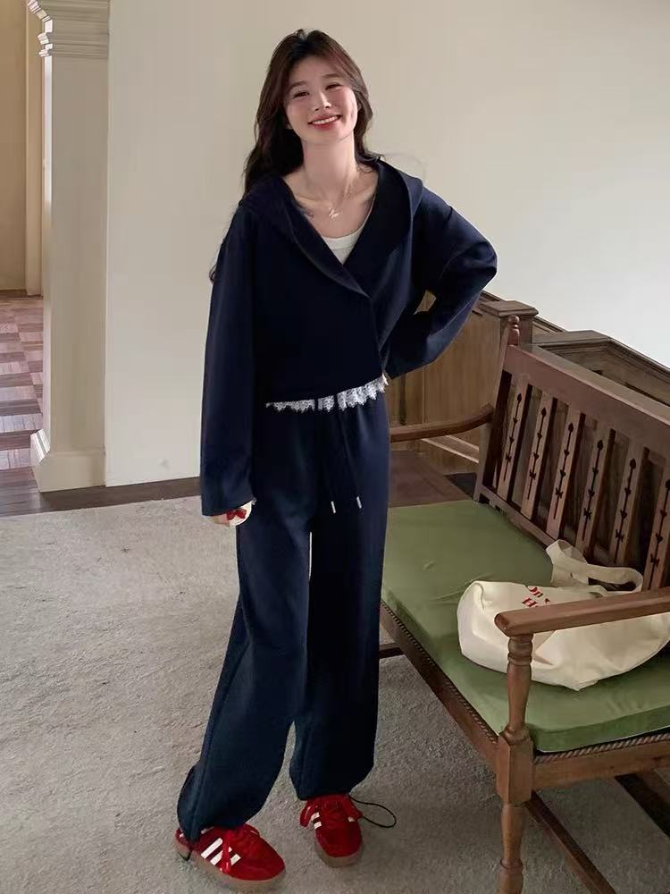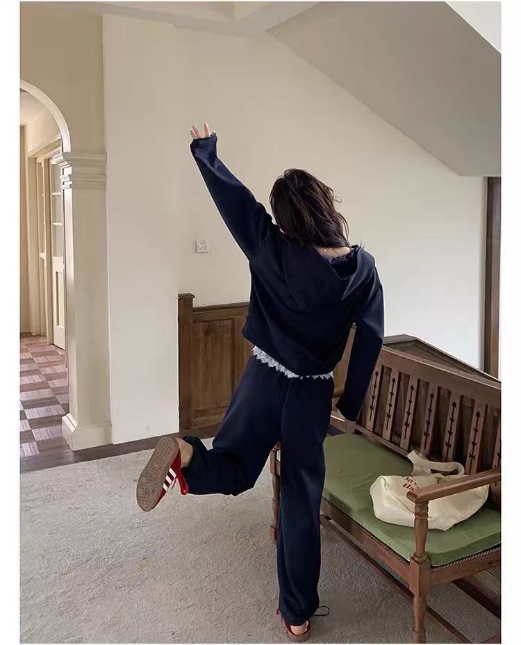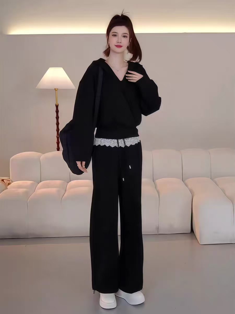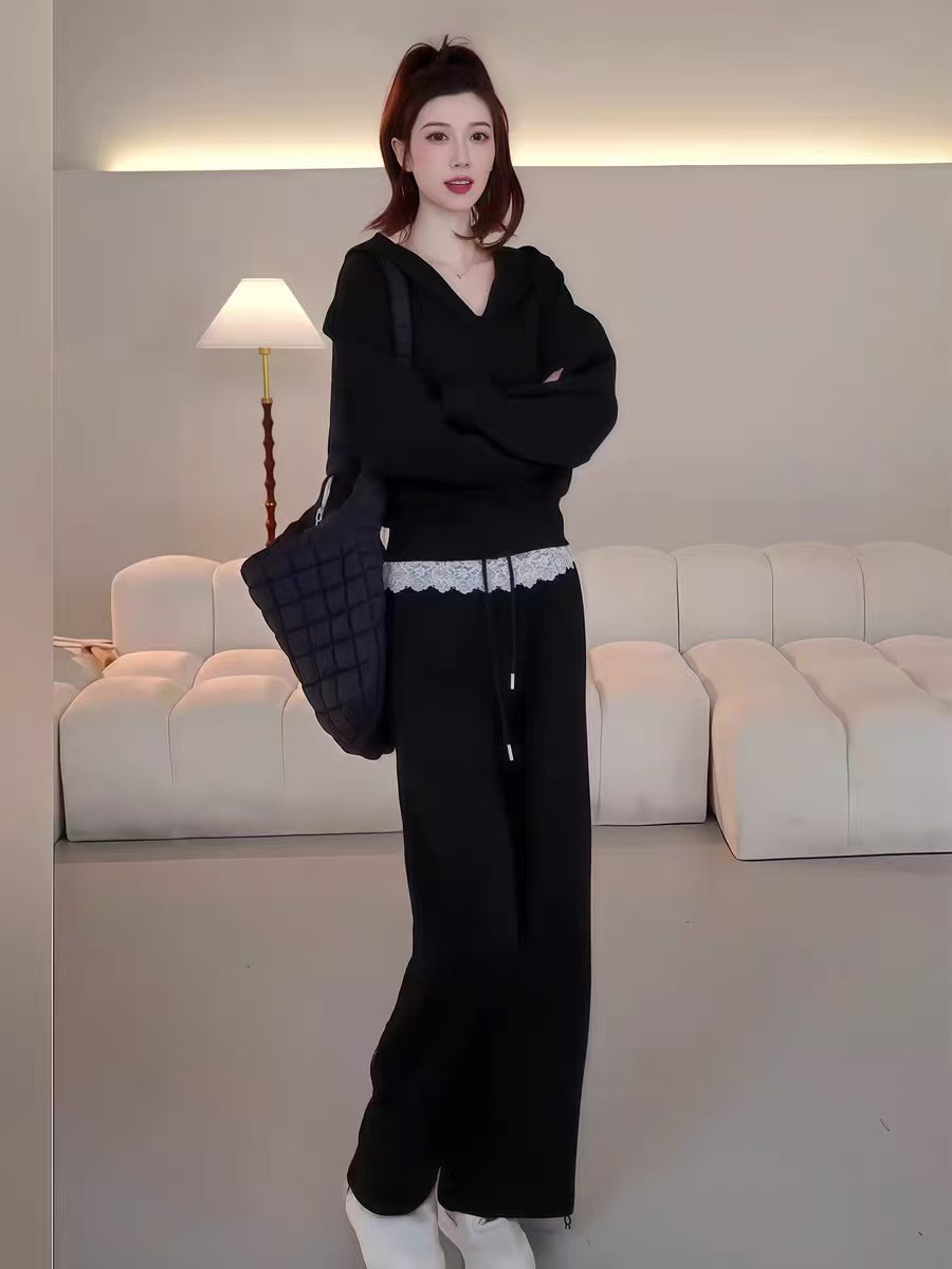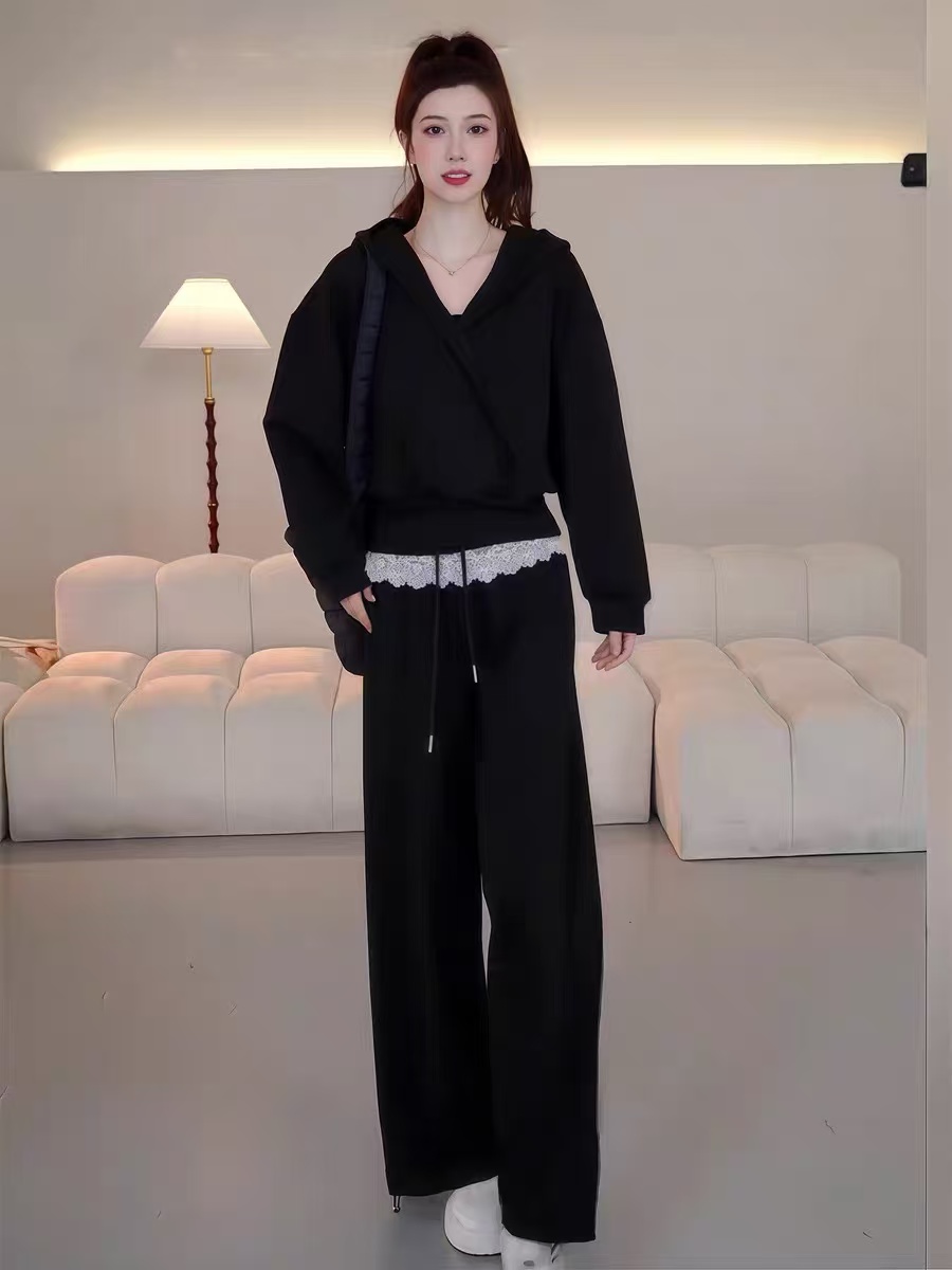 【秋上新】(套装)808黑色连帽上衣➕蕾丝边直筒裤两件套-喜出