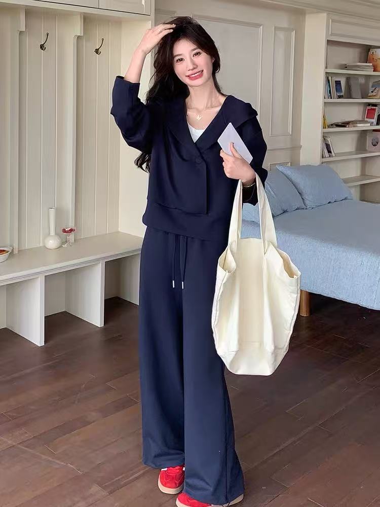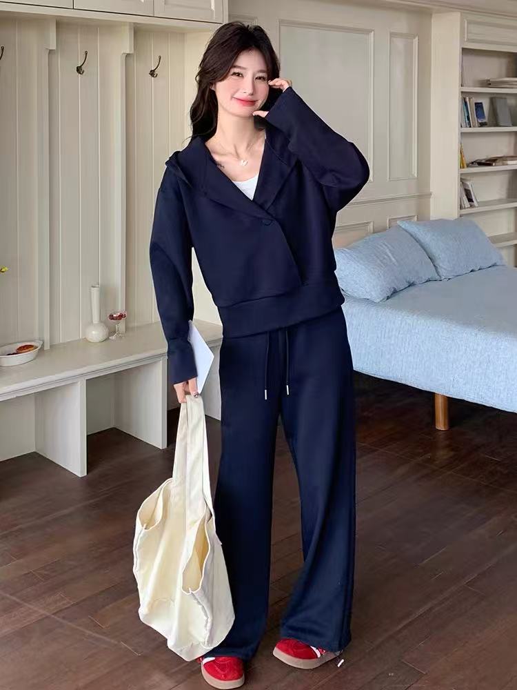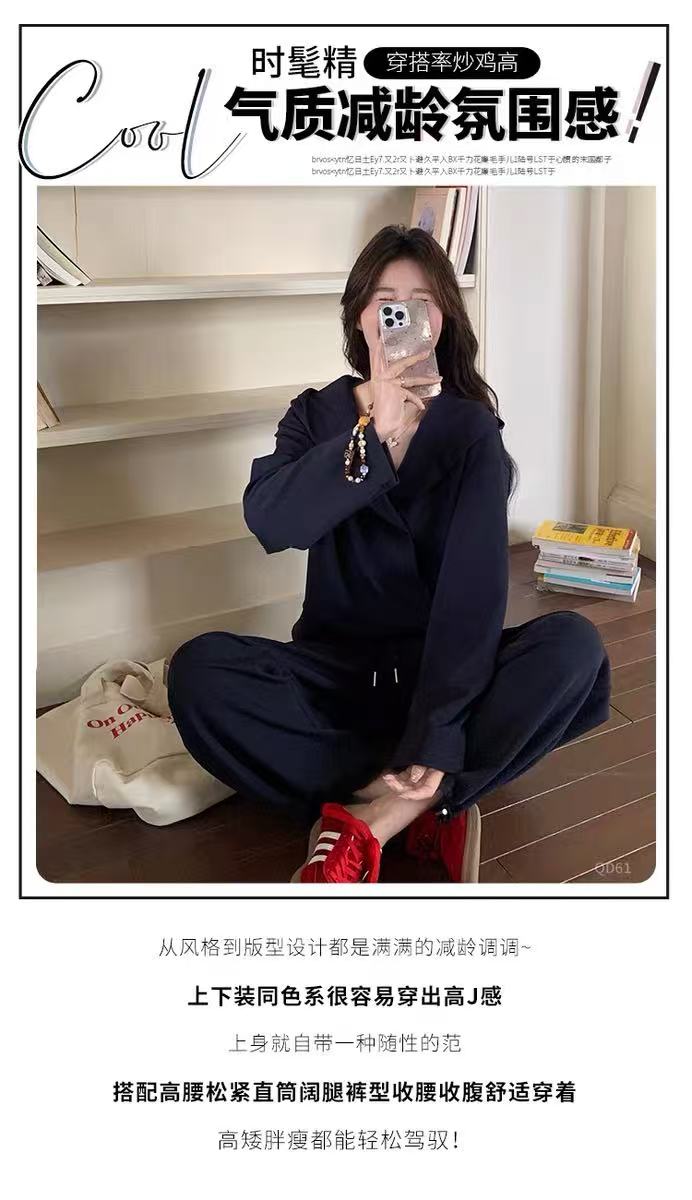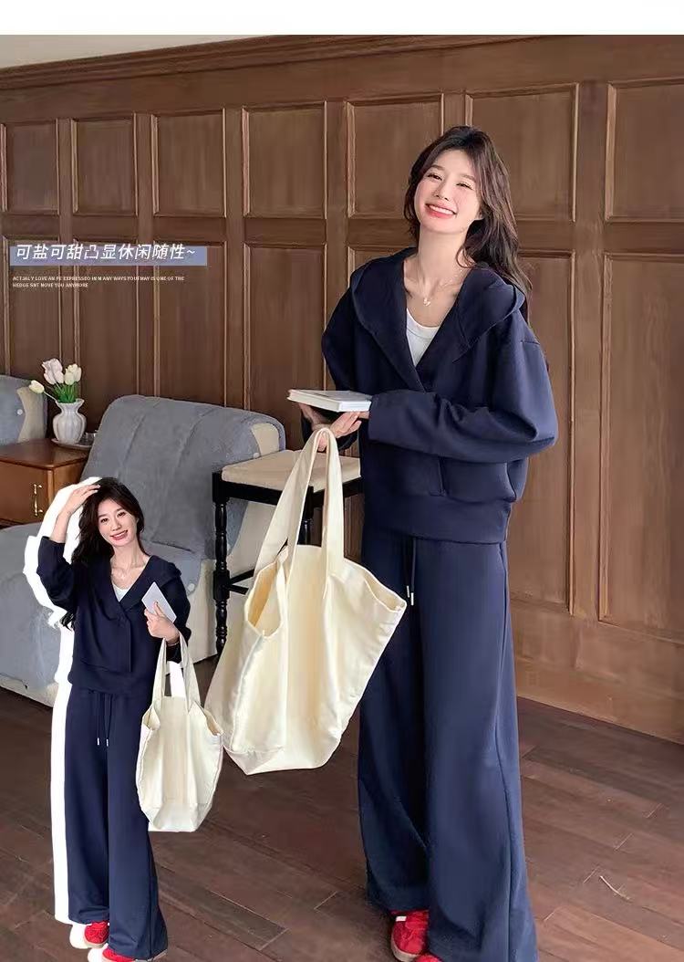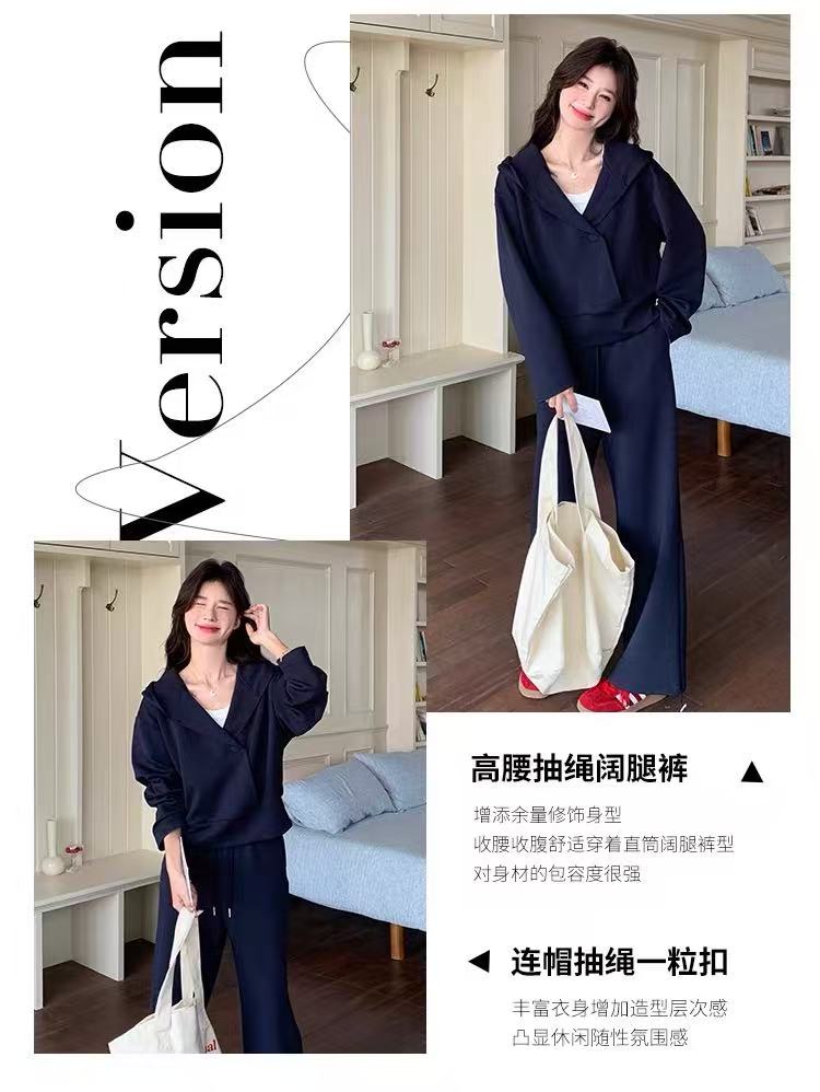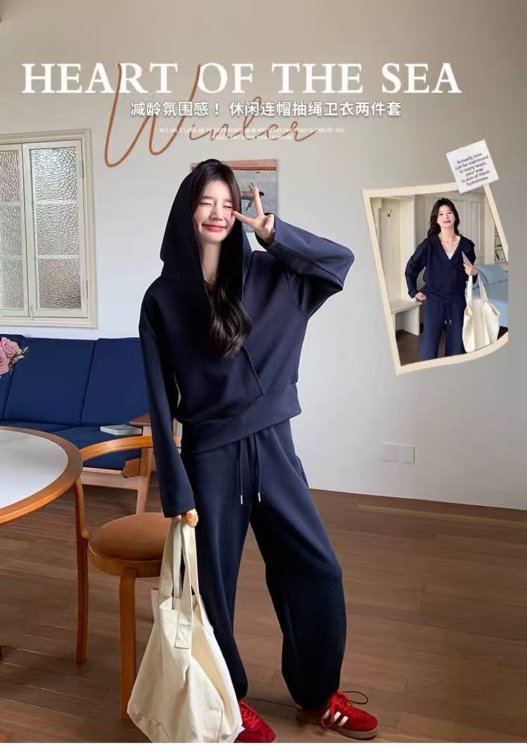 【秋上新】(套装)808黑色连帽上衣➕蕾丝边直筒裤两件套-喜出
