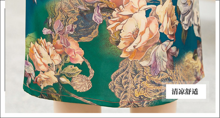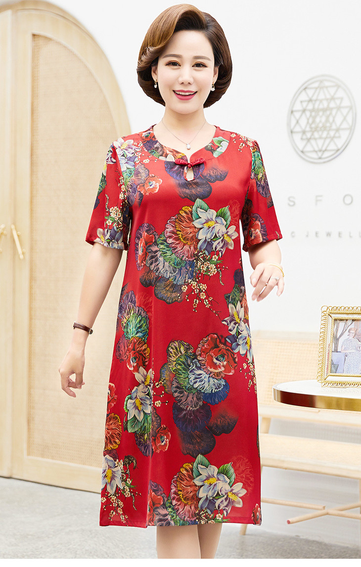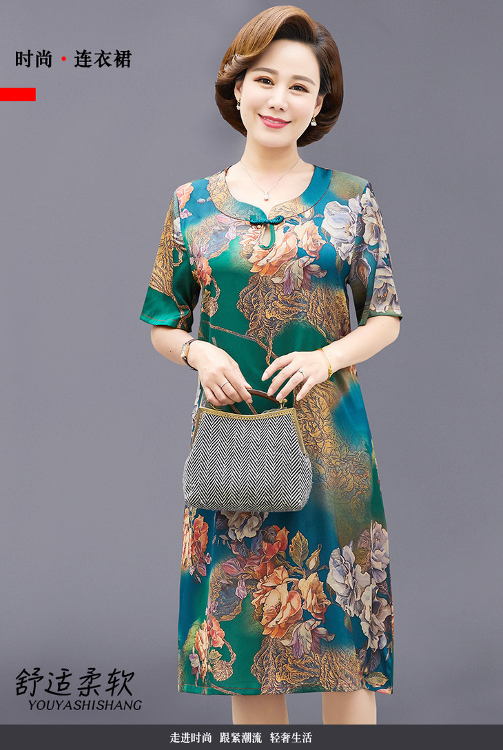 W-47785夏新款富贵洋气大码宽松短袖中长款丝缎连衣裙