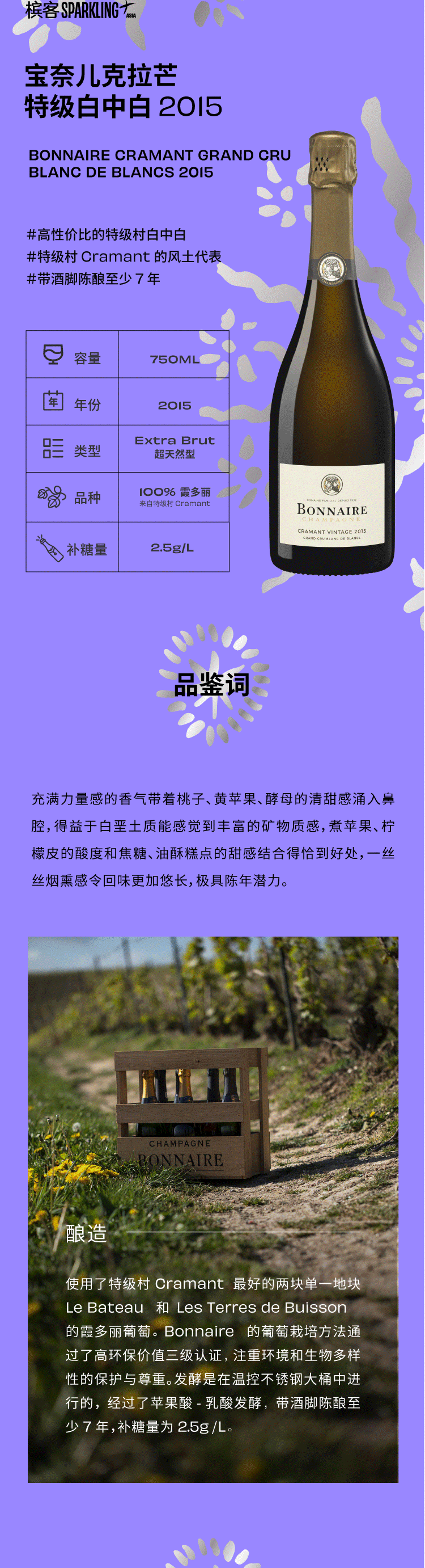 Bonnaire Cramant Grand Cru Blanc de Blancs 2016 宝奈儿克拉芒特级白中白 2016 750ml&1.5L