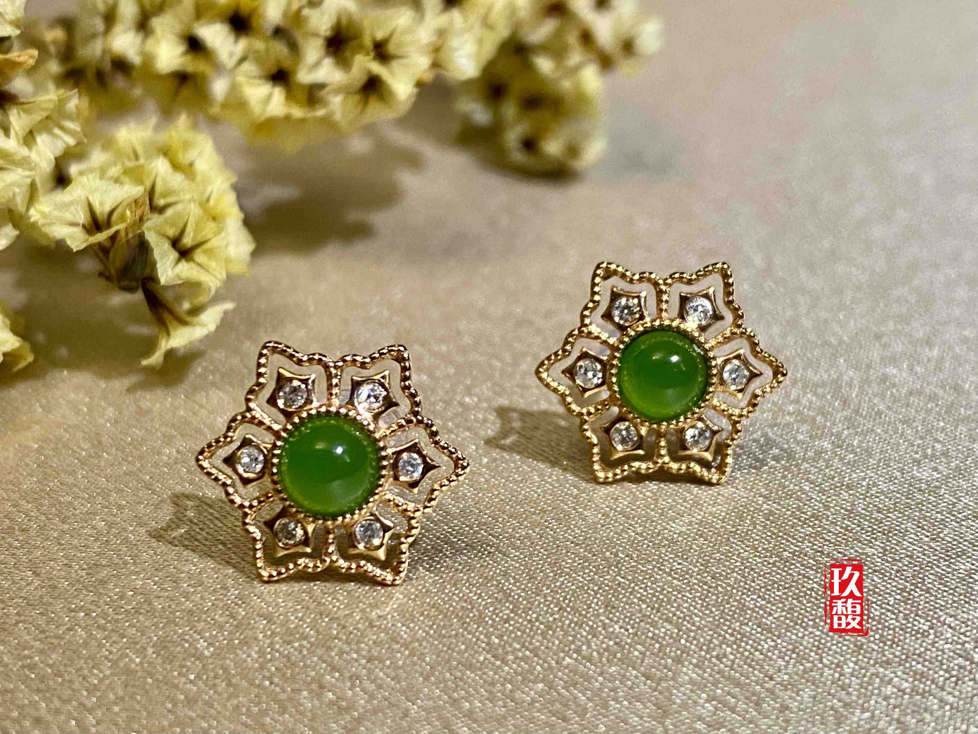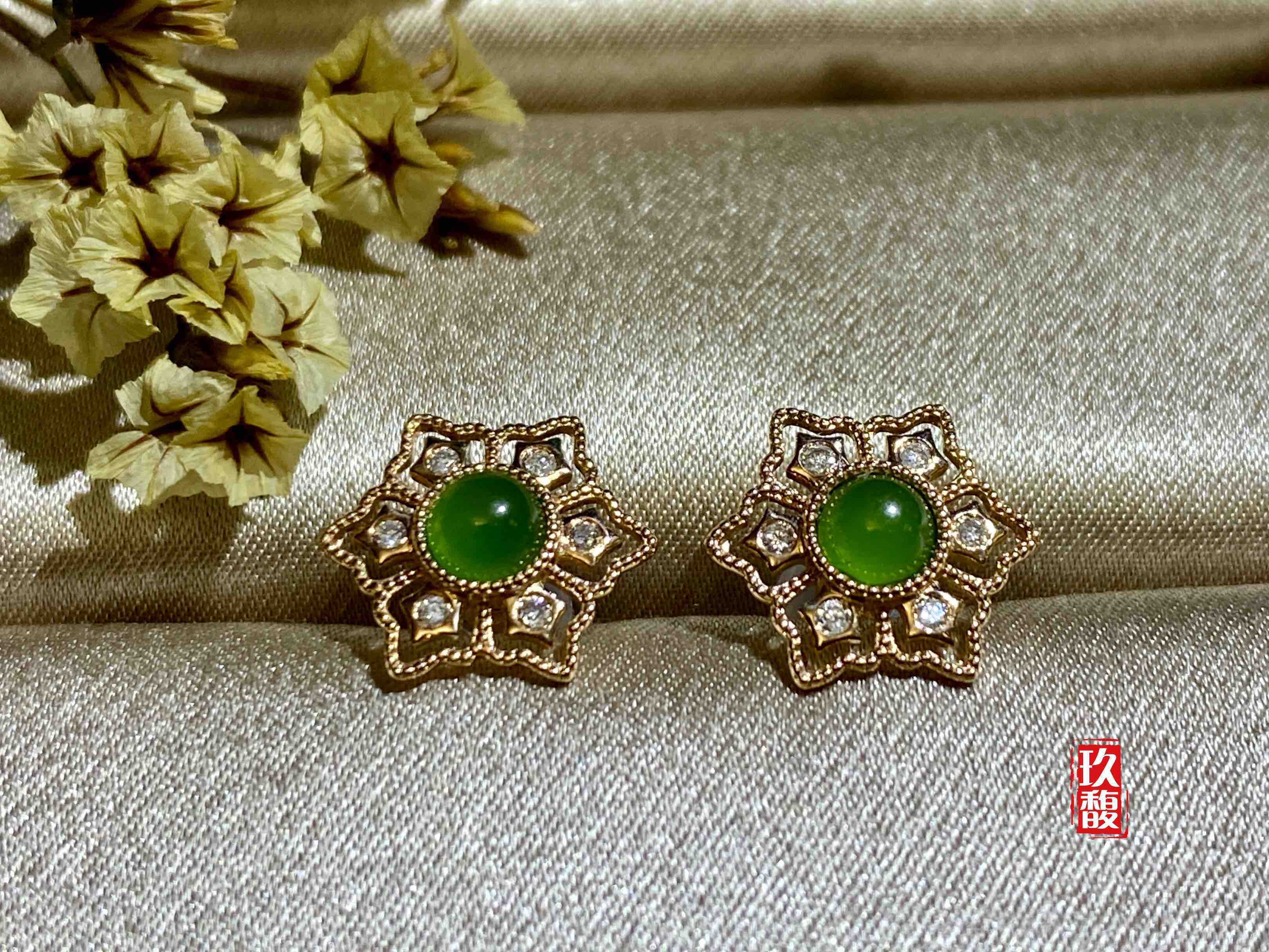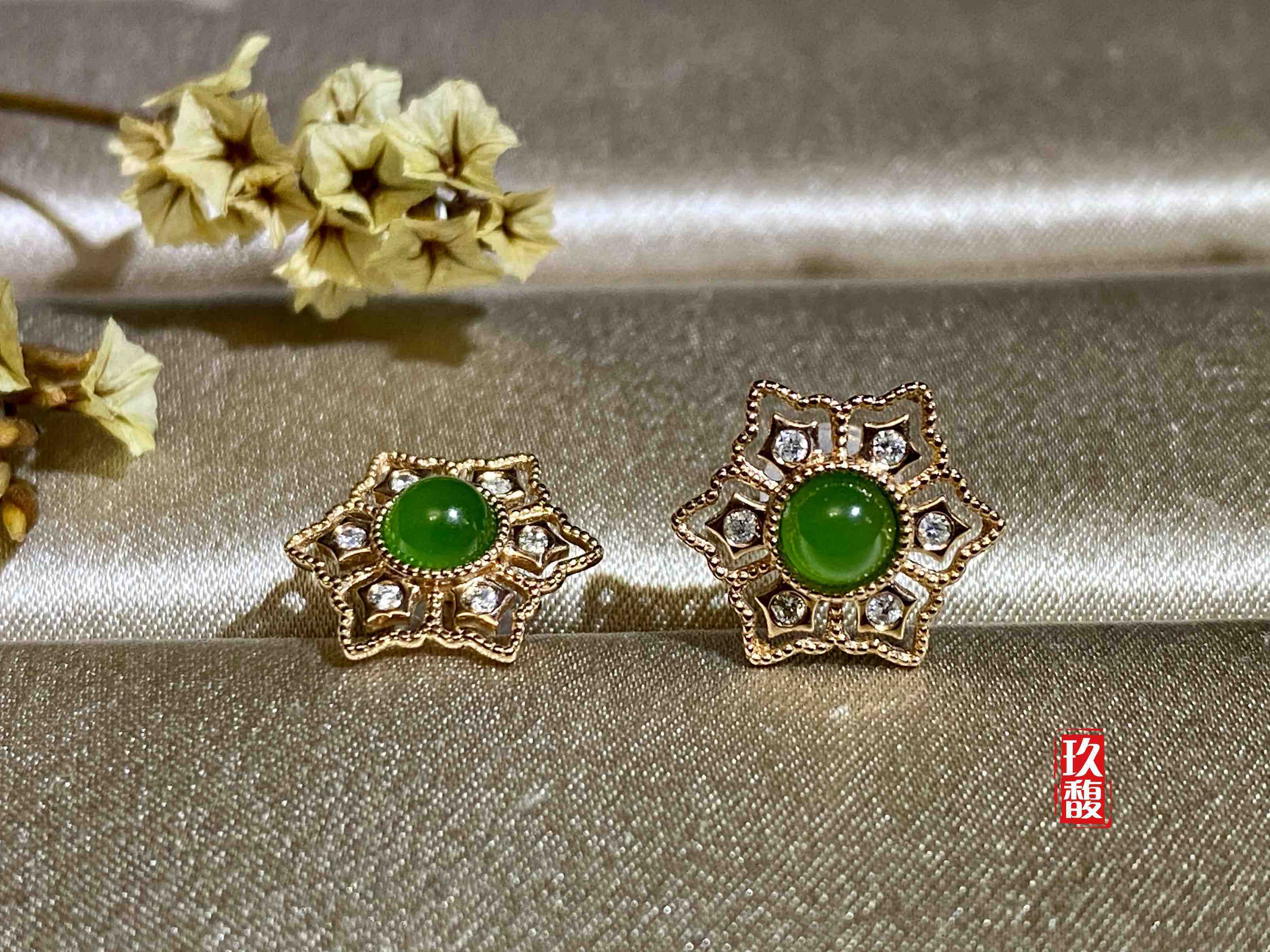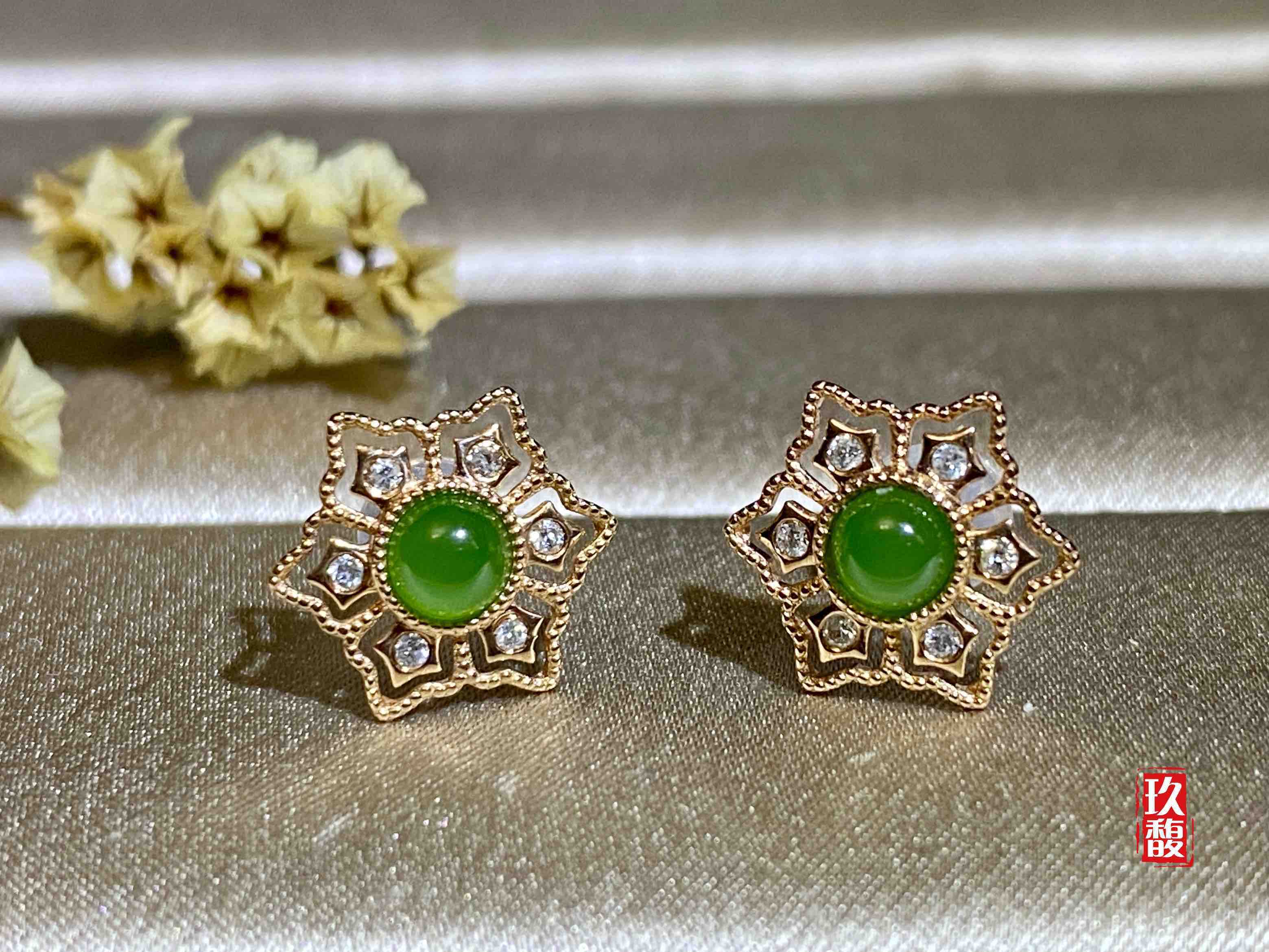 18K玫瑰金和田玉(碧玉)耳饰