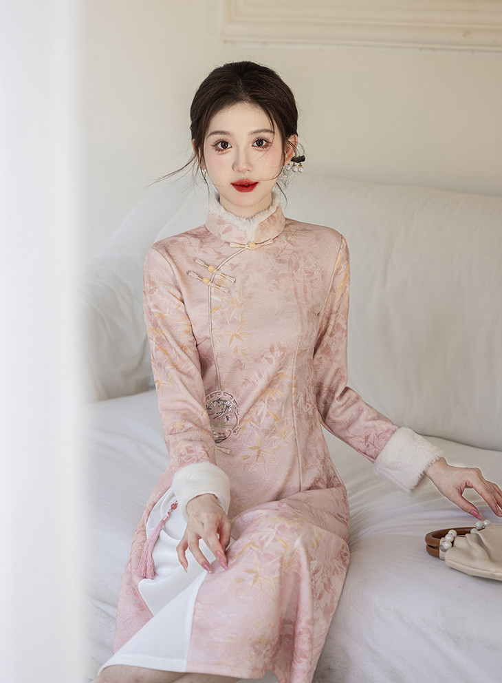 淑女范毛领奥黛旗袍2024年冬新款不开叉加绒保暖新中式旗袍TY2872 商品图0