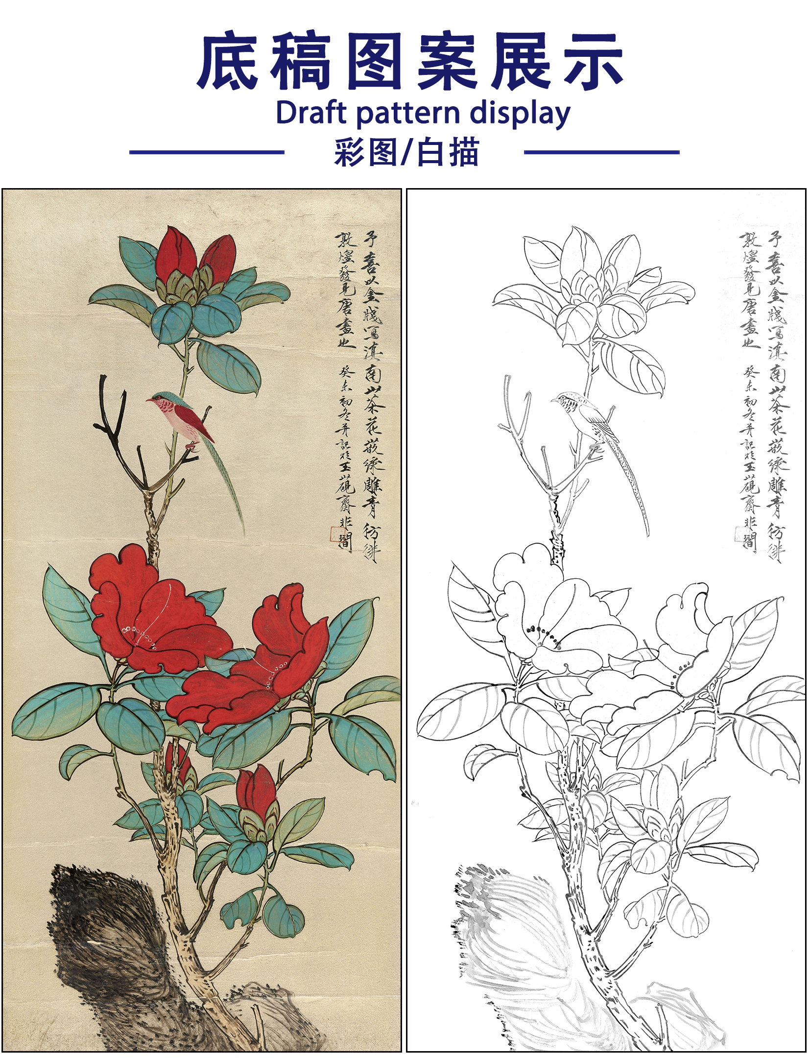 于非闇花鸟工笔画白描底稿《山茶小鸟》临摹勾线高清打印稿FA27