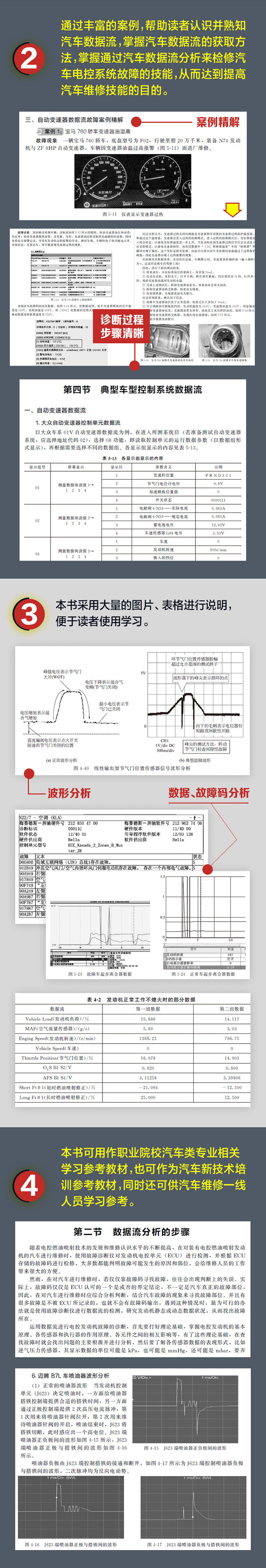 重点介绍了发动机及其他控制系统的数据流分析以及相关部件的波形分析,并列举了通过汽车数据流分析检修汽车故障的相应案例精解,可帮助读者提高汽车电控系统故障的检修技能。