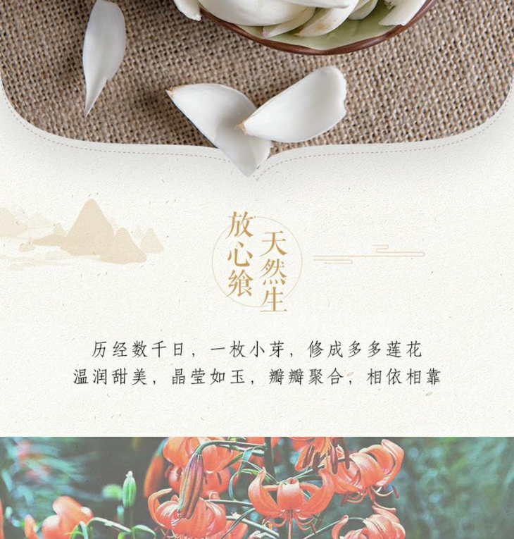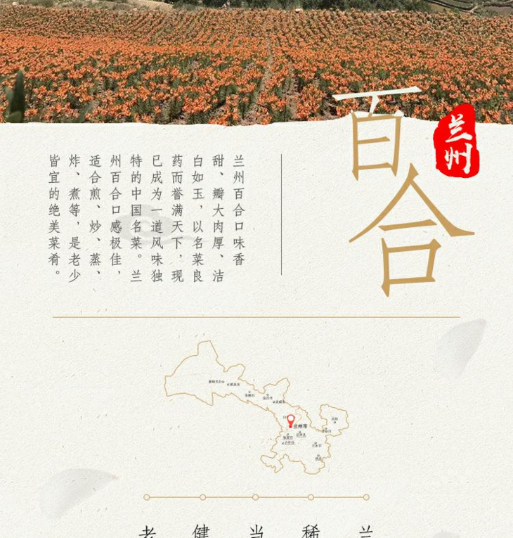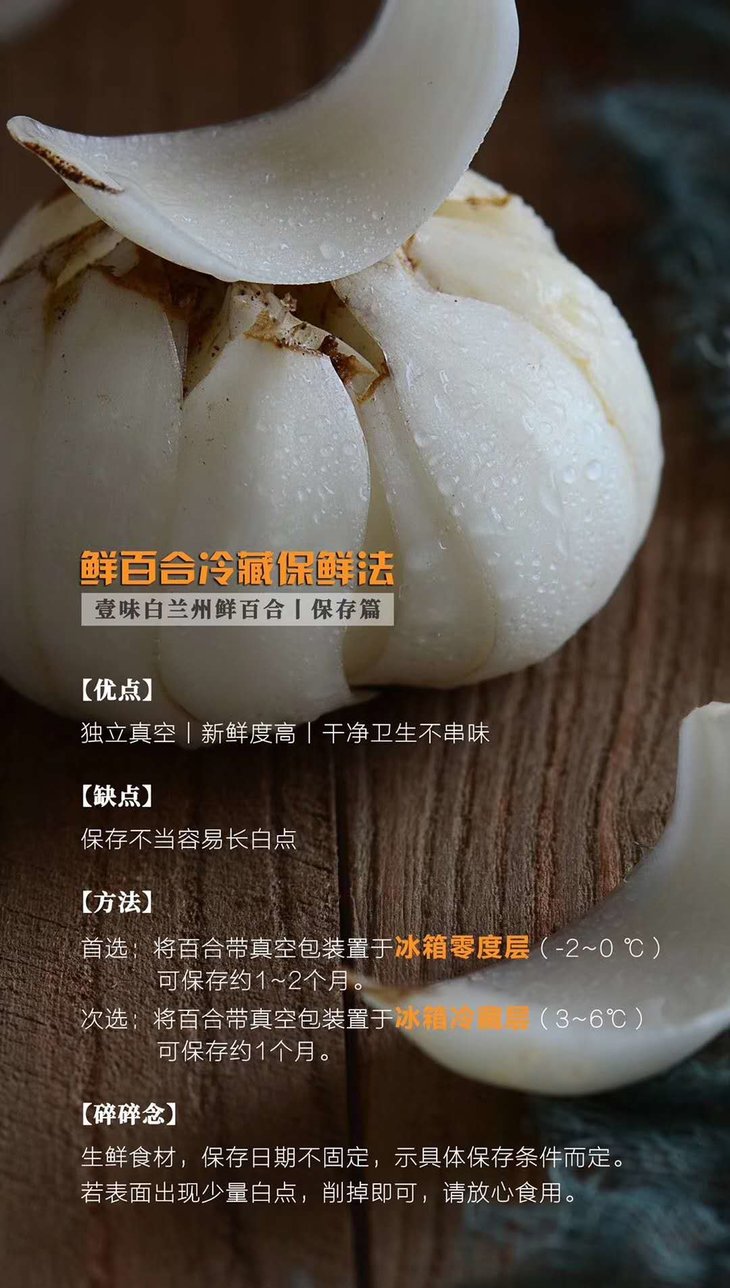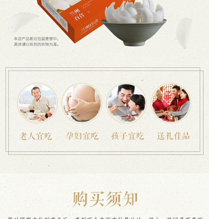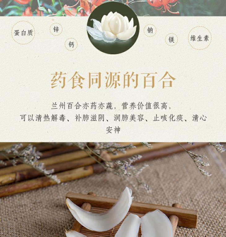 【售后标准】鲜百合是生鲜类农产品,它是土生土长的,直接与泥土接触。您收到的百合会带有少量的泥土,百合瓣尖有枯黄的边,是百合开花后,花茎留下的,百合瓣上也会有锈斑,这是百合的特性,不是百合坏了,请您放心食用。